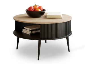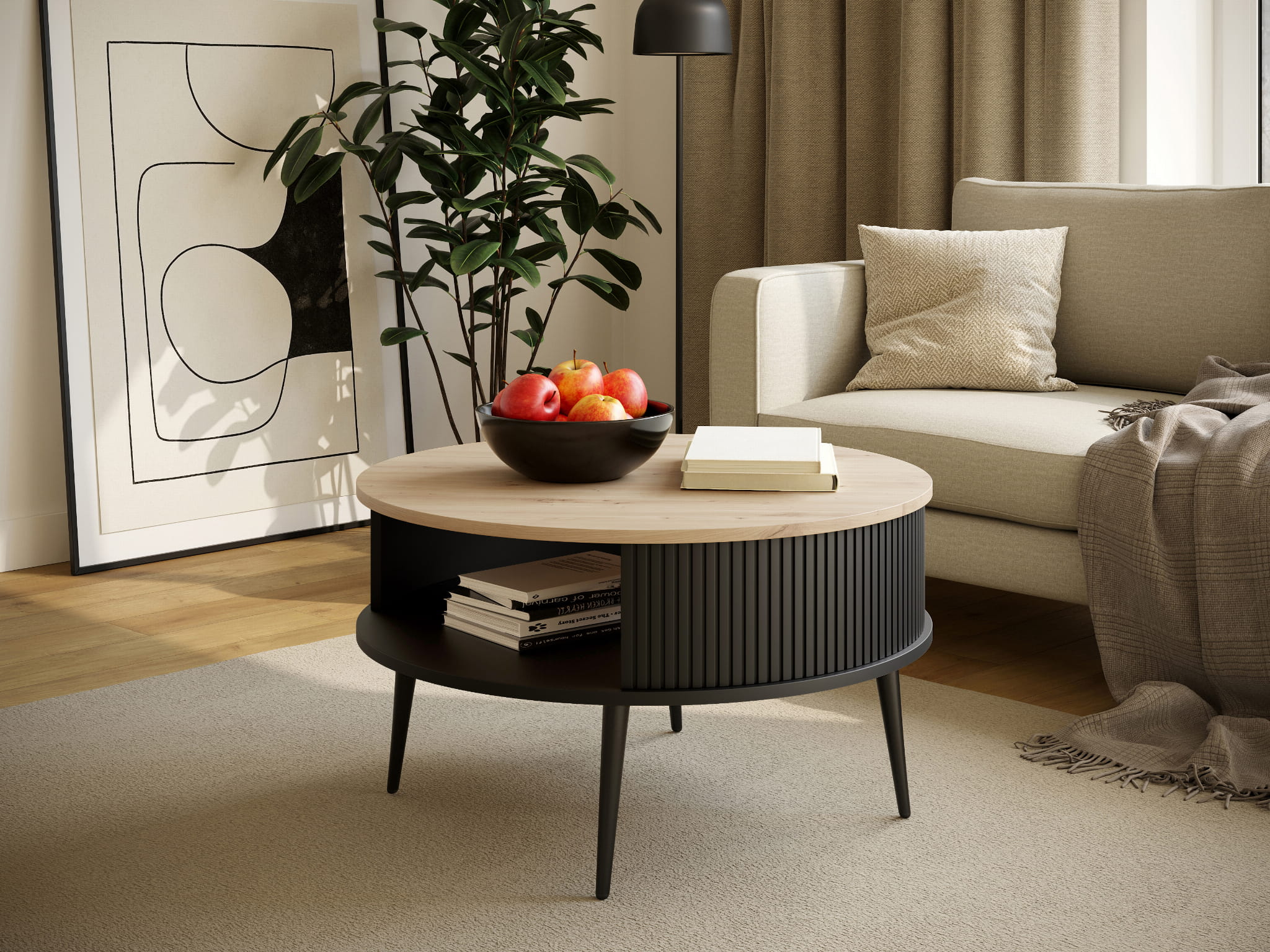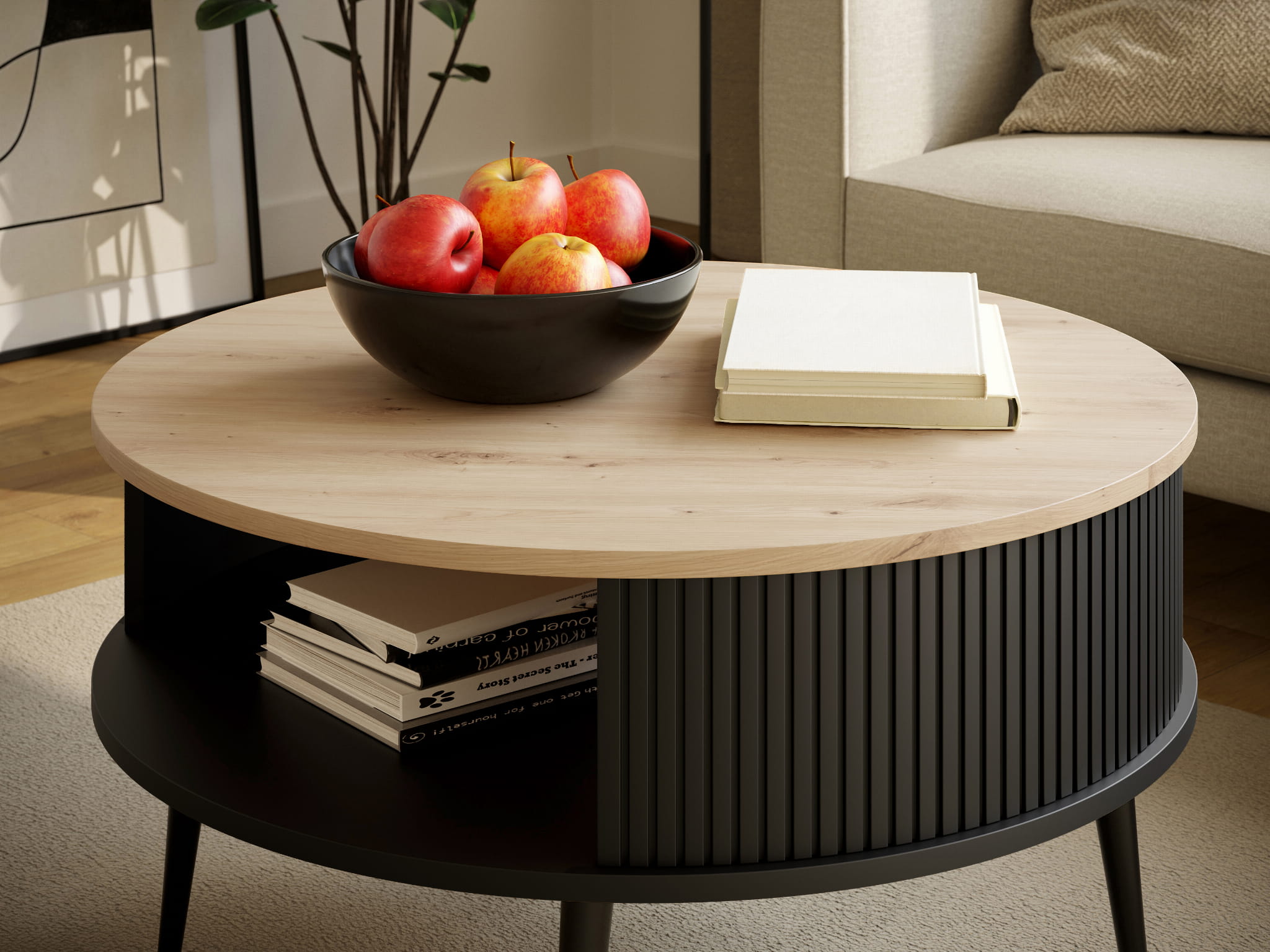 Stolik kawowy Mizo – blat w kolorze dąb artisan, czarne ryfle i nogi. Okrągła forma z dodatkową półką łączy elegancję i praktyczność w jednym meblu.