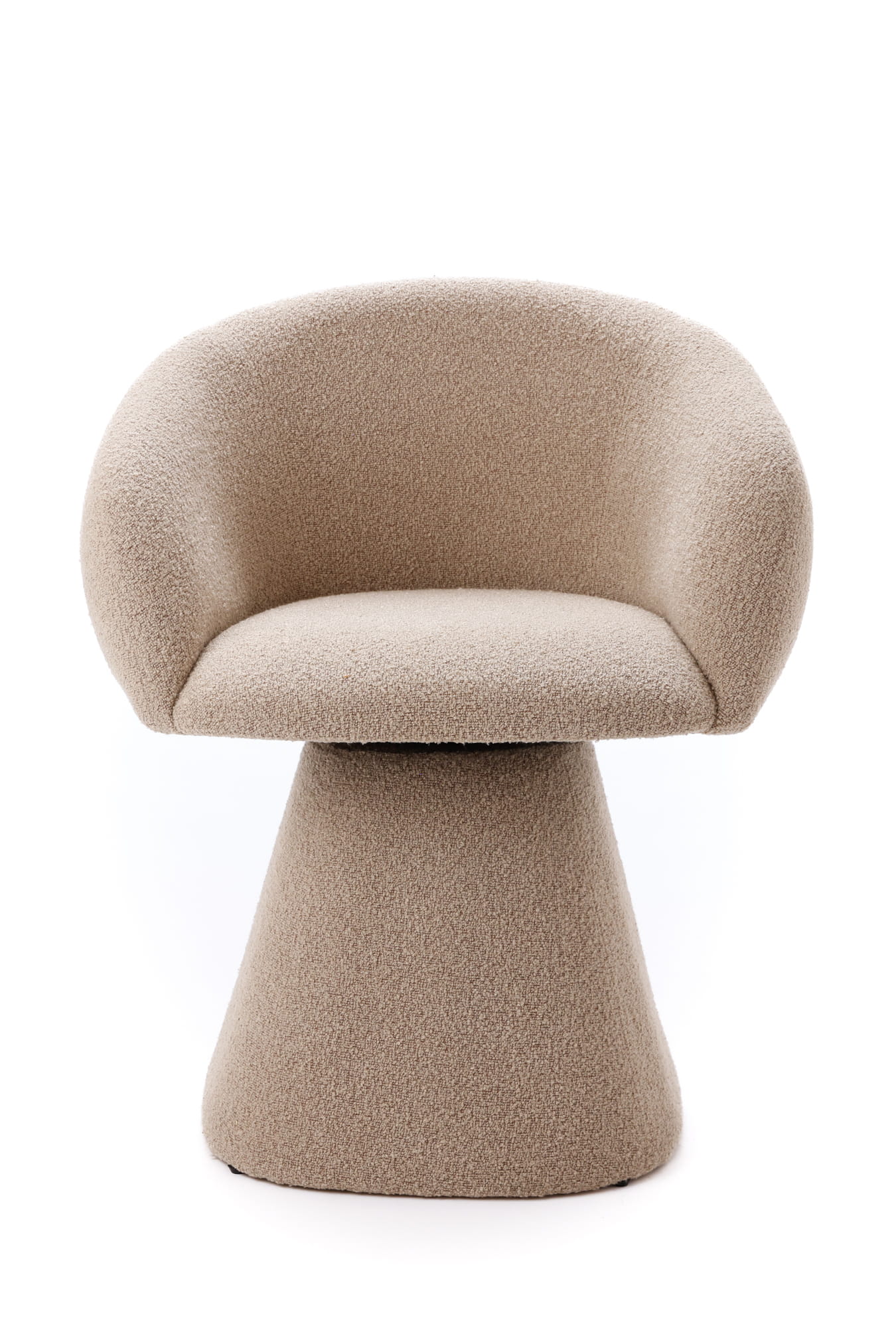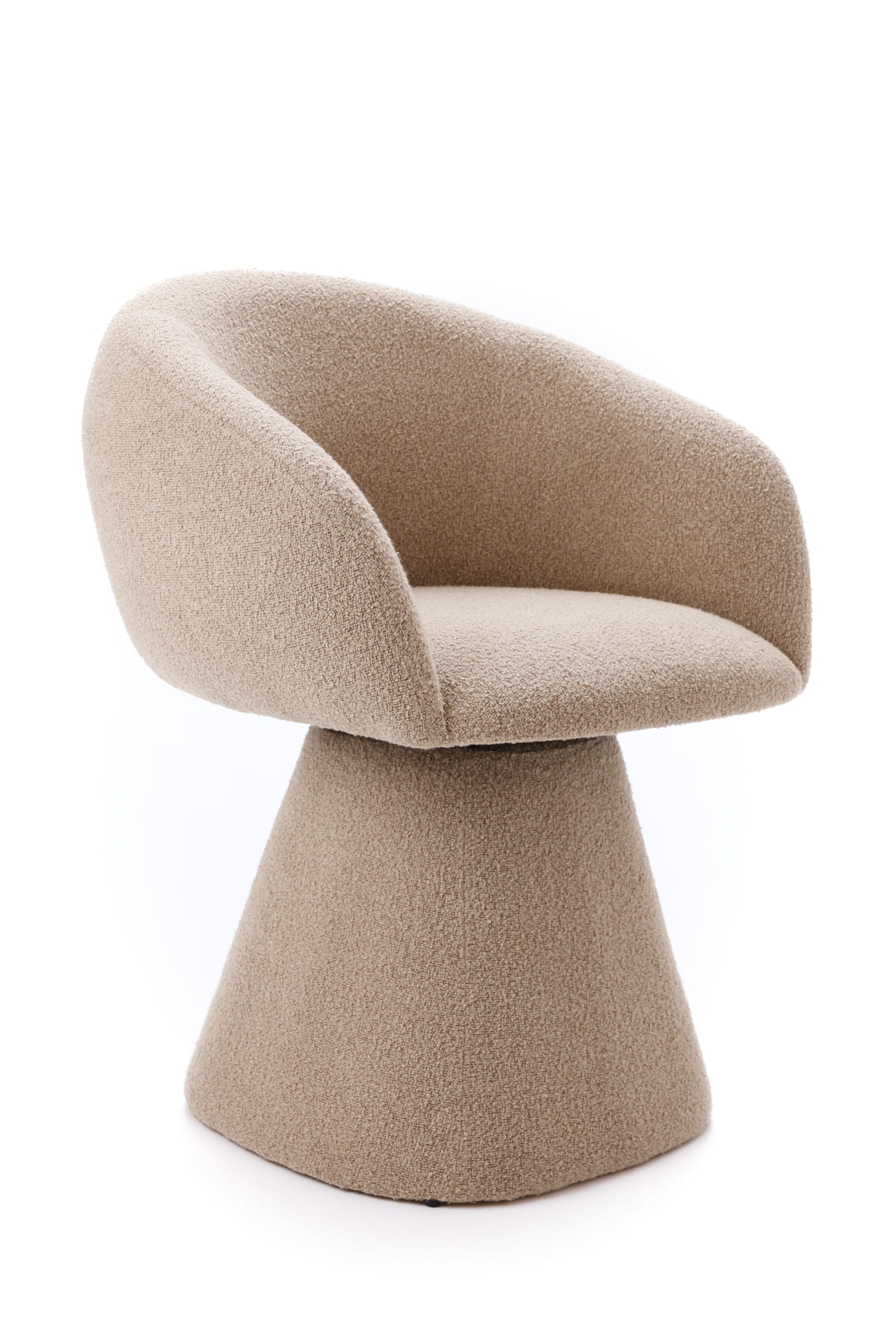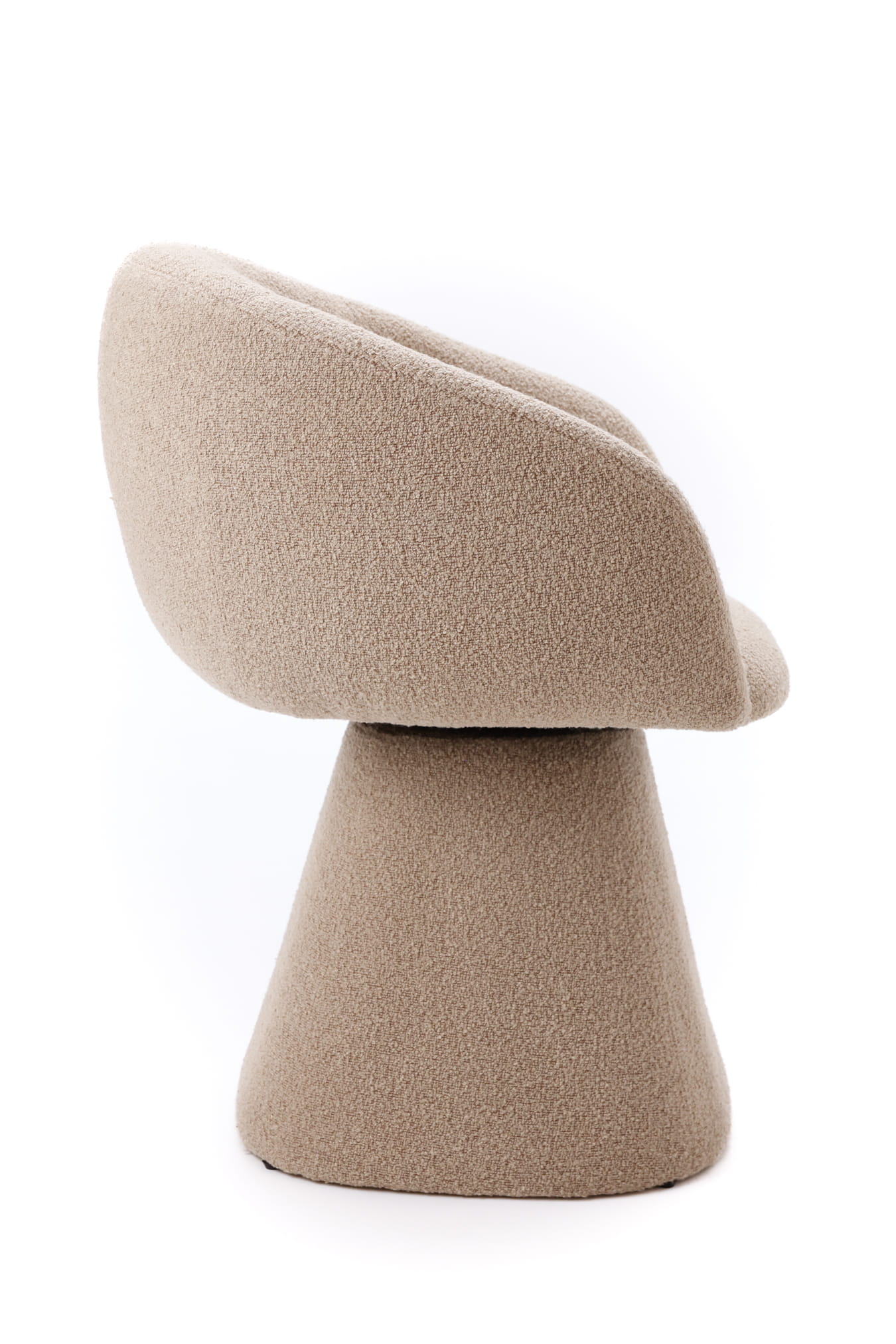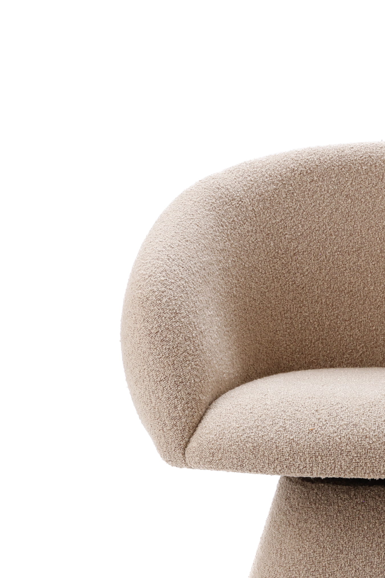 Fotel Kai w kolorze khaki piaskowy to połączenie nowoczesnej formy z naturalną, stonowaną kolorystyką. Miękka tkanina bouclé i funkcja obrotu zapewniają komfort, a spokojny odcień khaki wprowadza do wnętrza harmonię i ciepło.