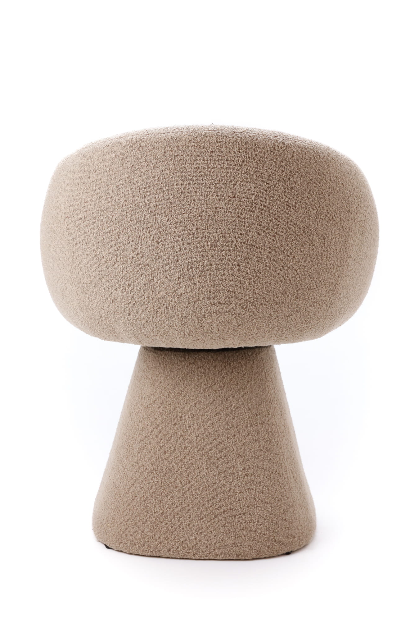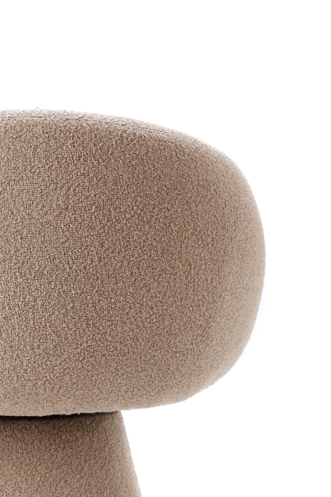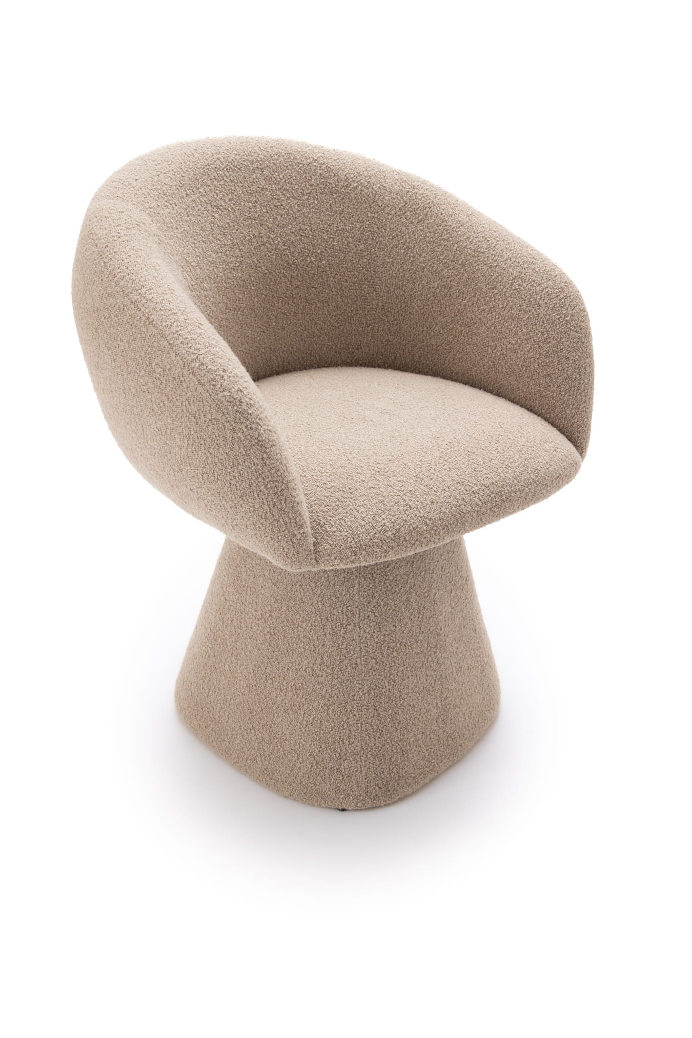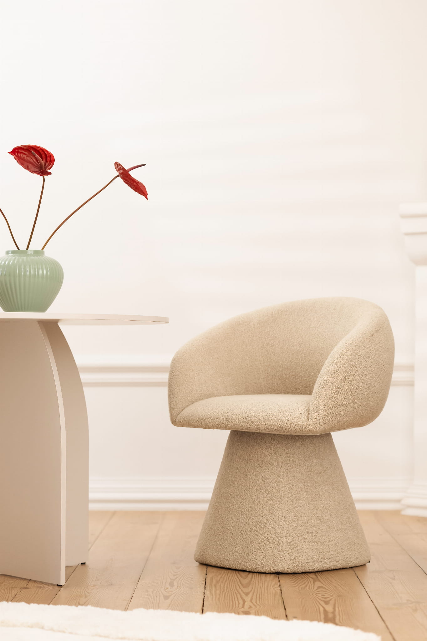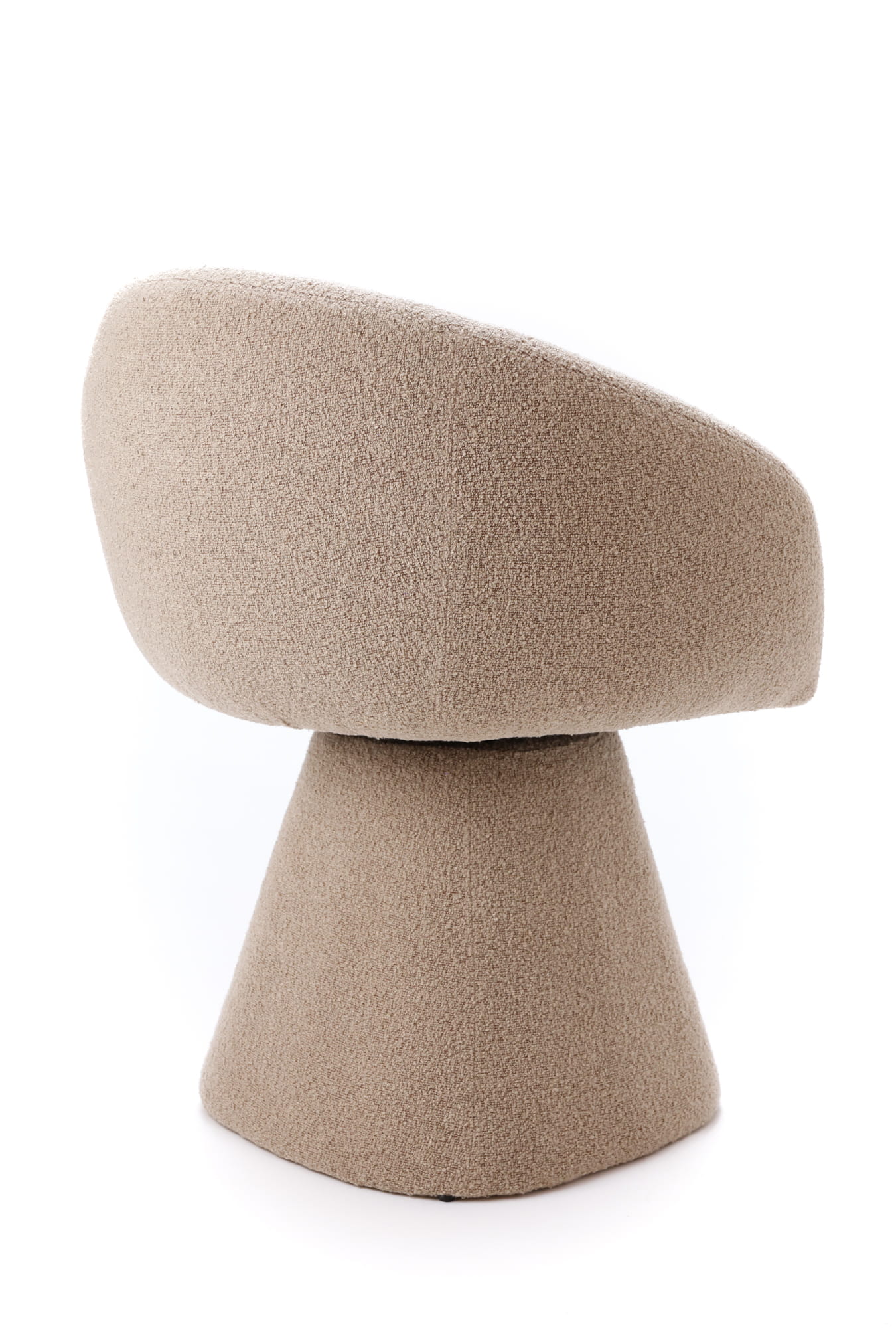 Fotel Kai w kolorze khaki piaskowy to połączenie nowoczesnej formy z naturalną, stonowaną kolorystyką. Miękka tkanina bouclé i funkcja obrotu zapewniają komfort, a spokojny odcień khaki wprowadza do wnętrza harmonię i ciepło.