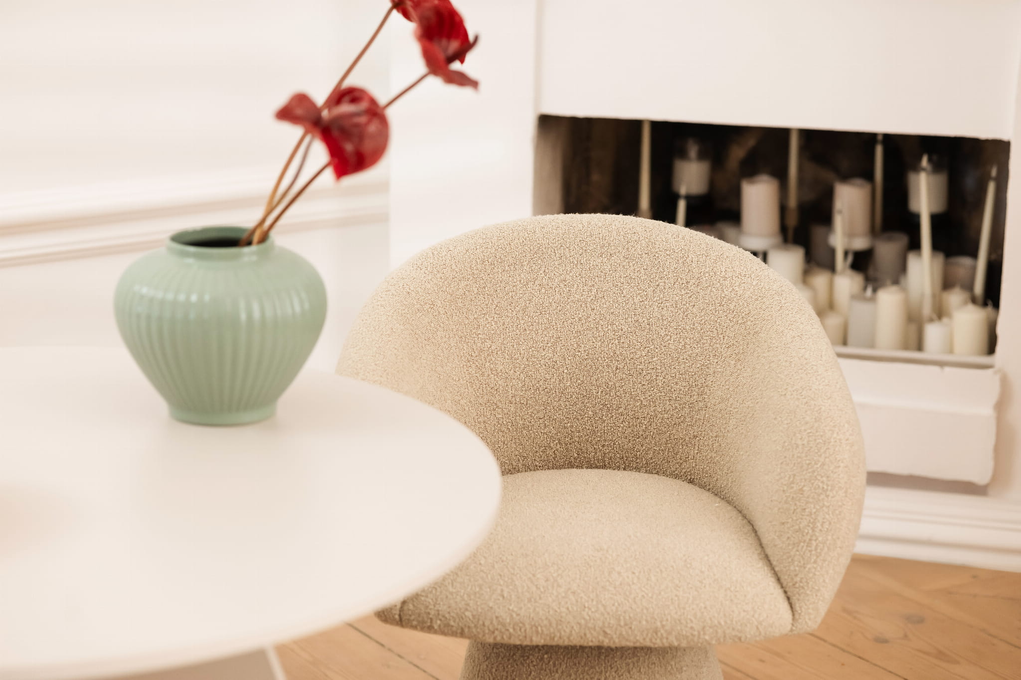 Fotel obrotowy Kai w wersji khaki piaskowy został stworzony z myślą o wnętrzach, które czerpią inspirację z natury i współczesnego designu. Jego zaoblona, rzeźbiarska forma subtelnie przyciąga uwagę, jednocześnie zachowując lekkość i ponadczasowy charakter. To mebel, który nie dominuje przestrzeni, lecz naturalnie się w nią wpisuje.