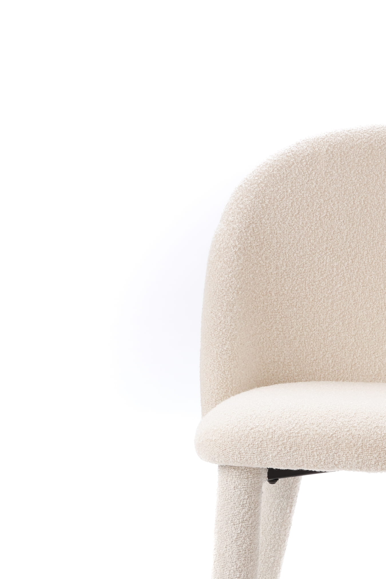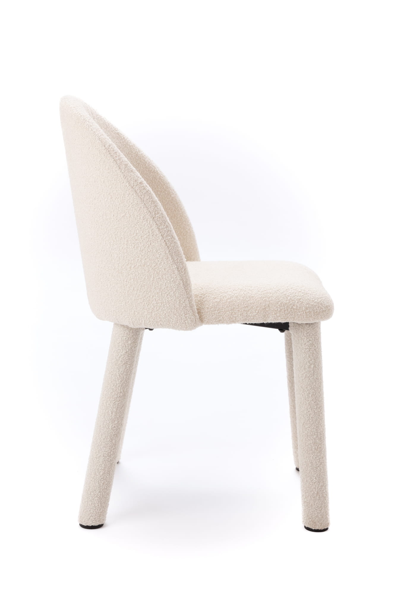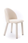 Biała tkanina bouclé dodaje wnętrzu świeżości i harmonii. Jej delikatna faktura pięknie rozprasza światło, dzięki czemu krzesło dobrze odnajduje się zarówno w jasnych, minimalistycznych aranżacjach, jak i w bardziej przytulnych przestrzeniach inspirowanych stylem japandi czy soft modern. Smukła sylwetka oraz ergonomiczne proporcje zapewniają wygodę podczas codziennych posiłków, spotkań przy stole czy długich rozmów przy kawie.