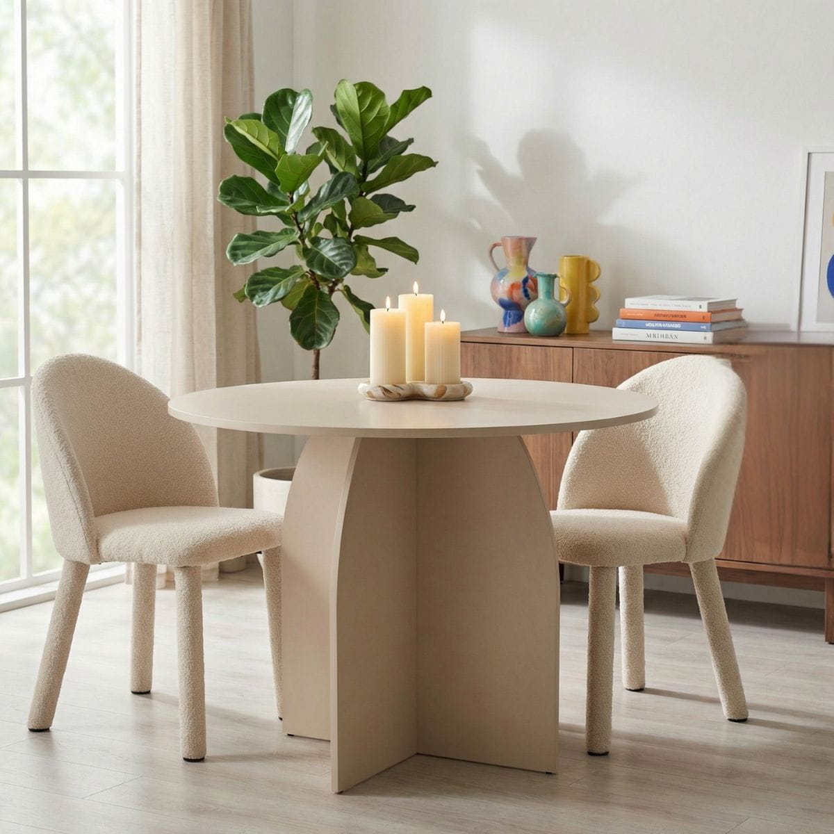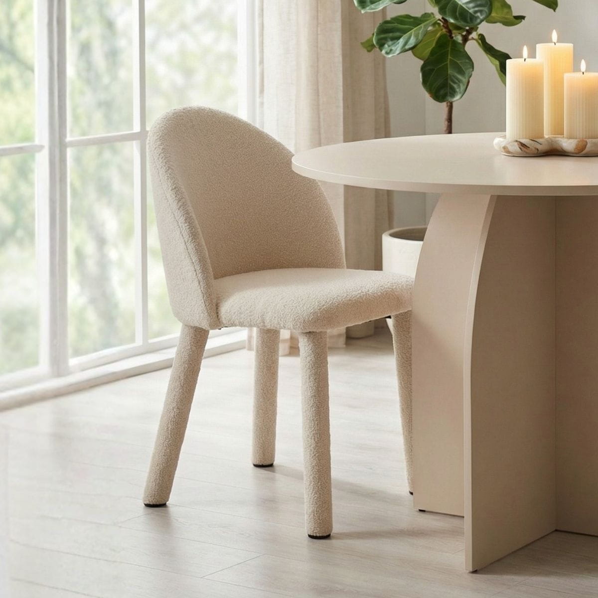 Krzesło Kawaī Bouclé to połączenie miękkiej formy i nowoczesnej elegancji. Tapicerowane tkaniną bouclé w białym odcieniu wprowadza do wnętrza lekkość i przytulność. Idealne do jadalni, kuchni i nowoczesnych przestrzeni.
