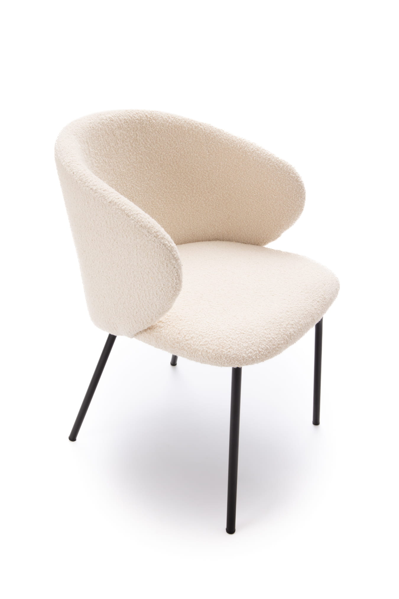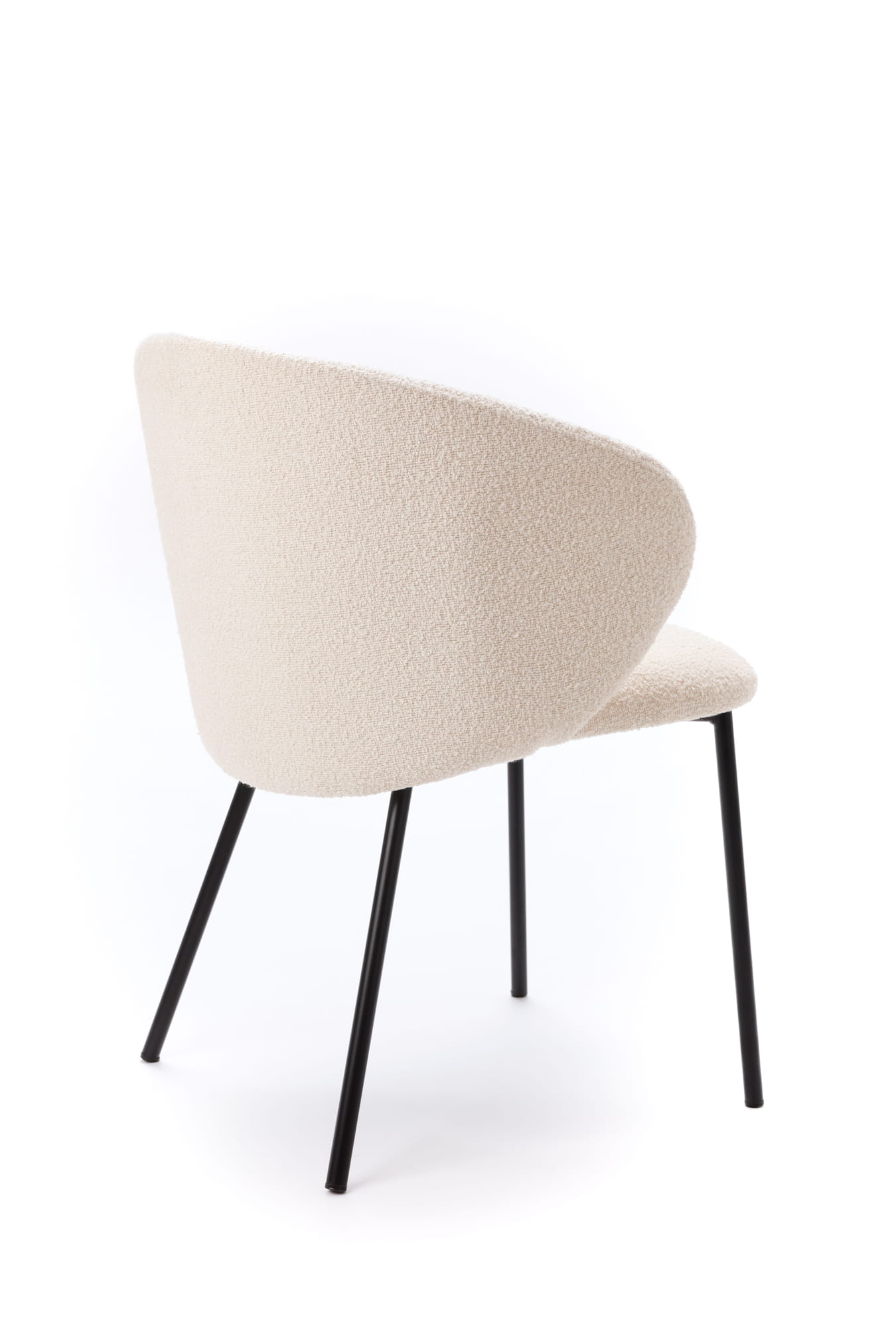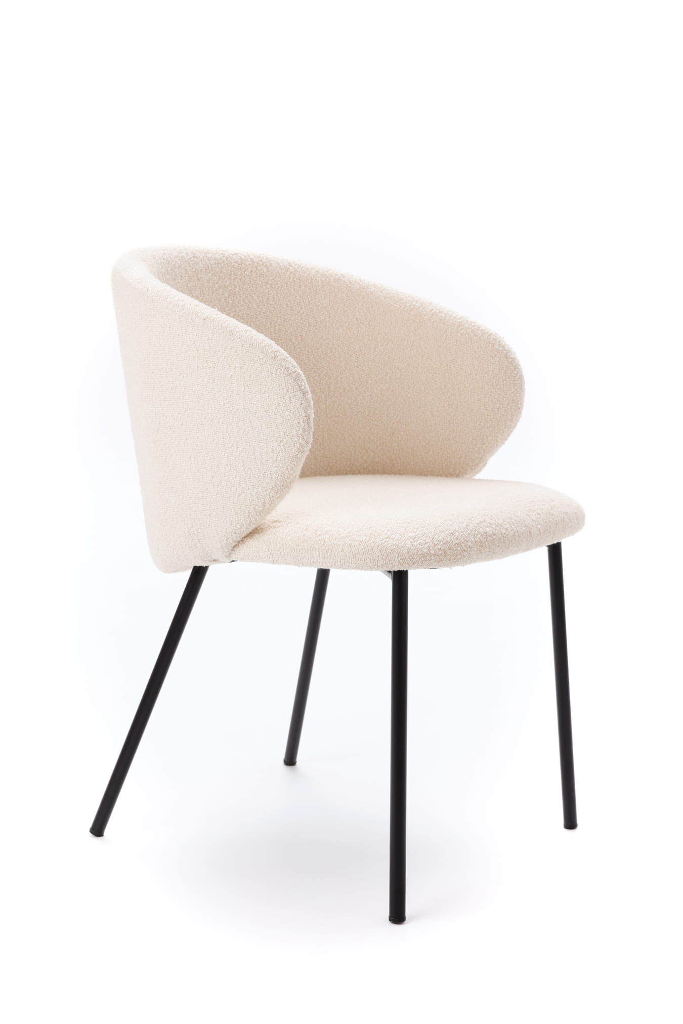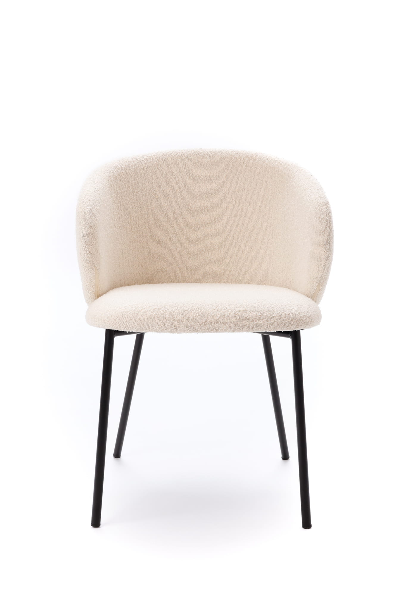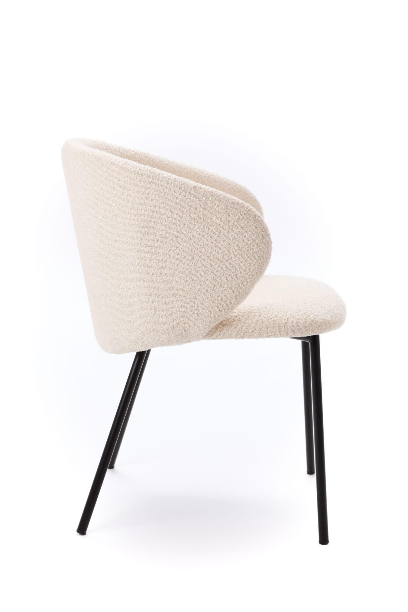 Krzesło Kukkī Bouclé w wersji biało-czarnej to propozycja dla miłośników nowoczesnego designu z charakterem. Subtelna tkanina bouclé w odcieniu bieli pięknie kontrastuje z czarną konstrukcją, tworząc wyrazisty, a jednocześnie harmonijny duet, który sprawdzi się w wielu aranżacjach — od współczesnych wnętrz minimalistycznych, przez loftowe, aż po styl japandi z mocnym akcentem.