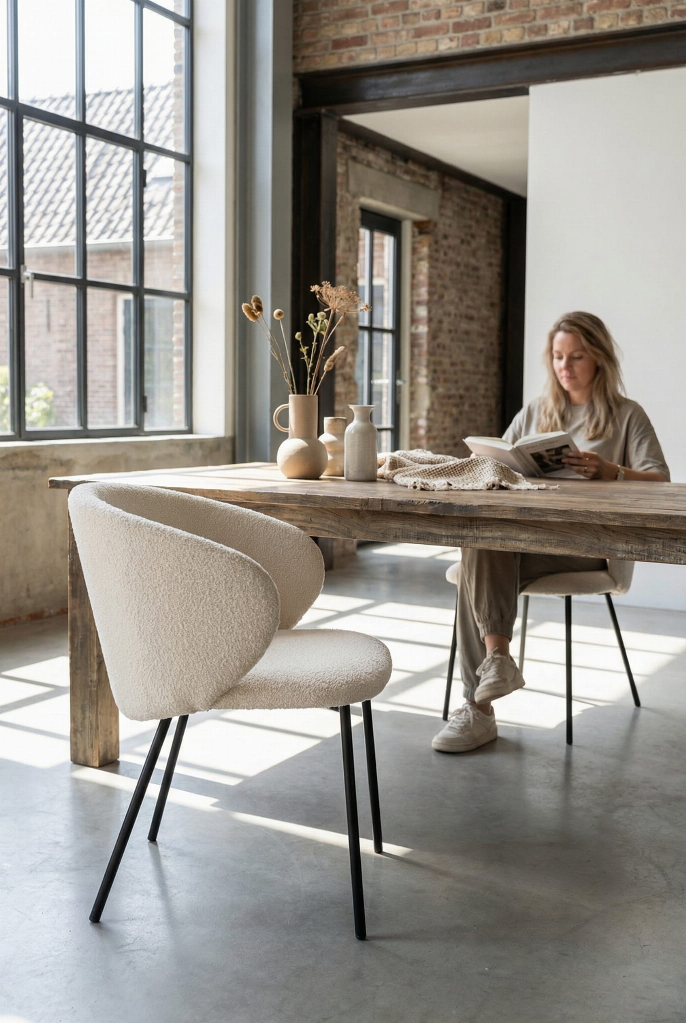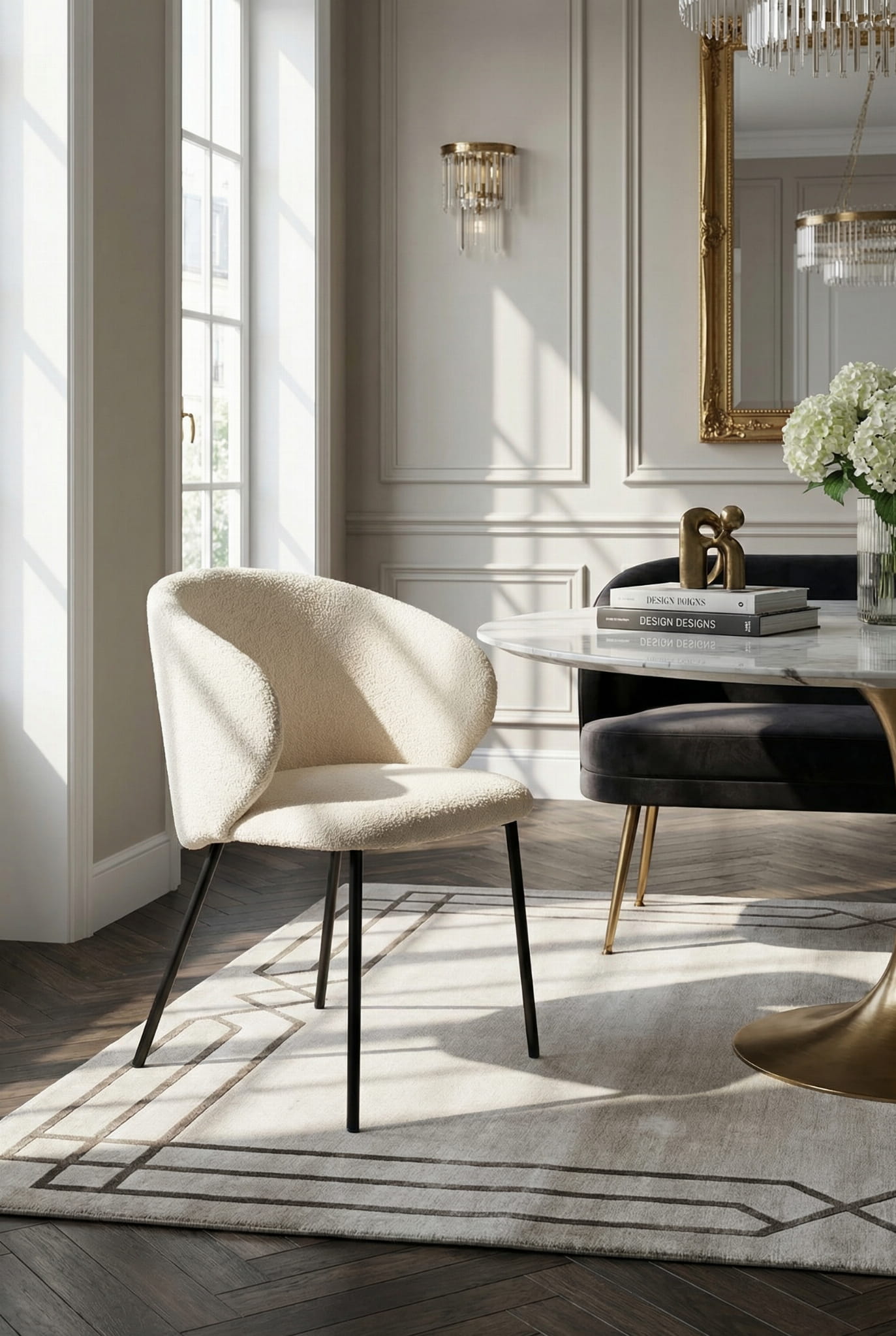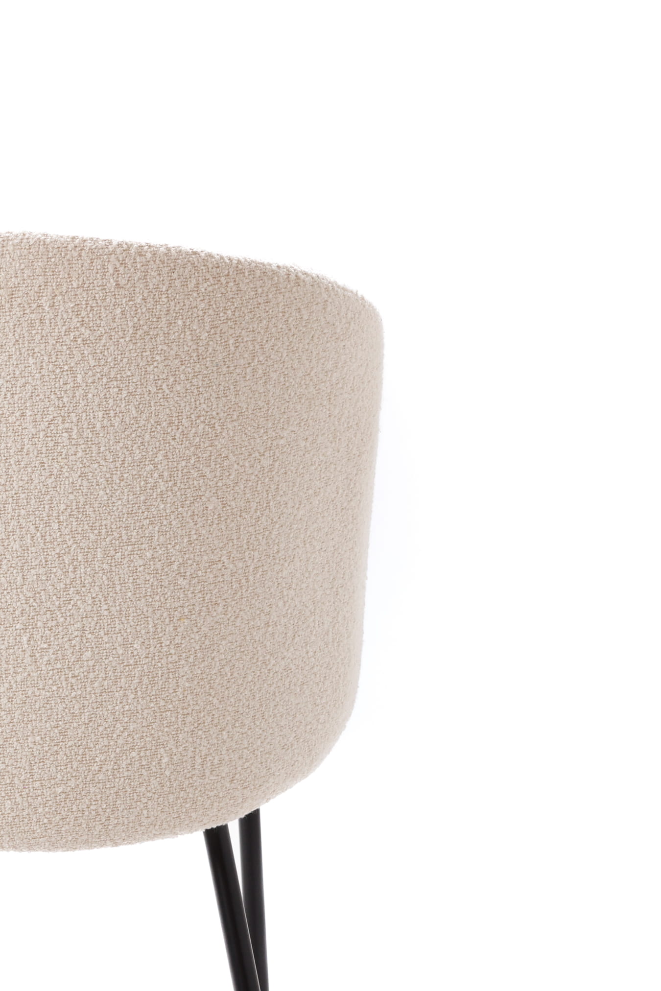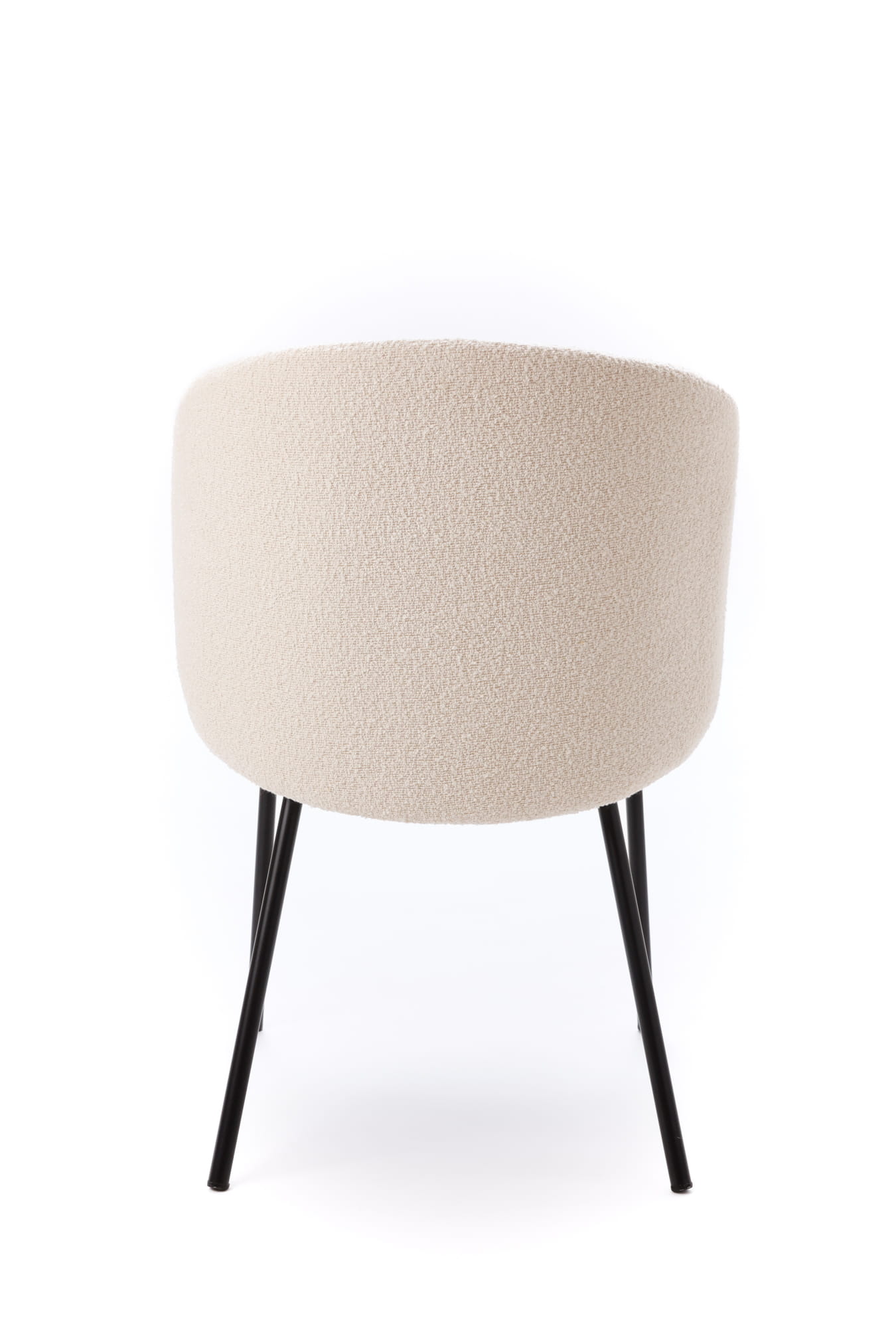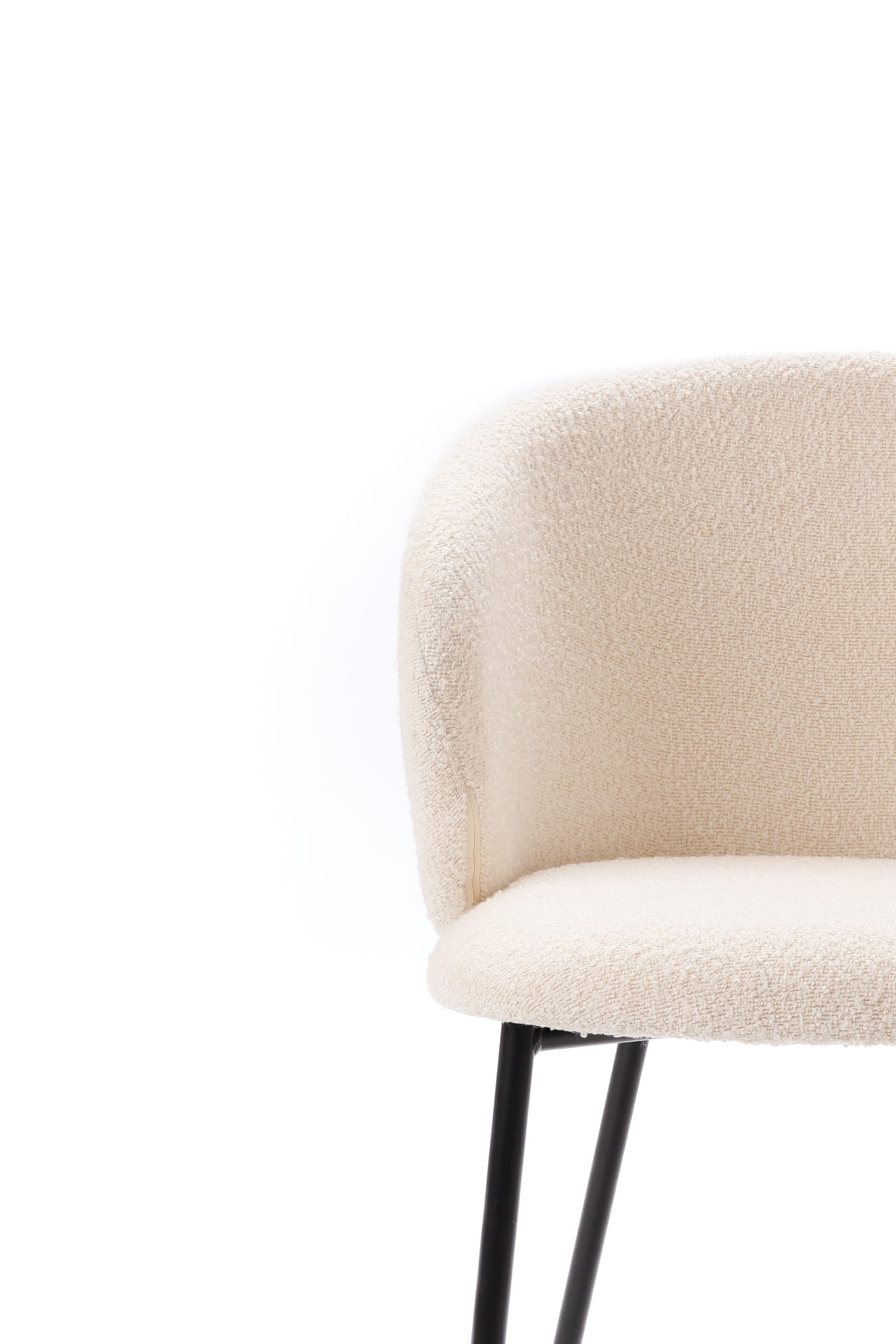 Krzesło Kukkī Bouclé w wersji biało-czarnej to propozycja dla miłośników nowoczesnego designu z charakterem. Subtelna tkanina bouclé w odcieniu bieli pięknie kontrastuje z czarną konstrukcją, tworząc wyrazisty, a jednocześnie harmonijny duet, który sprawdzi się w wielu aranżacjach — od współczesnych wnętrz minimalistycznych, przez loftowe, aż po styl japandi z mocnym akcentem.