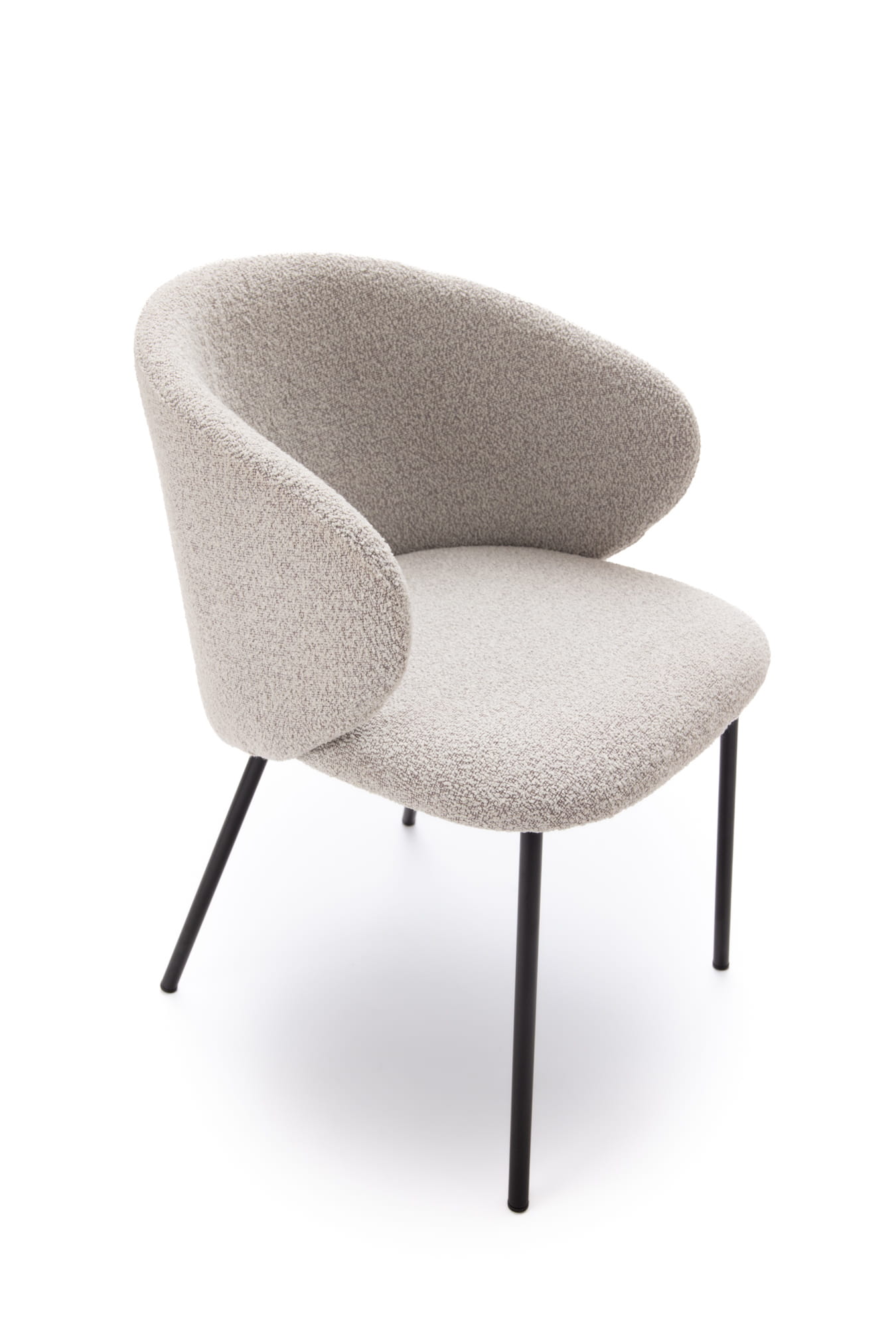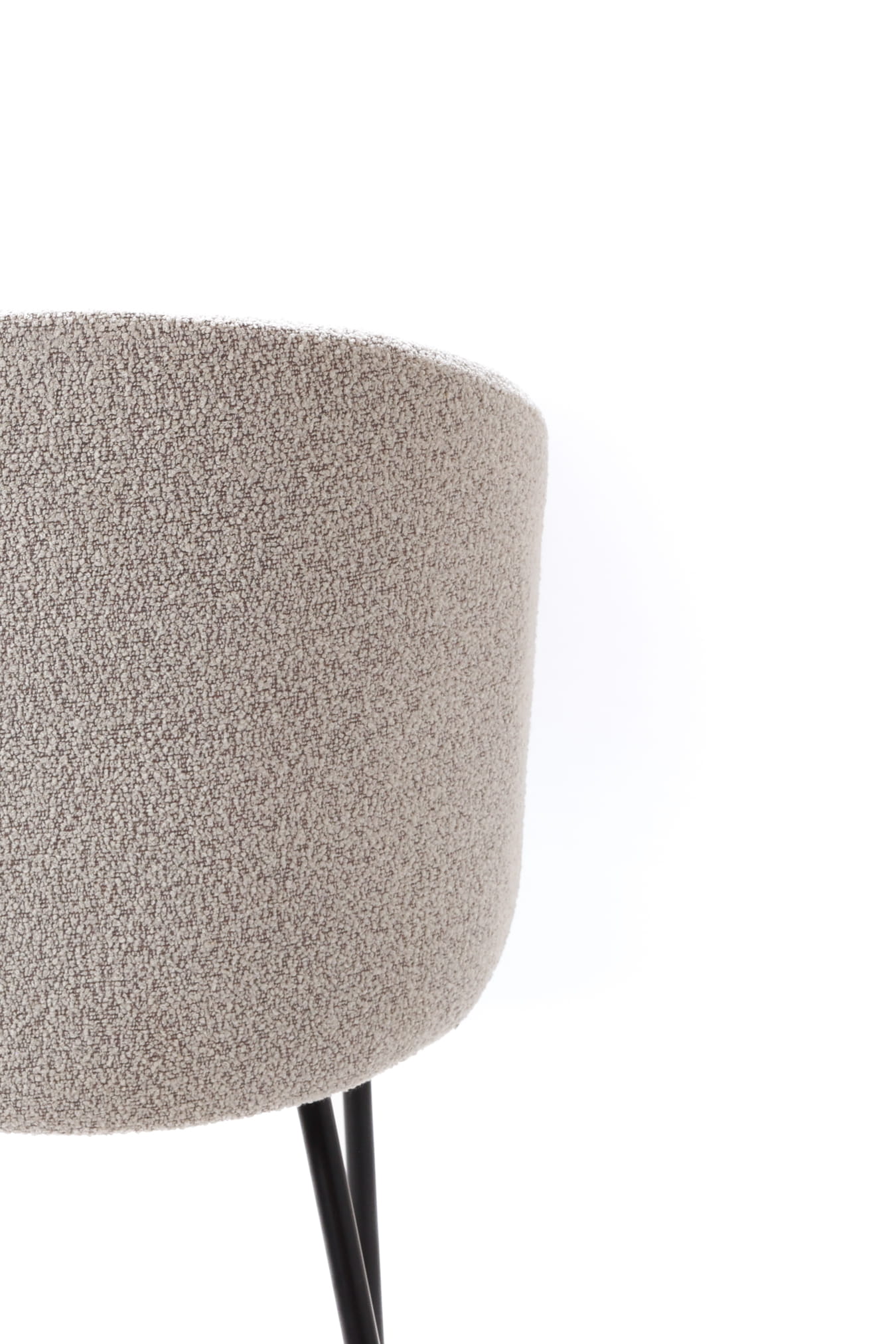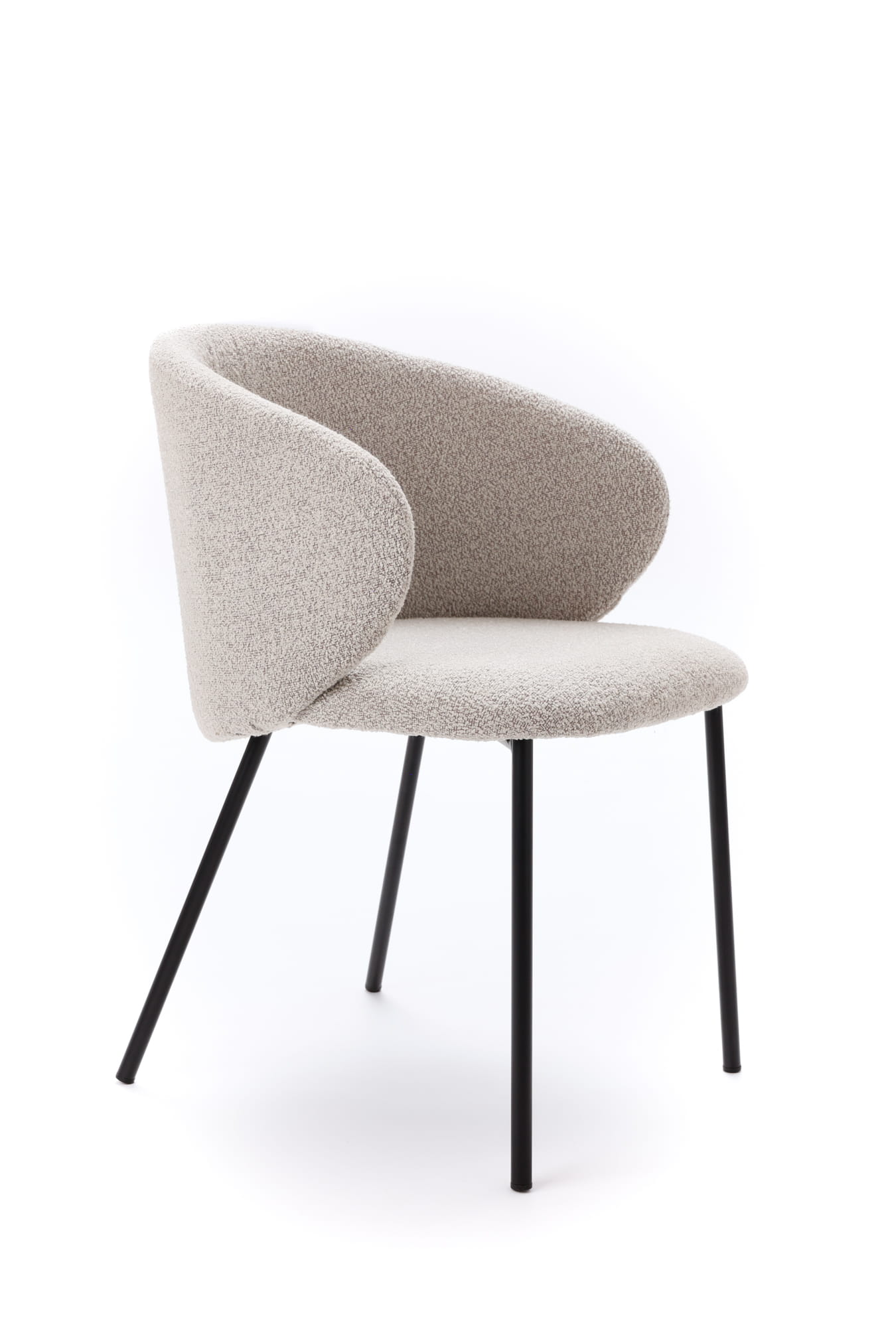 Krzesło Kukkī Bouclé zostało zaprojektowane z myślą o wnętrzach, w których liczy się balans pomiędzy komfortem a wyrazistym designem. Jego kompaktowa, lekko obła bryła sprawia, że mebel prezentuje się solidnie, a jednocześnie nie przytłacza przestrzeni. Tapicerka z tkaniny bouclé w stonowanym, szarym odcieniu wprowadza do wnętrza miękkość i wizualne ciepło.
