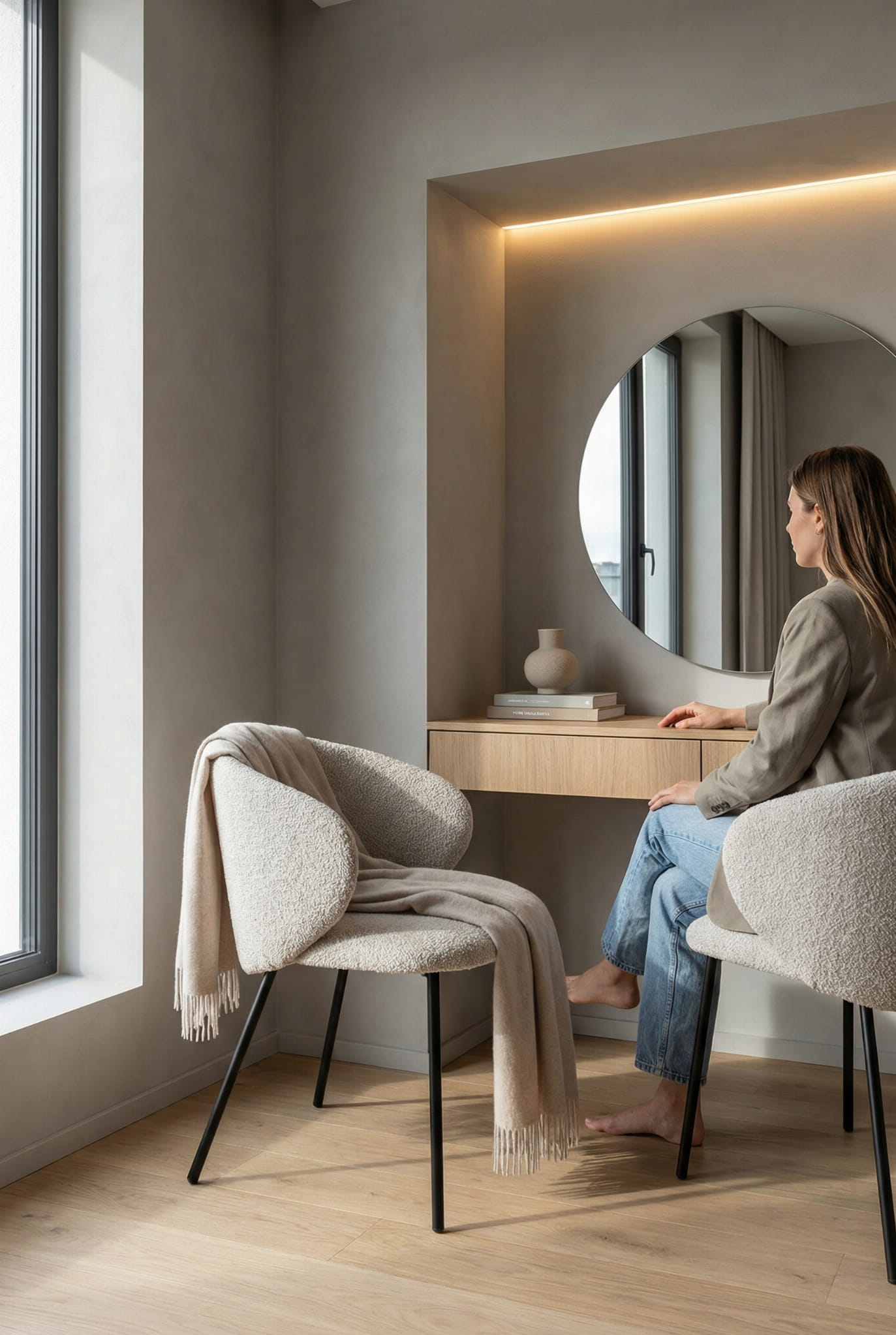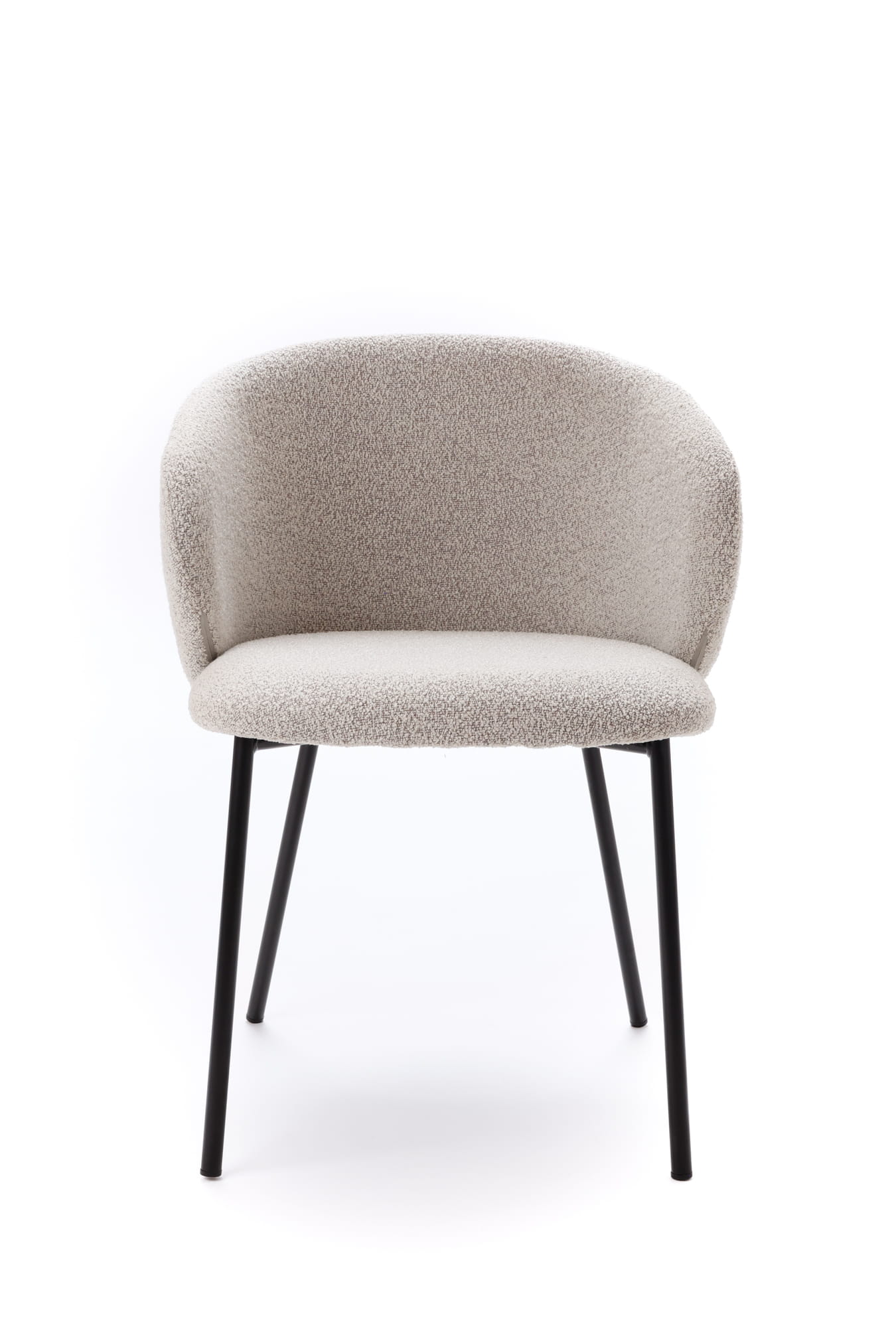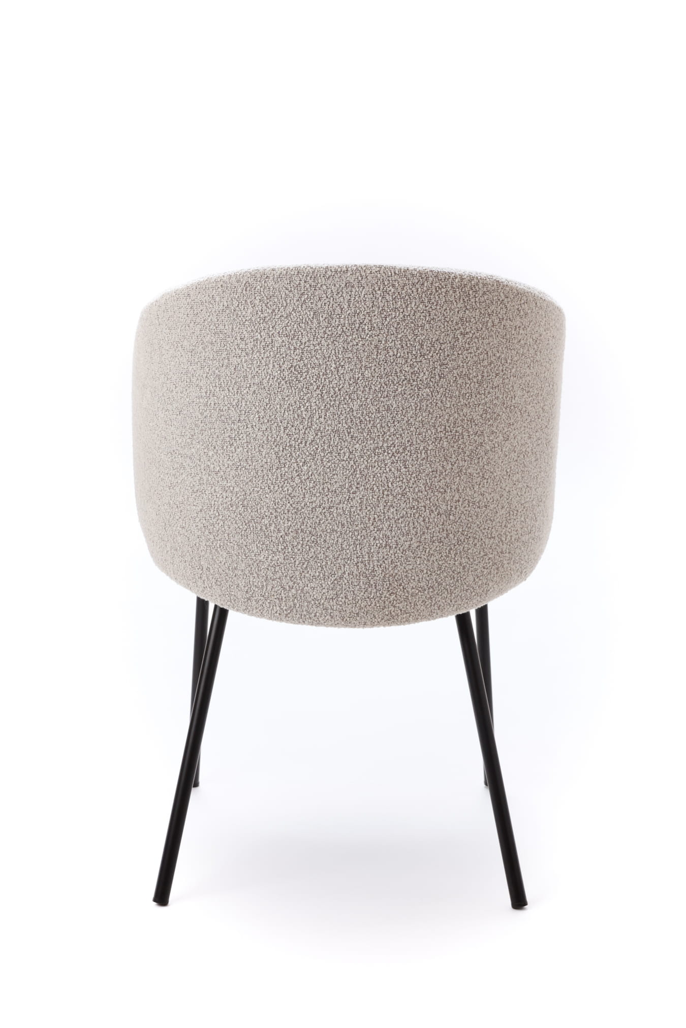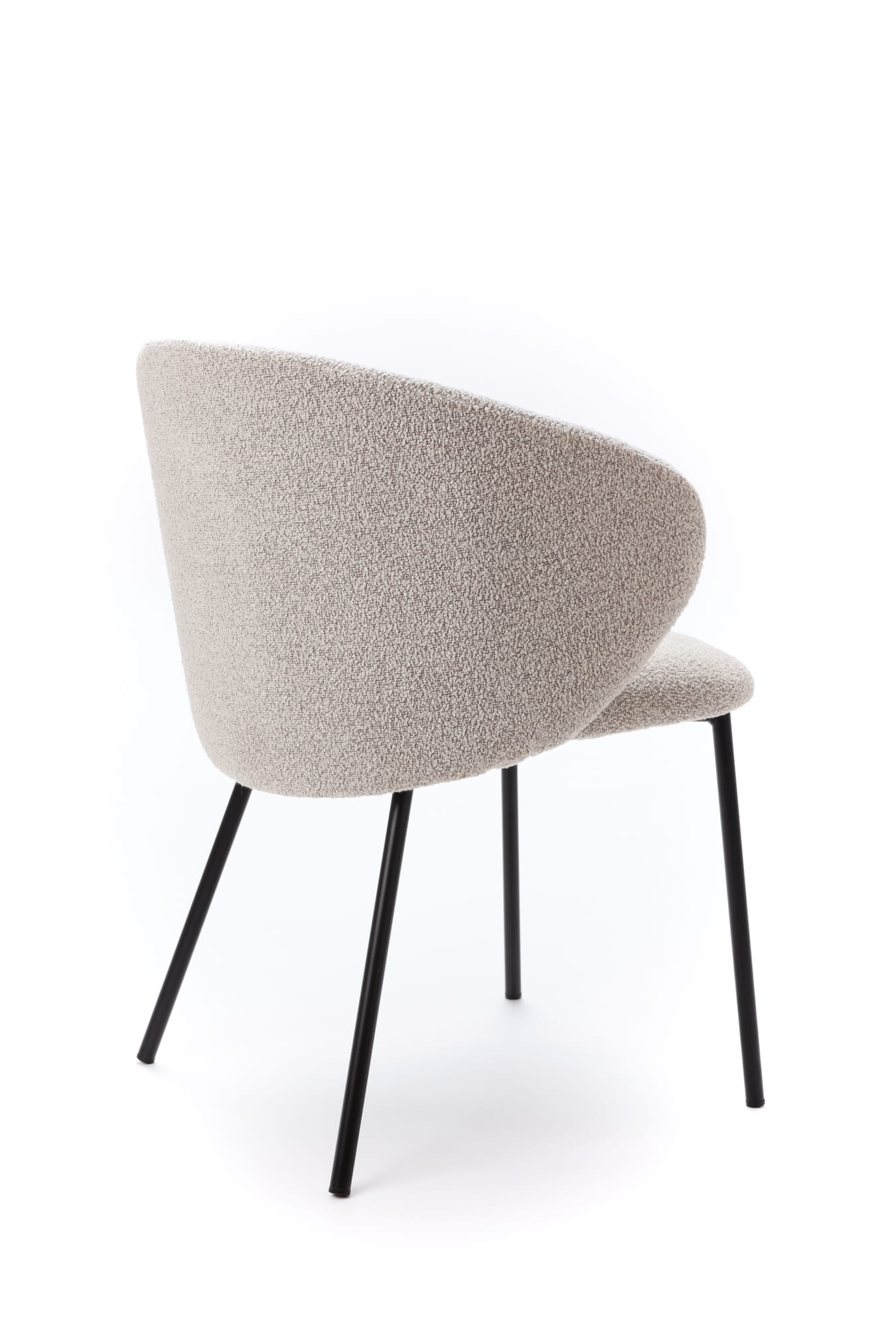 Krzesło Kukkī Bouclé zostało zaprojektowane z myślą o wnętrzach, w których liczy się balans pomiędzy komfortem a wyrazistym designem. Jego kompaktowa, lekko obła bryła sprawia, że mebel prezentuje się solidnie, a jednocześnie nie przytłacza przestrzeni. Tapicerka z tkaniny bouclé w stonowanym, szarym odcieniu wprowadza do wnętrza miękkość i wizualne ciepło.
