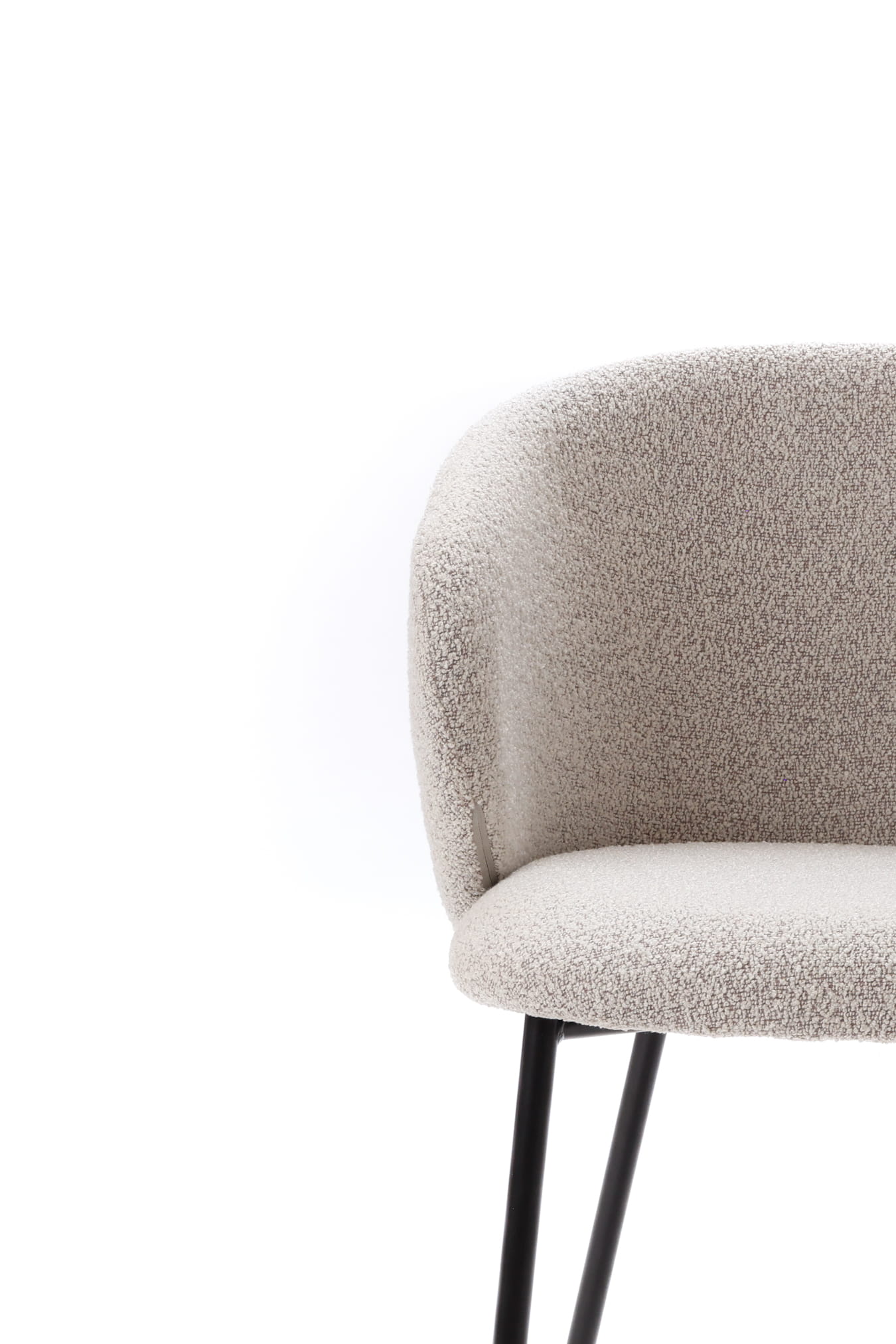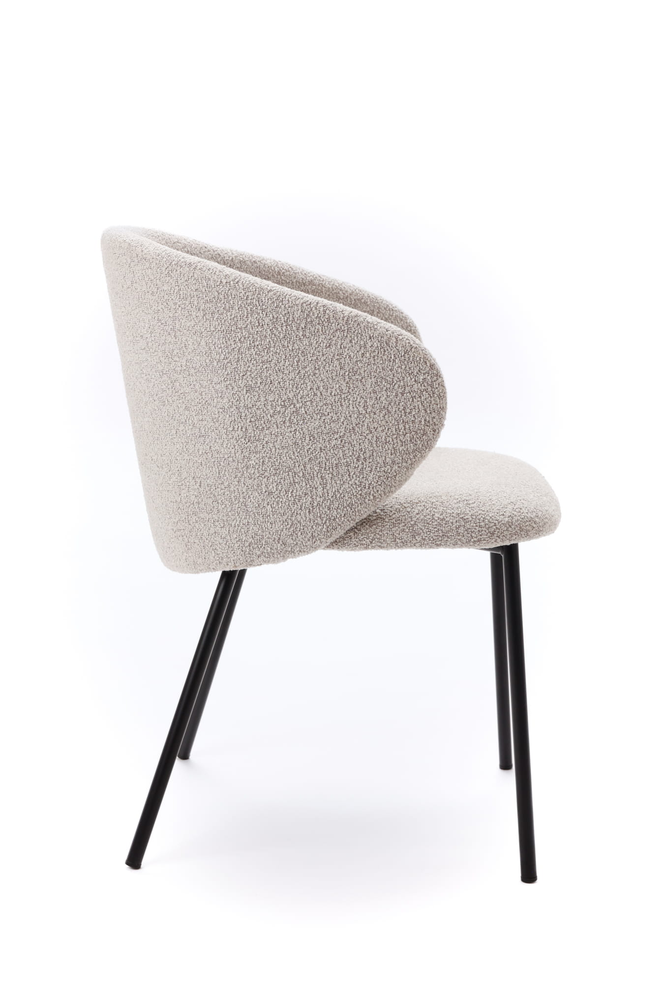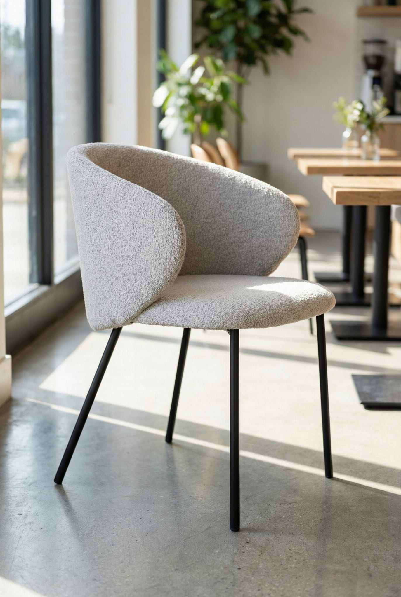 Krzesło Kukkī Bouclé to nowoczesna forma z wyraźnym loftowym charakterem. Miękka tapicerka w odcieniu szarości połączona z czarną konstrukcją tworzy elegancki i ponadczasowy duet. Idealne do jadalni, kuchni i nowoczesnych przestrzeni.
