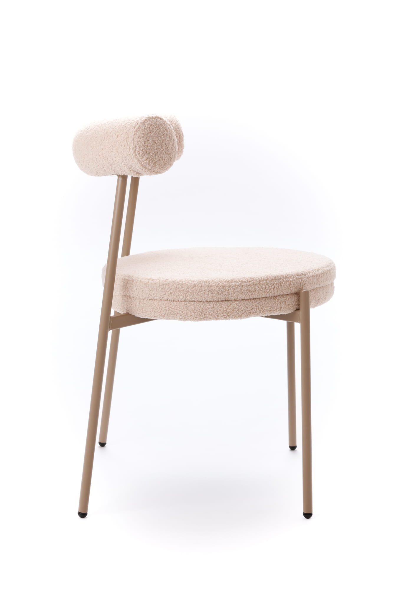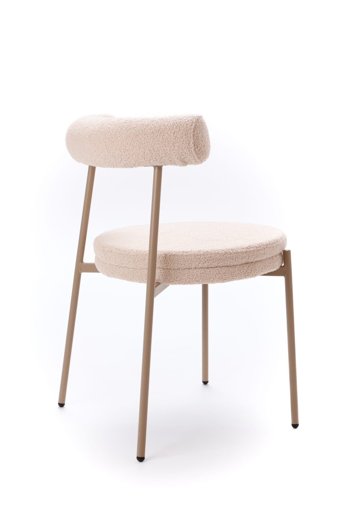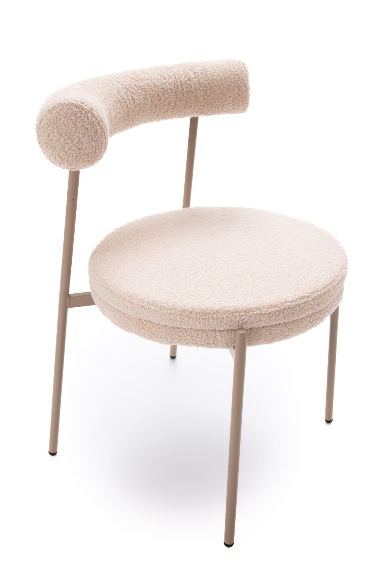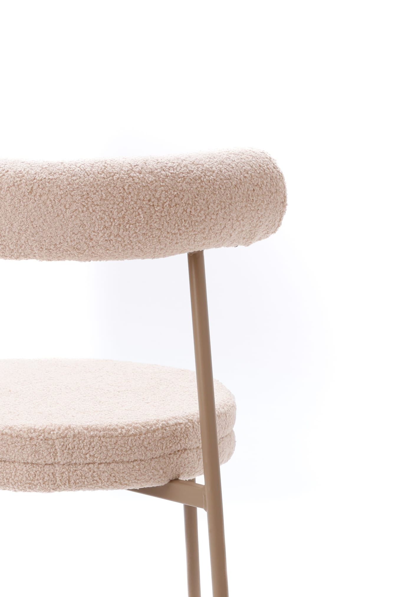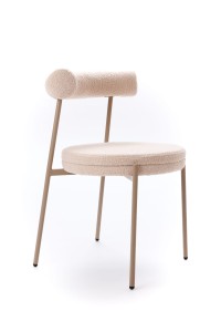 Tapicerka w ciepłym, beżowym odcieniu subtelnie rozjaśnia wnętrze i doskonale komponuje się z naturalnymi materiałami, jasnym drewnem oraz stonowaną paletą barw. Charakterystyczna, puszysta struktura teddy dodaje krzesłu miękkości wizualnej, jednocześnie pozostając eleganckim akcentem nowoczesnych aranżacji.