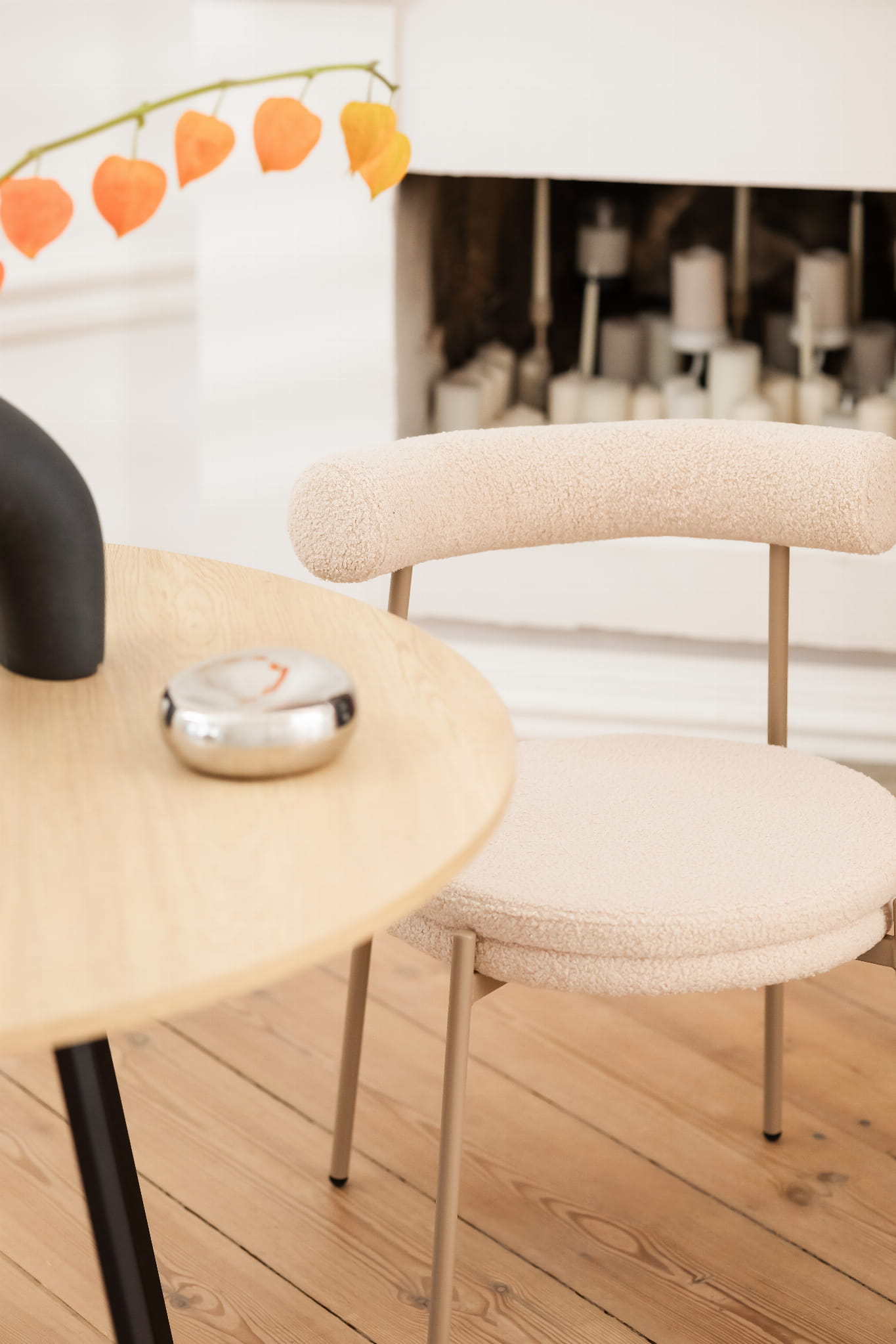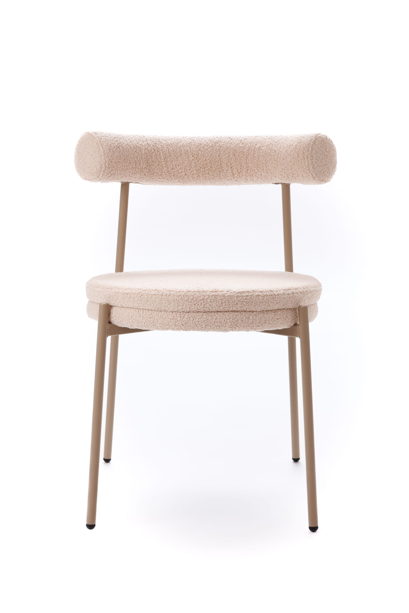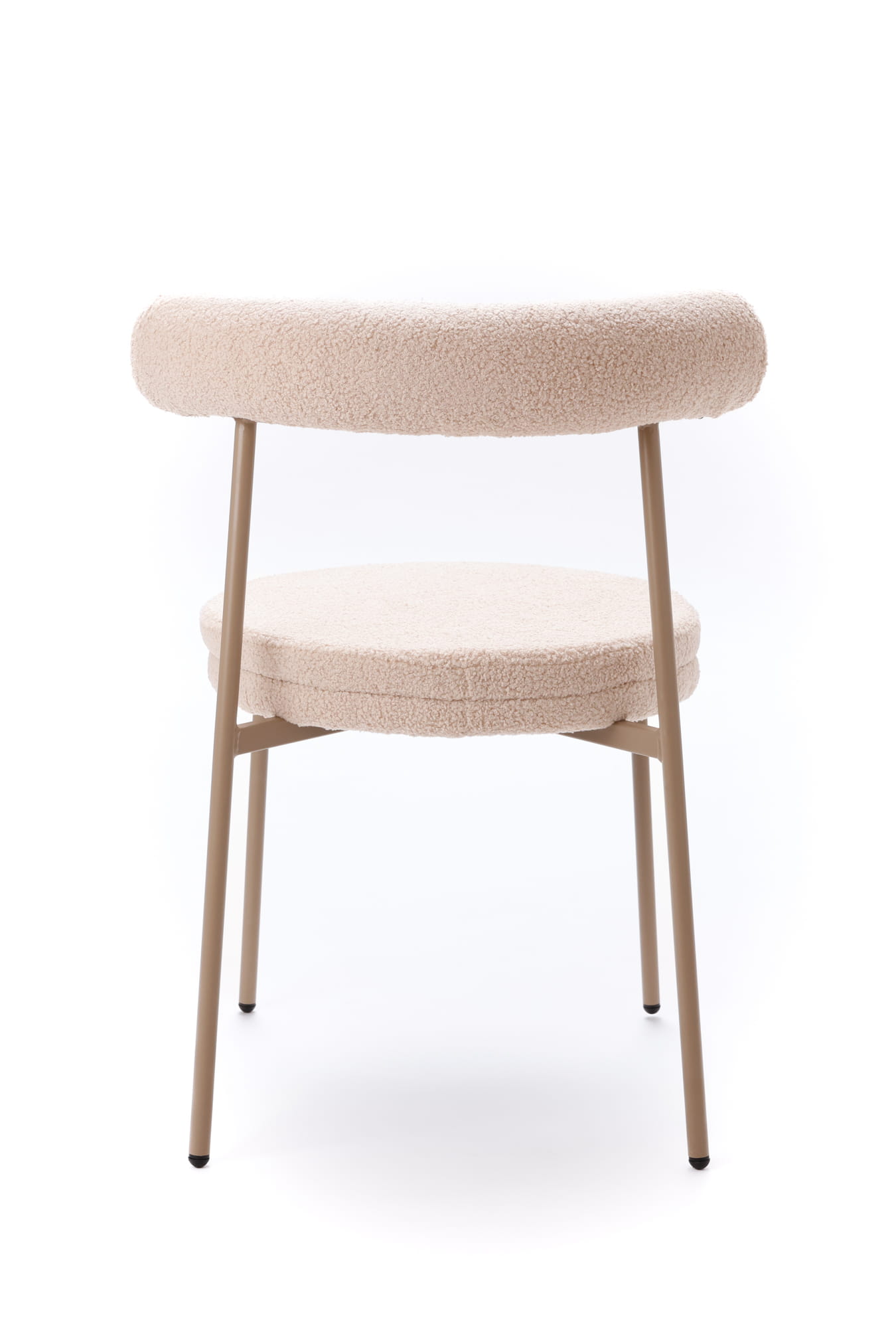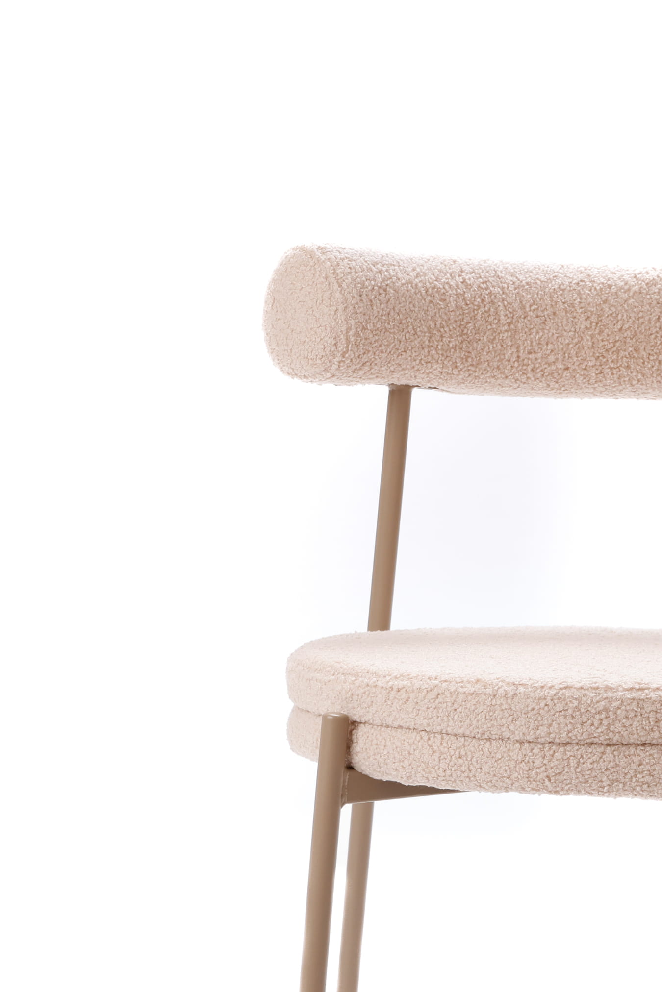 Tapicerka w ciepłym, beżowym odcieniu subtelnie rozjaśnia wnętrze i doskonale komponuje się z naturalnymi materiałami, jasnym drewnem oraz stonowaną paletą barw. Charakterystyczna, puszysta struktura teddy dodaje krzesłu miękkości wizualnej, jednocześnie pozostając eleganckim akcentem nowoczesnych aranżacji.