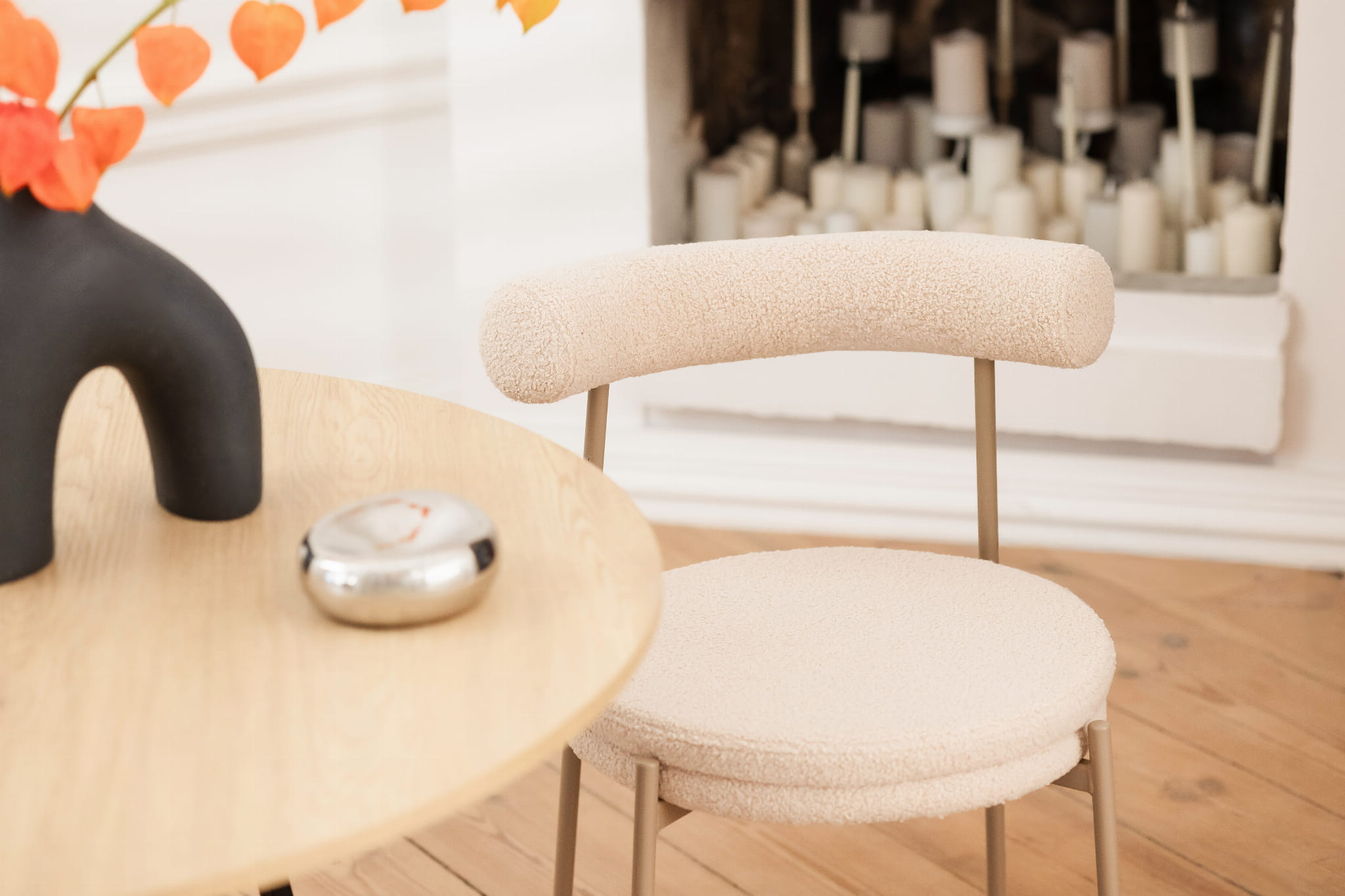 Rōru to krzesło, które zaprasza, by usiąść na chwilę dłużej. Jego miękka sylwetka i przyjemna w dotyku tkanina teddy tworzą atmosferę domowego komfortu — taką, która sprzyja rozmowom przy stole, spokojnym porankom i codziennym rytuałom w gronie bliskich.