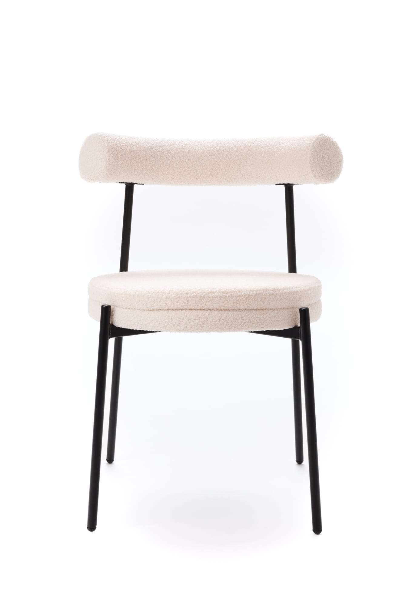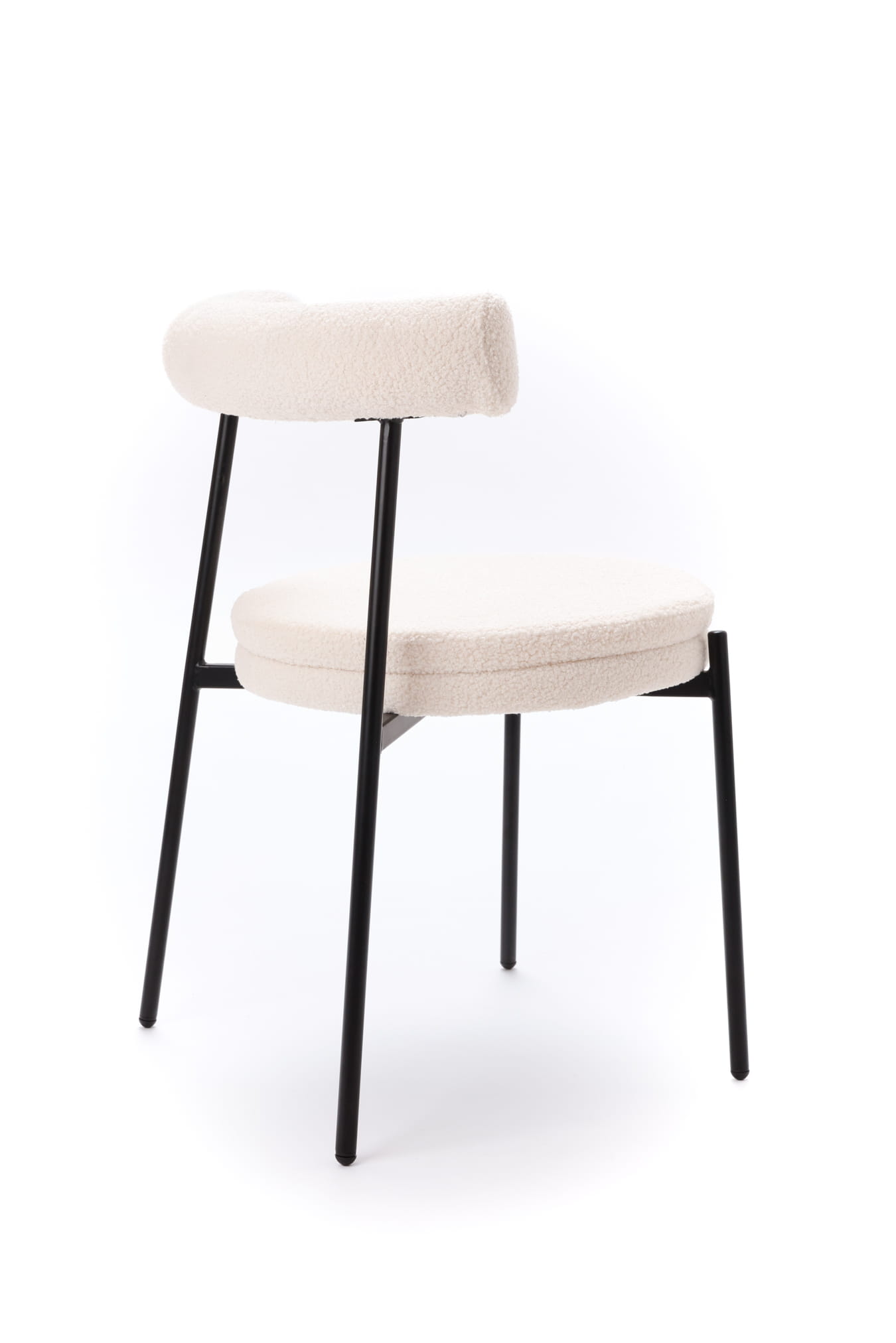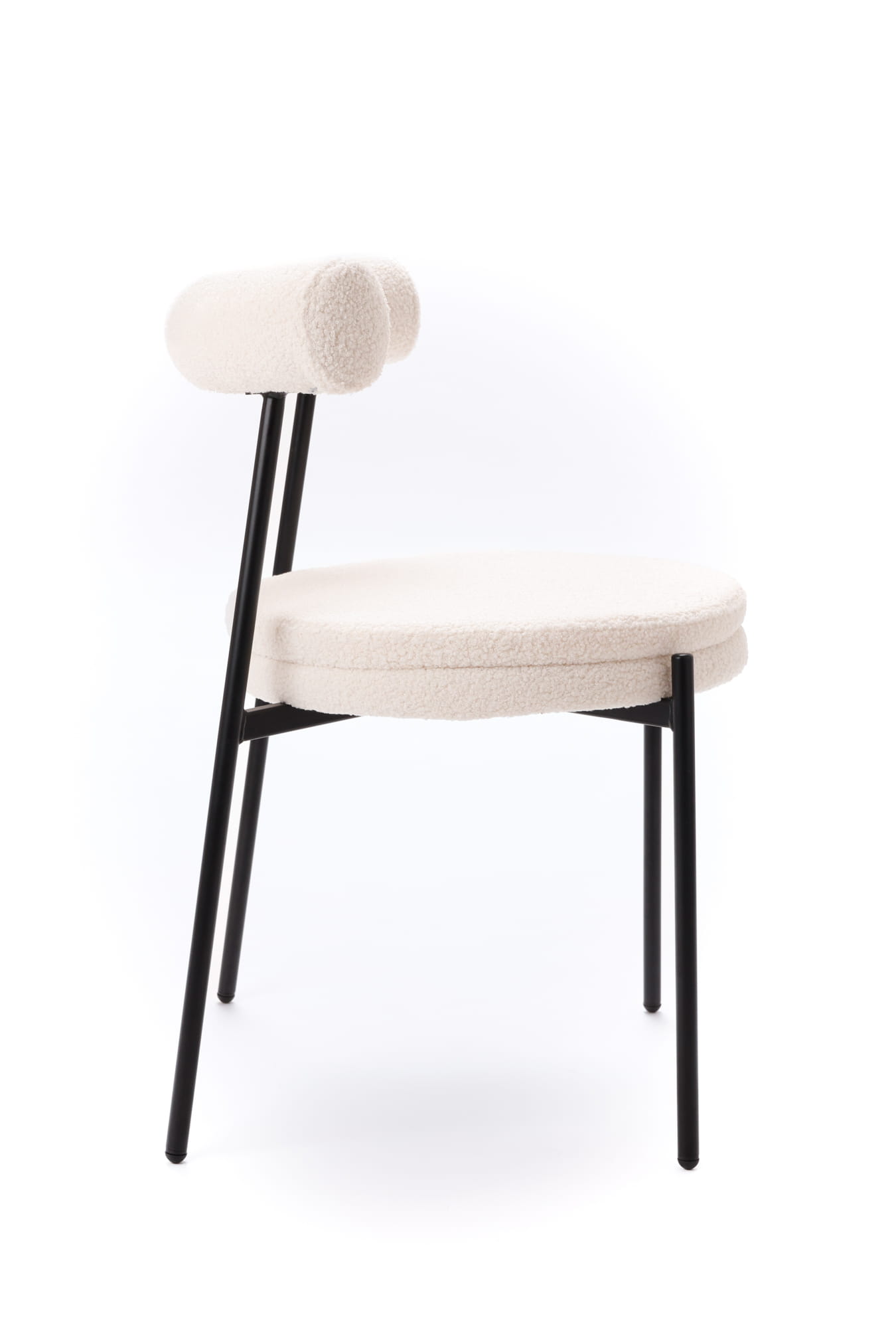 Rōru to zestaw 2 tapicerowanych krzeseł z białej tkaniny teddy i czarnymi metalowymi nogami. Kontrastowa forma i miękka faktura tworzą nowoczesny, wyrazisty akcent do jadalni lub salonu.