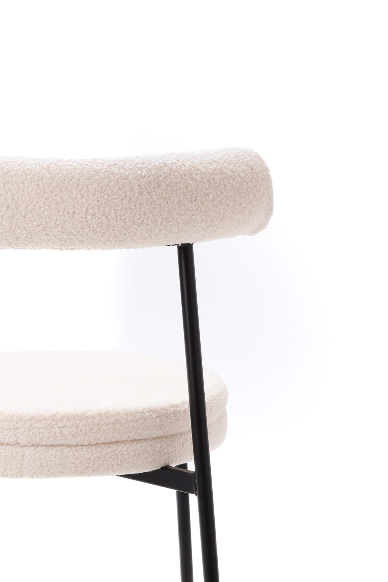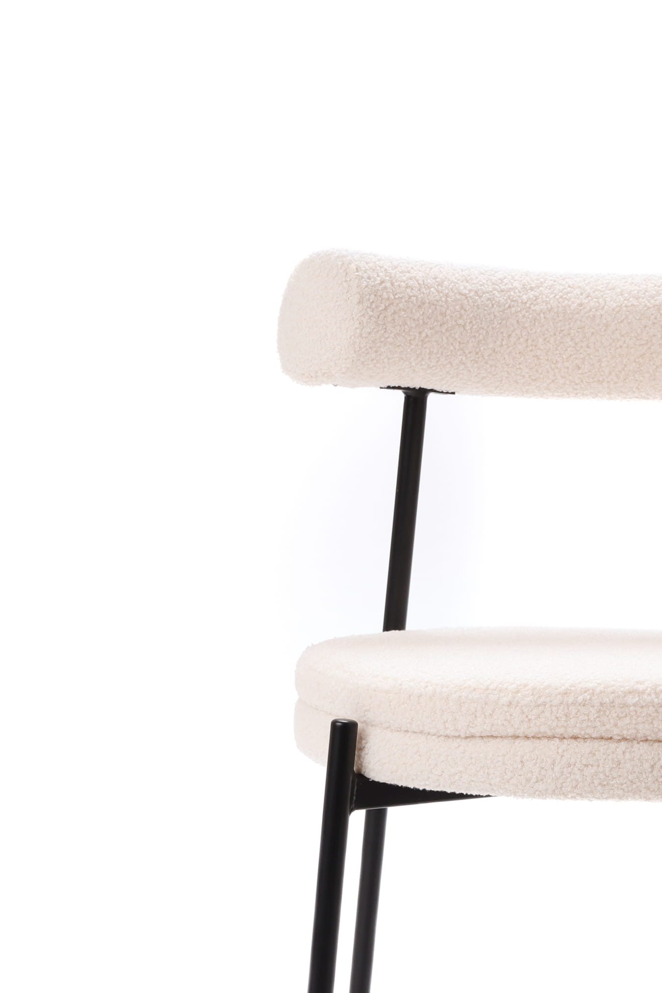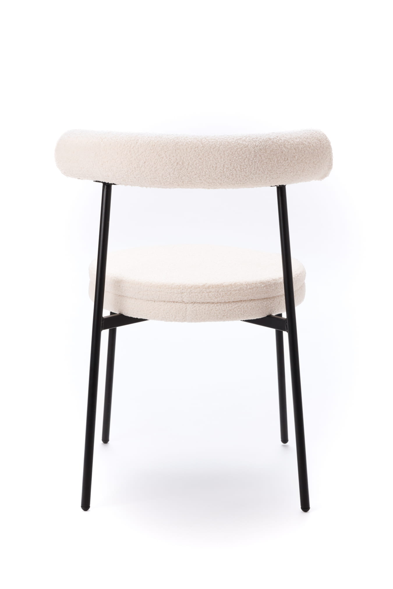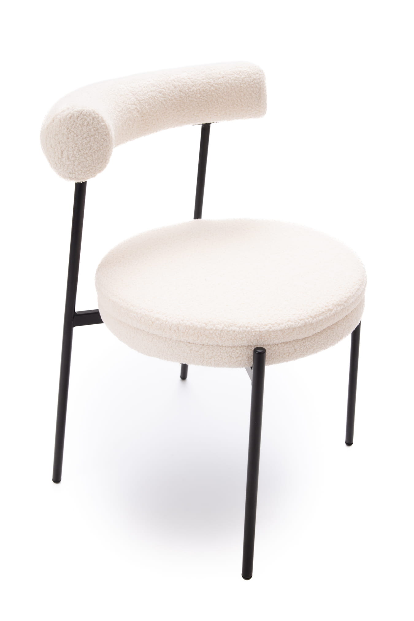 Rōru to zestaw 2 tapicerowanych krzeseł z białej tkaniny teddy i czarnymi metalowymi nogami. Kontrastowa forma i miękka faktura tworzą nowoczesny, wyrazisty akcent do jadalni lub salonu.