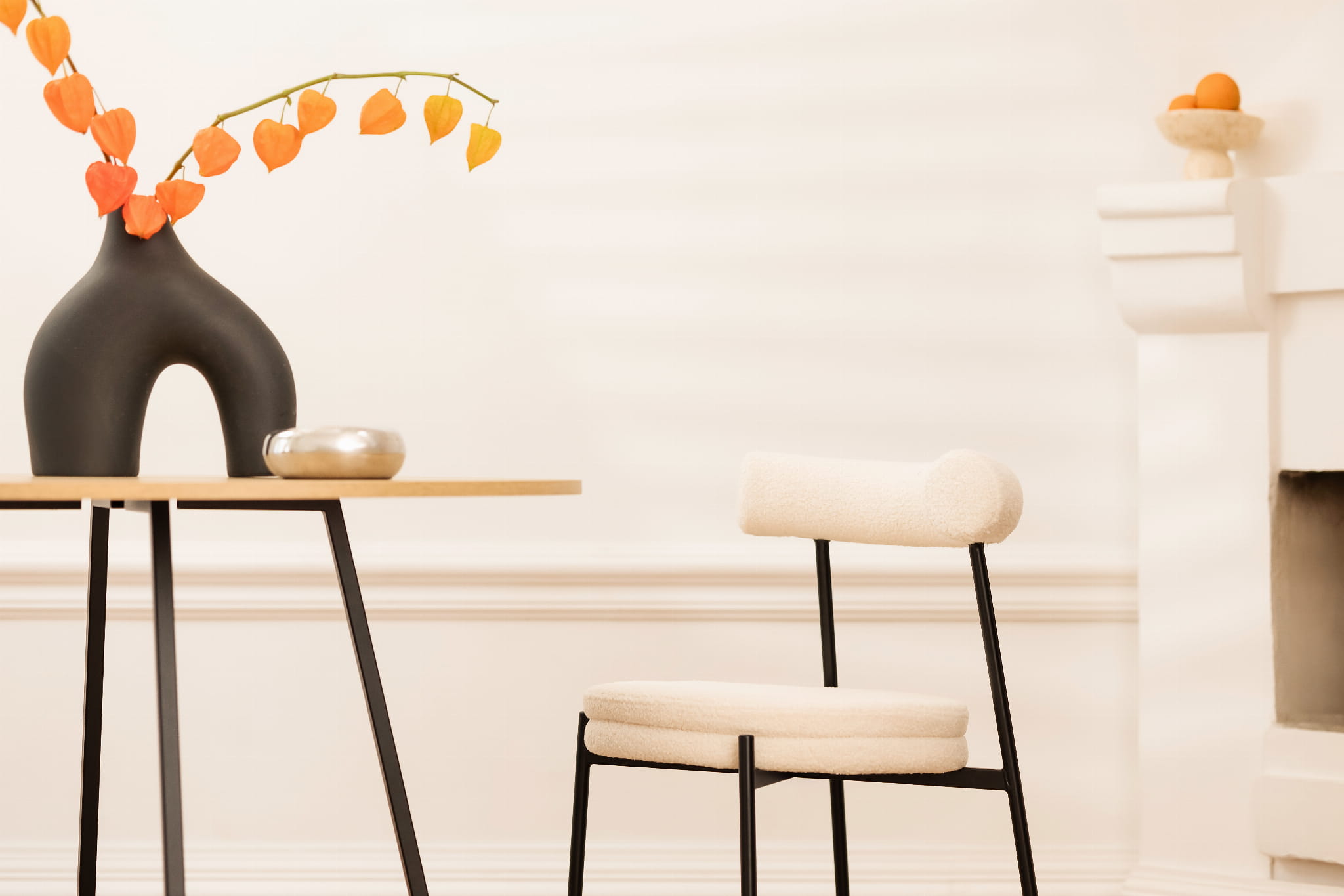 Rōru przyciąga uwagę prostotą, która nie potrzebuje dodatków. Biała tapicerka z tkaniny teddy nadaje krzesłu miękkość i lekkość, a jednocześnie buduje wyrazisty charakter wnętrza. To propozycja dla osób, które lubią jasne przestrzenie, czyste formy i detale widoczne na pierwszy rzut oka.