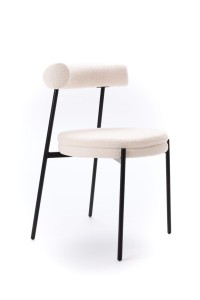 Czarne, metalowe nogi wprowadzają mocniejszy akcent i równoważą miękkość siedziska. Ich smukła forma podkreśla nowoczesny charakter krzesła i nadaje całości stabilności, nie obciążając wizualnie aranżacji. To kontrast, który dobrze odnajduje się zarówno w minimalistycznych wnętrzach, jak i w przestrzeniach inspirowanych stylem loftowym czy japandi.