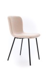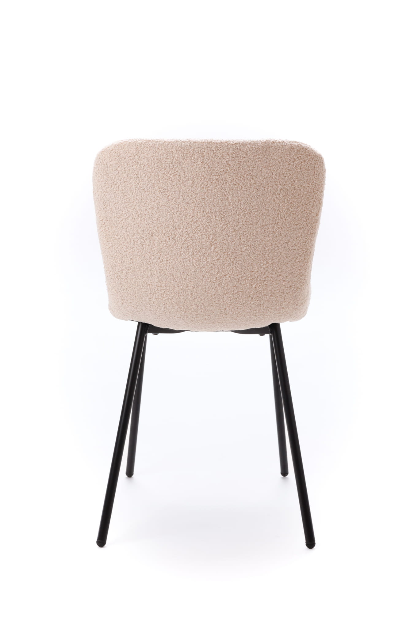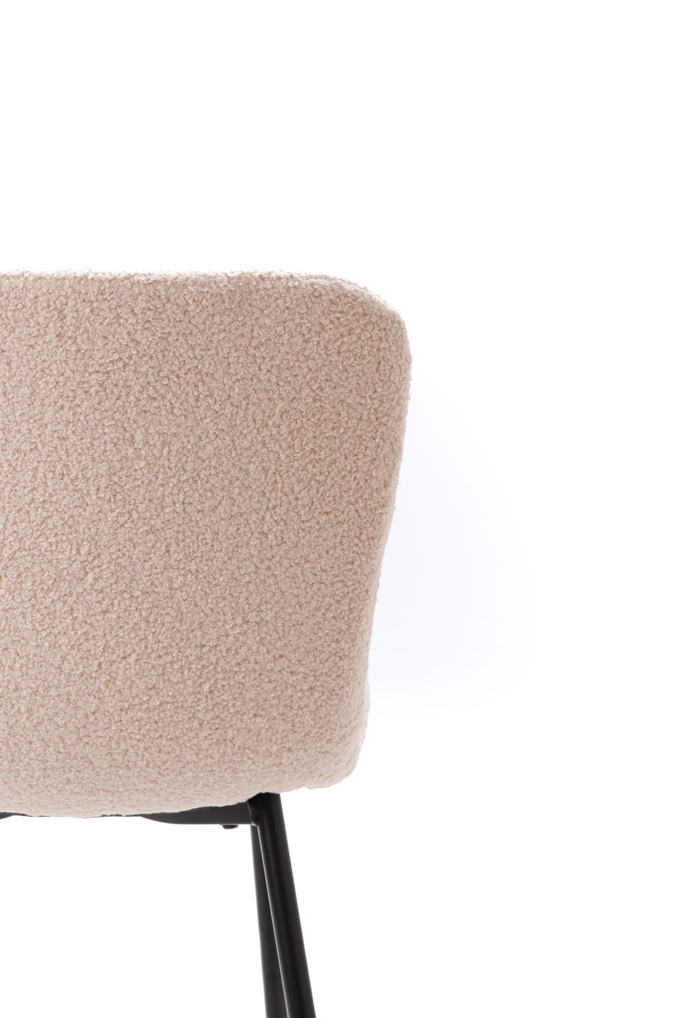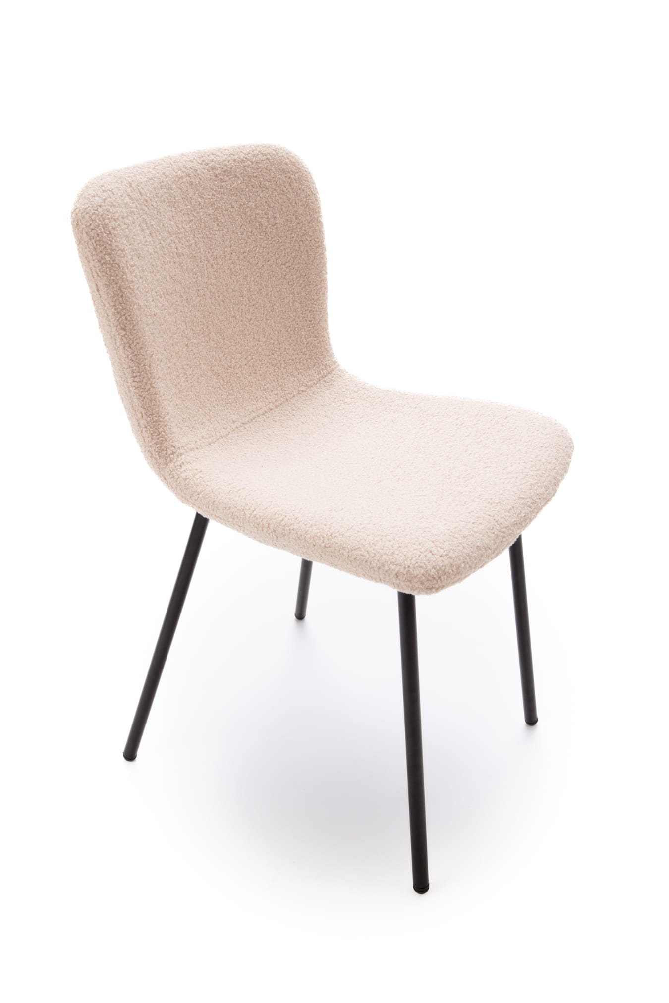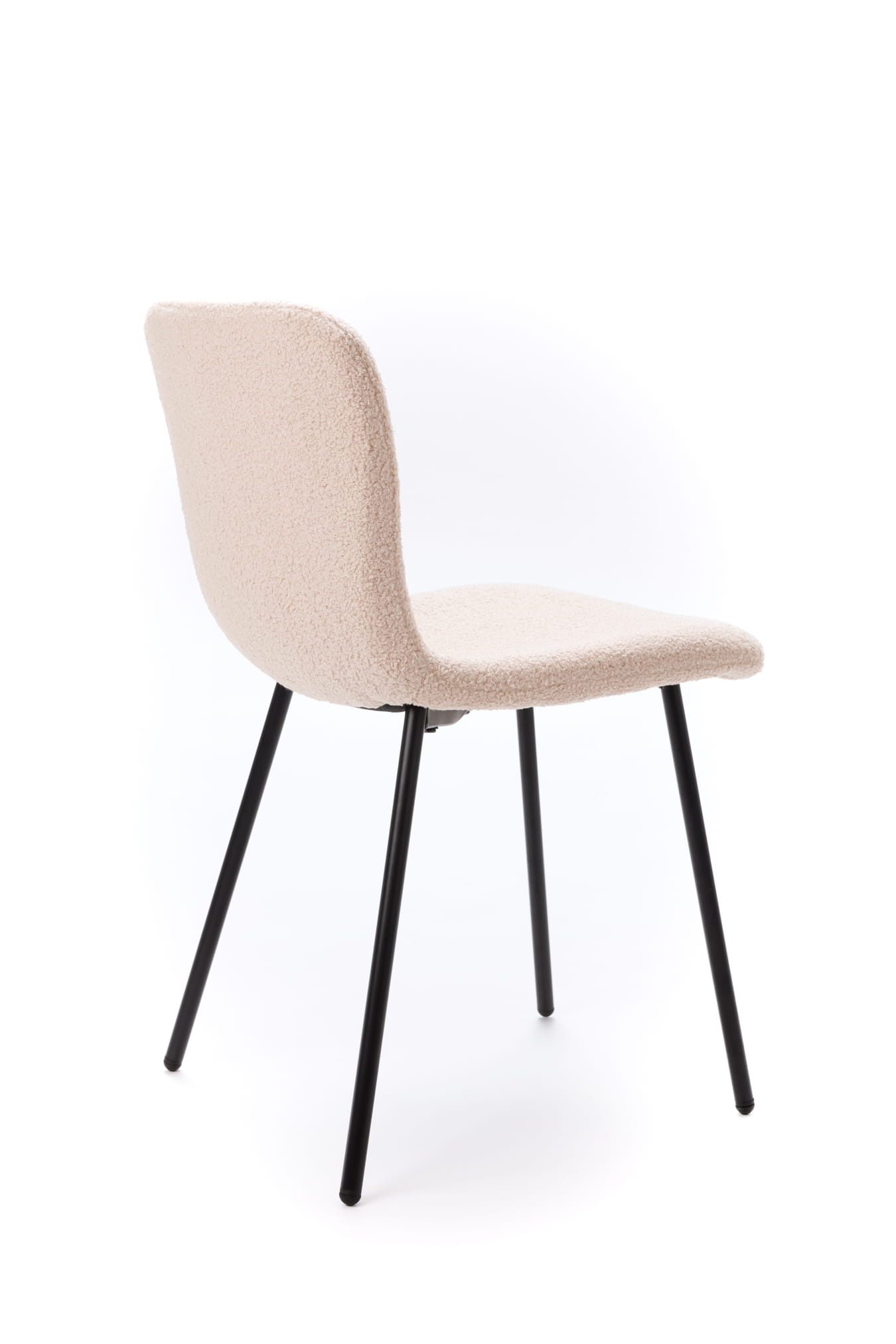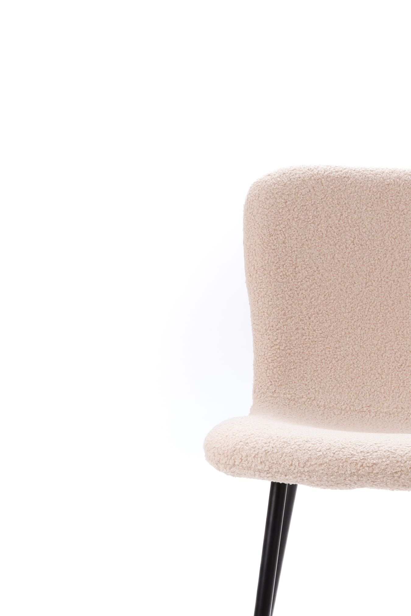 Tapicerka z tkaniny teddy w beżowym odcieniu wprowadza do wnętrza miękkość i przytulny charakter. Jej subtelna faktura dodaje głębi, nie dominując przestrzeni. Czarne nogi stanowią spokojny kontrapunkt dla jasnej tapicerki, podkreślając nowoczesną formę krzesła i nadając całości wyraźną, ale nienachalną strukturę.