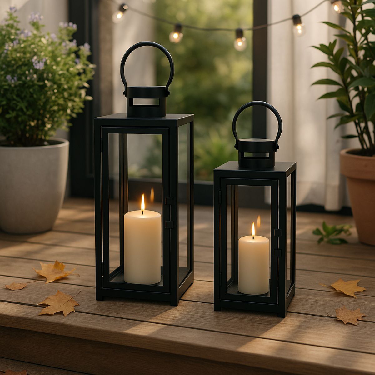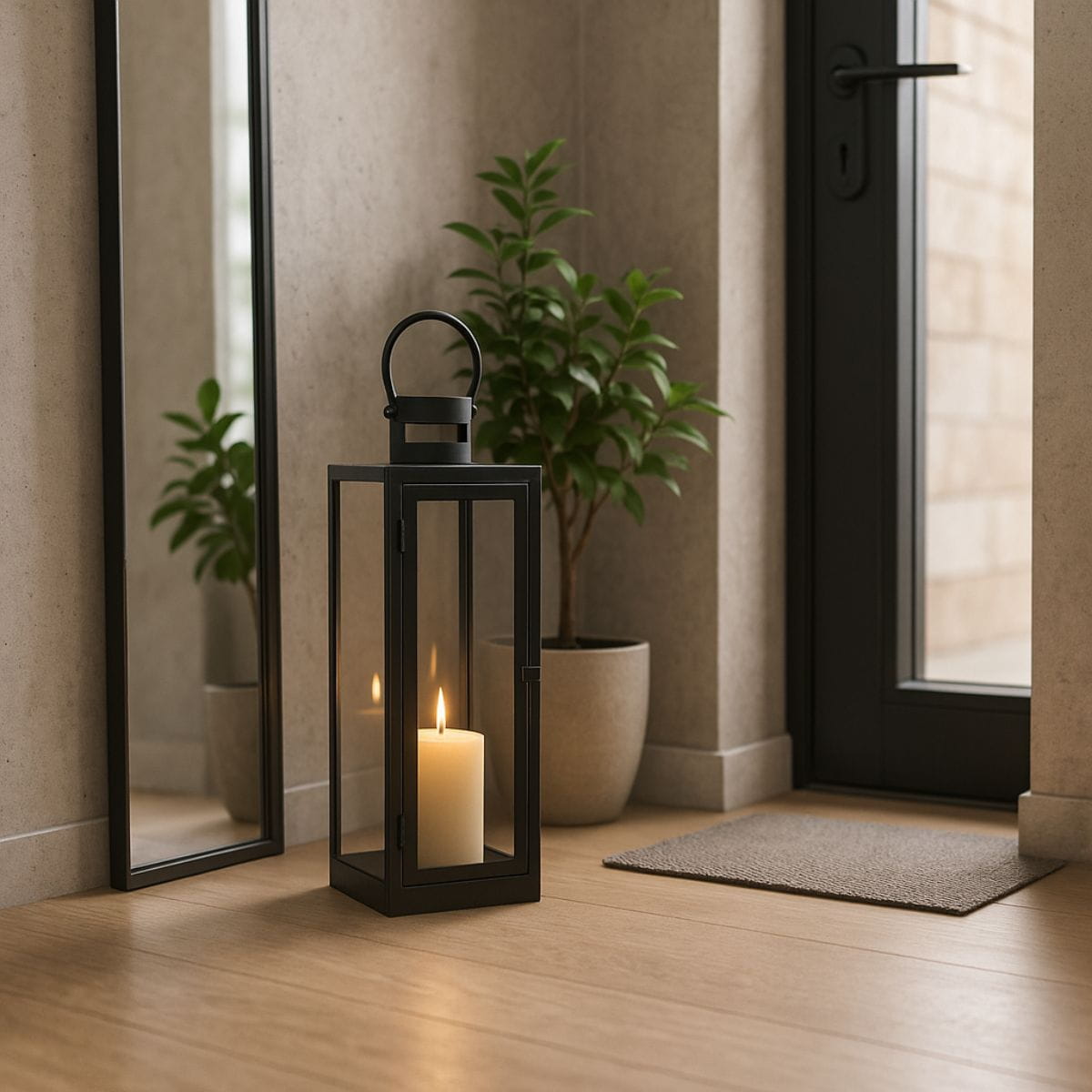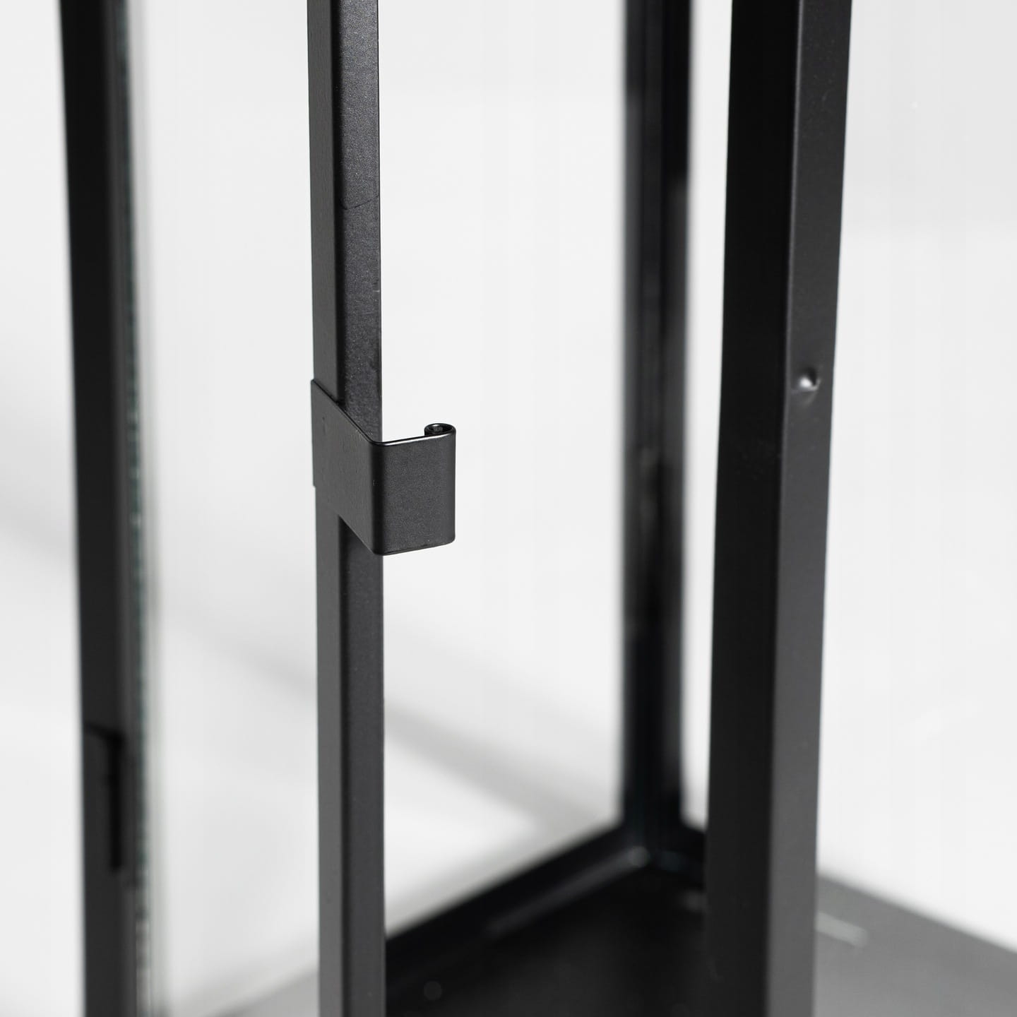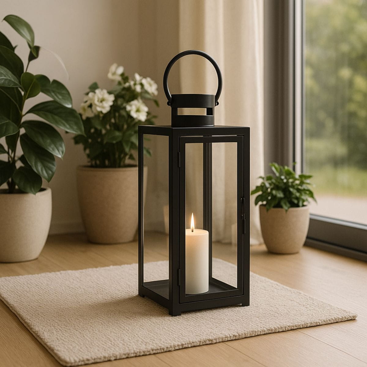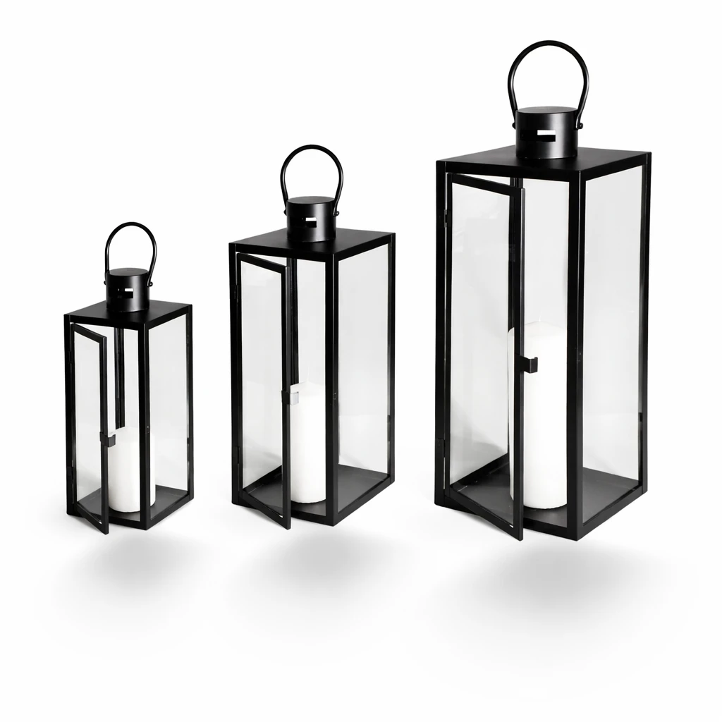 Metalowa rama w połączeniu ze szklaną obudową tworzy konstrukcję, która subtelnie osłania płomień, jednocześnie pozwalając mu swobodnie rozpraszać światło. Czerń nadaje lampionowi nowoczesnego charakteru i sprawia, że doskonale komponuje się z wnętrzami w stylu minimalistycznym, loftowym oraz japandi.