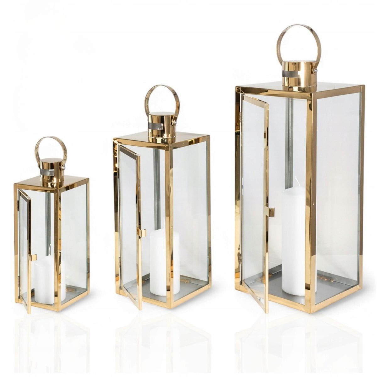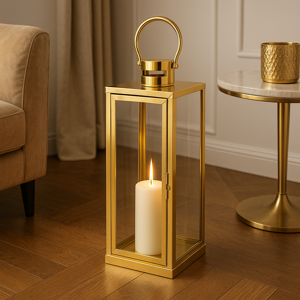 Lampion Noa L Złoty to dekoracja, która łączy w sobie ponadczasową elegancję i delikatne światło, tworząc atmosferę idealną na spokojne wieczory i rodzinne spotkania. Wysoka, smukła forma (63 cm) sprawia, że lampion pięknie prezentuje się zarówno ustawiony samodzielnie na podłodze, jak i w duecie z innymi dodatkami. Złota rama subtelnie odbija światło świecy, nadając wnętrzu miękki blask i sprawiając, że przestrzeń staje się bardziej przytulna.