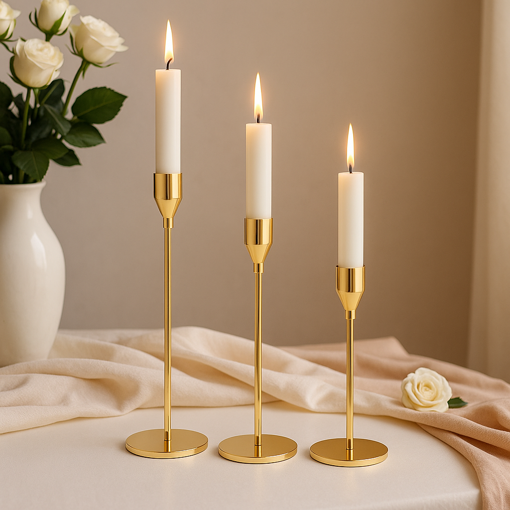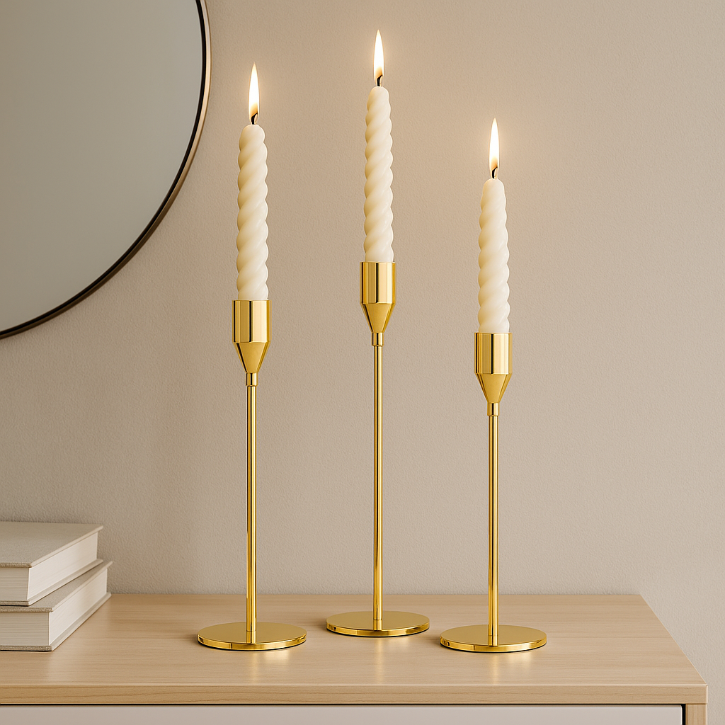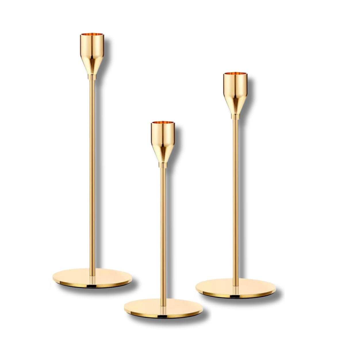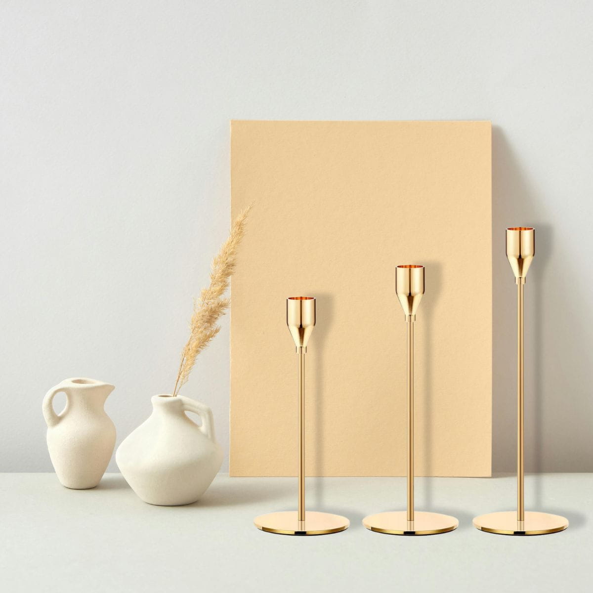 Zestaw trzech świeczników Lumi w złotym kolorze – klasyczna elegancja z nutą glamour. Idealne na świece stołowe, by dodać blasku każdemu wnętrzu.