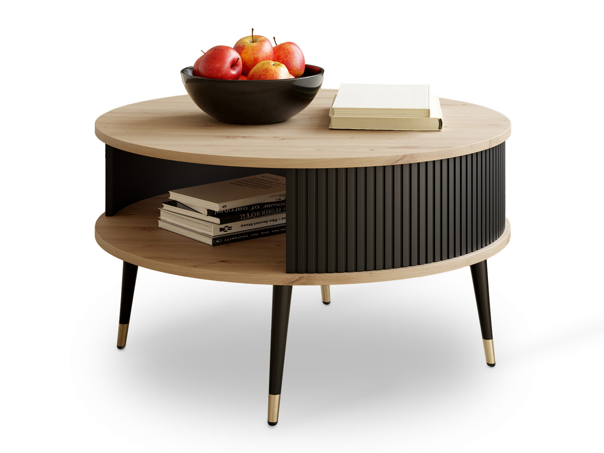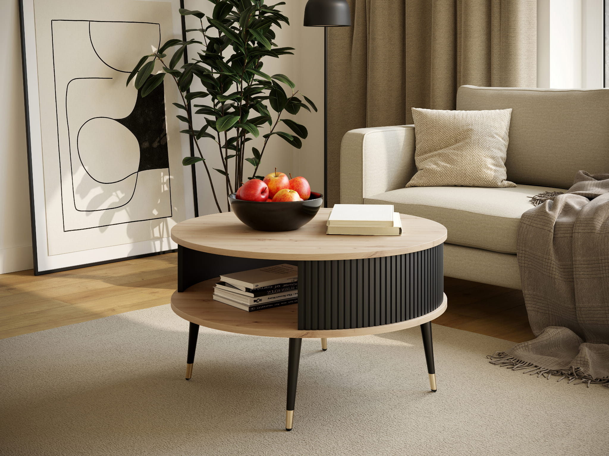 Stolik kawowy Mizo Glam Dąb Artisan / Czarny to propozycja dla osób, które lubią elegancję z nutą naturalności. Okrągłe blaty o średnicy 76 cm wykonane z płyty laminowanej w dekorze dąb artisan wprowadzają do wnętrza ciepło i przytulność. Kontrastowa, czarna ryfla z wewnętrzną stroną w tym samym odcieniu dodaje meblowi nowoczesnego charakteru, a czarne nogi zakończone złotymi akcentami sprawiają, że stolik prezentuje się luksusowo i designersko.
