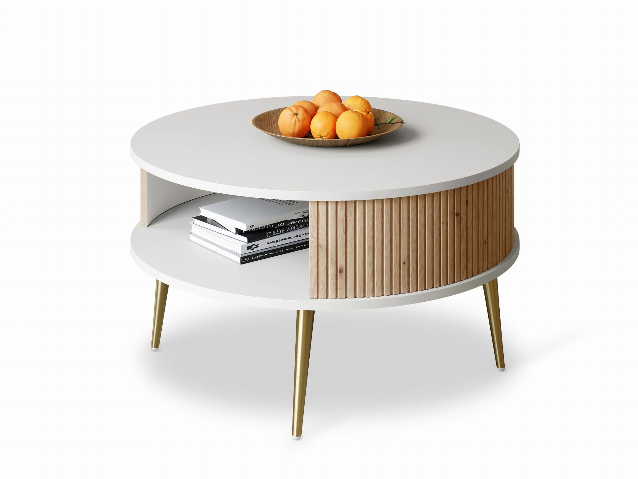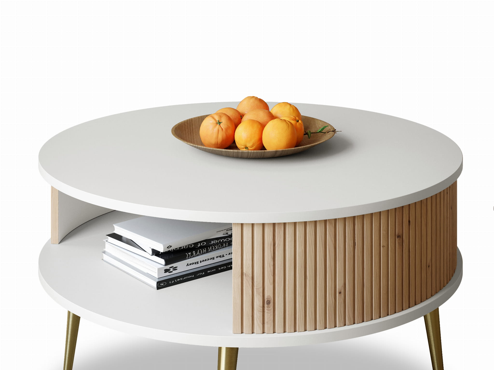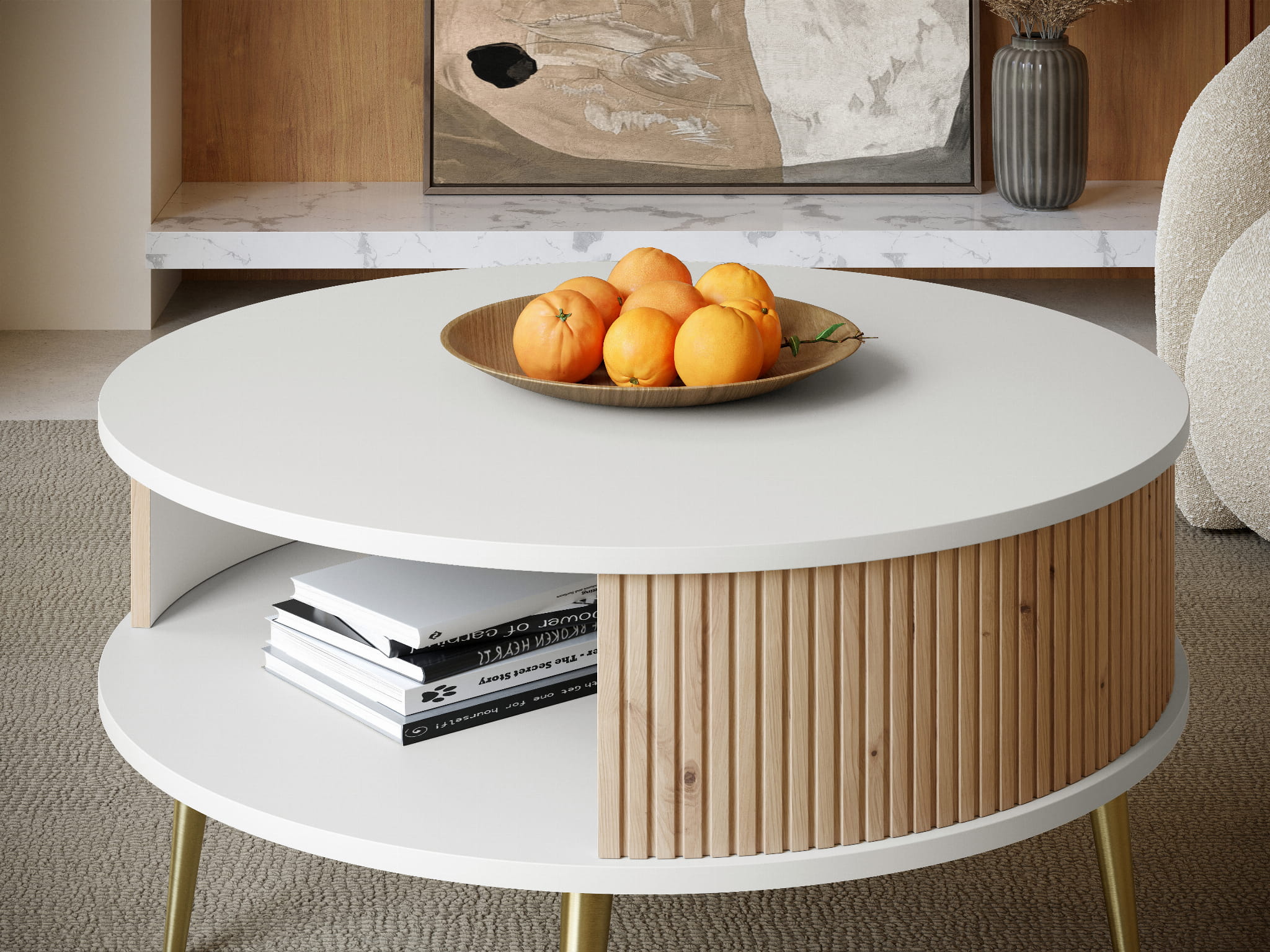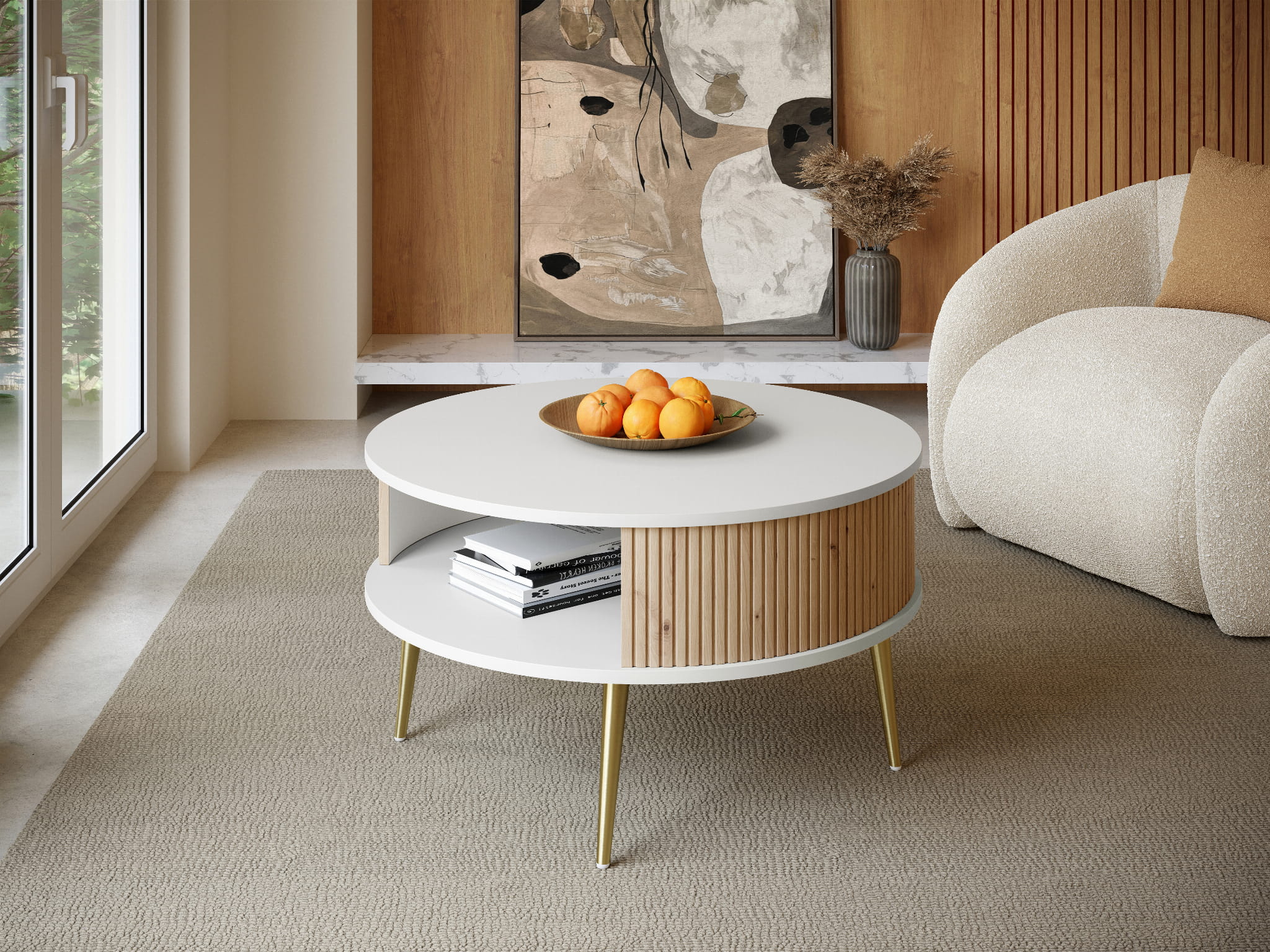 Stolik kawowy Mizo Gold – biały blat, ryfle w dekorze dąb artisan i złote nogi. Okrągła forma, elegancja i praktyczna półka w jednym meblu.