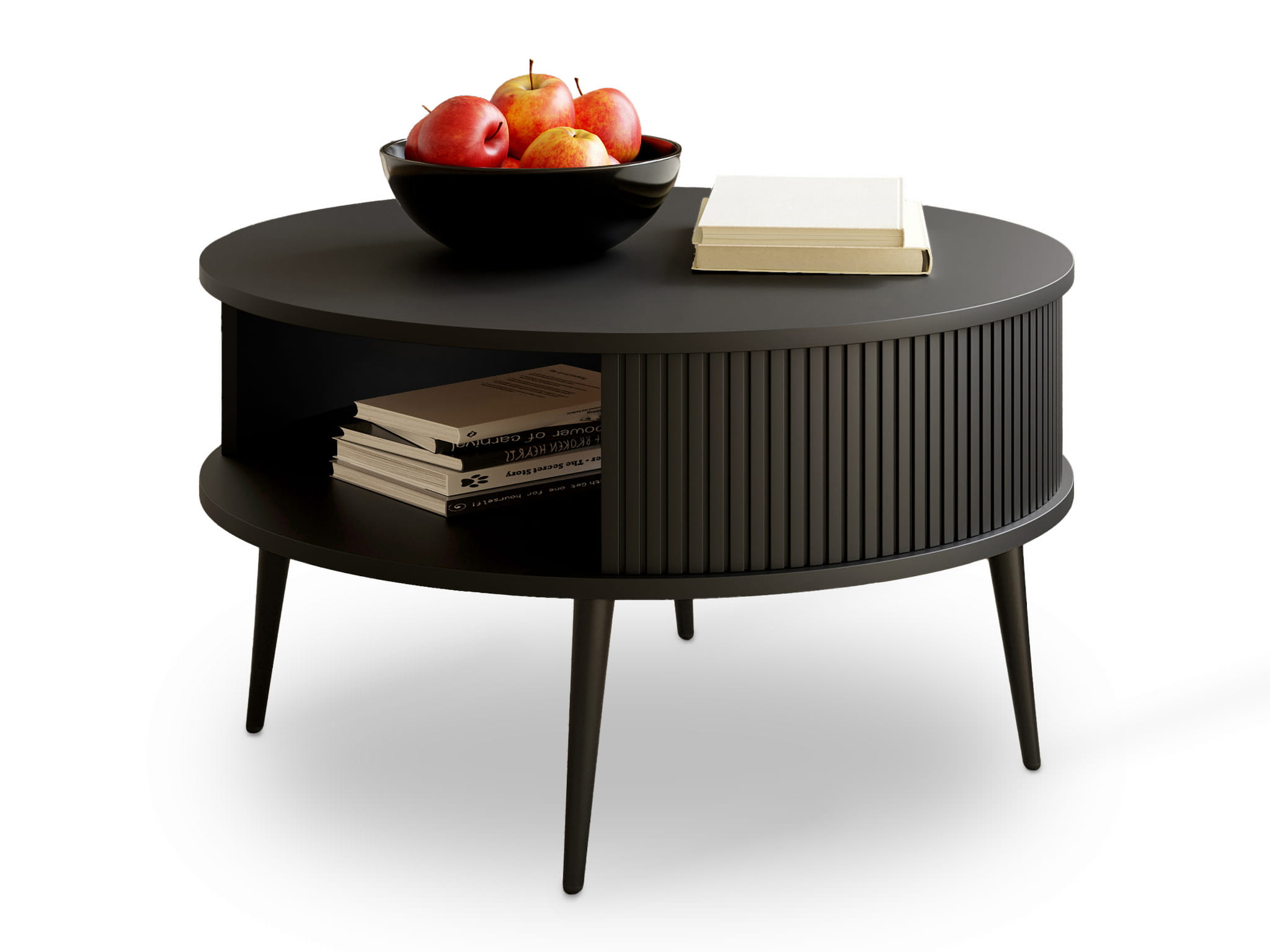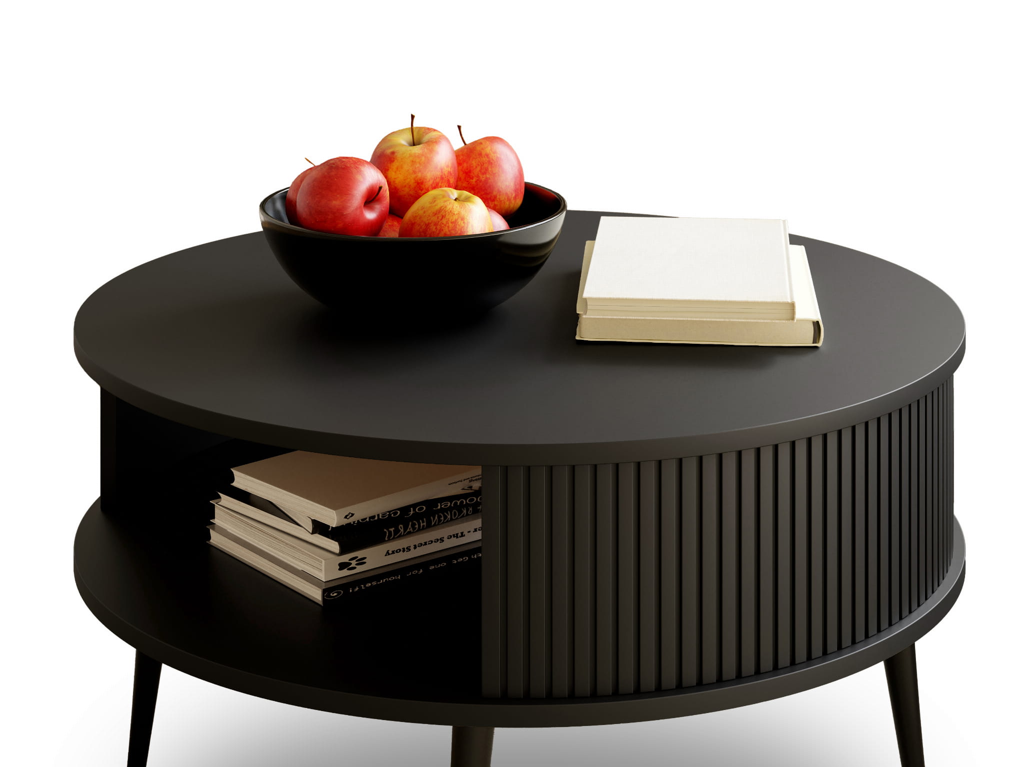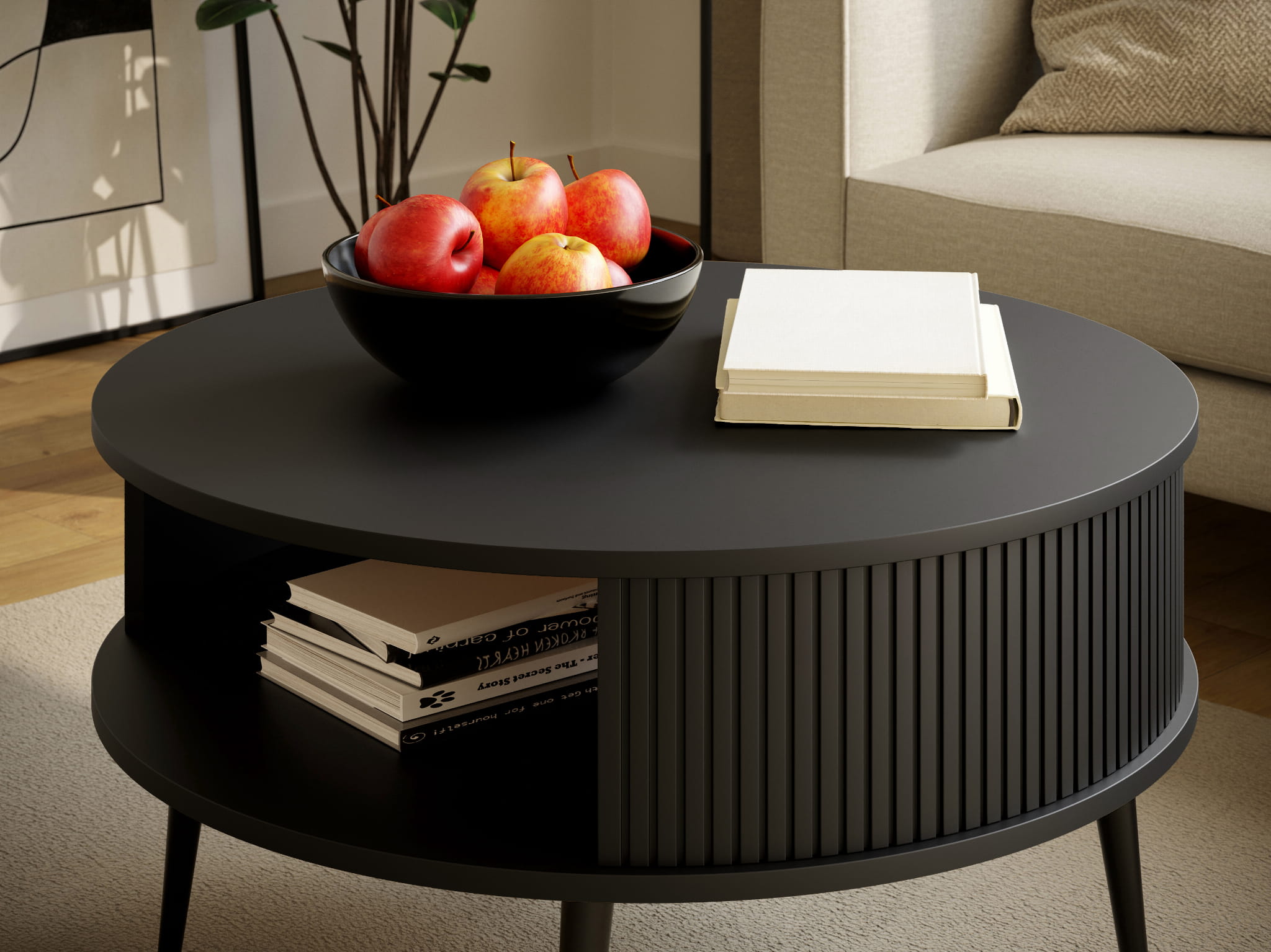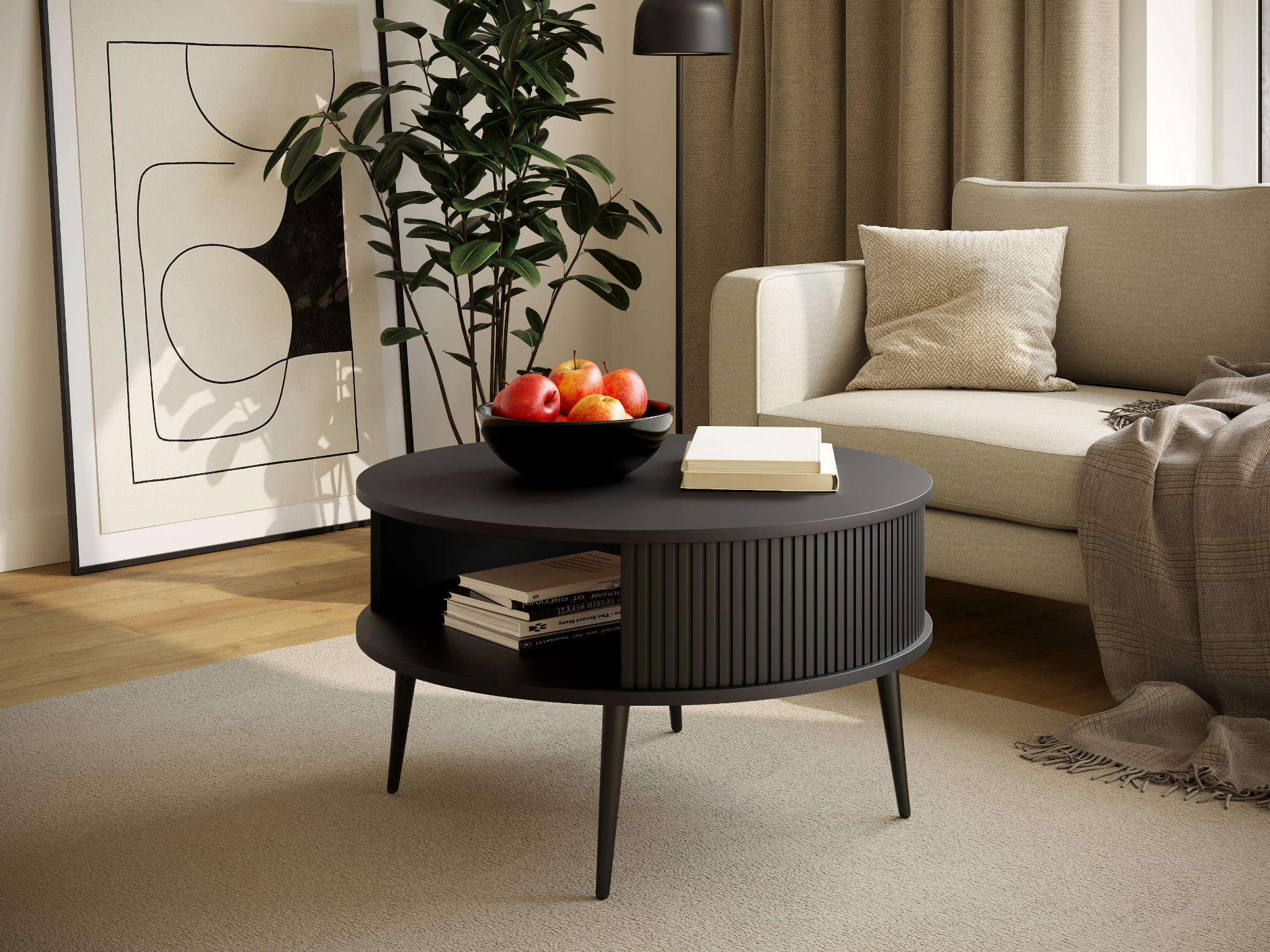 tolik kawowy Mizo Czarny to kwintesencja nowoczesnego minimalizmu. Oba blaty wykończone w czerni podkreślają elegancję i prostotę, a ryfle i ich wnętrze w tym samym odcieniu nadają całości spójności. Czarne metalowe nogi wzmacniają stabilność konstrukcji, a ich smukła forma dodaje lekkości.