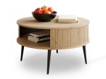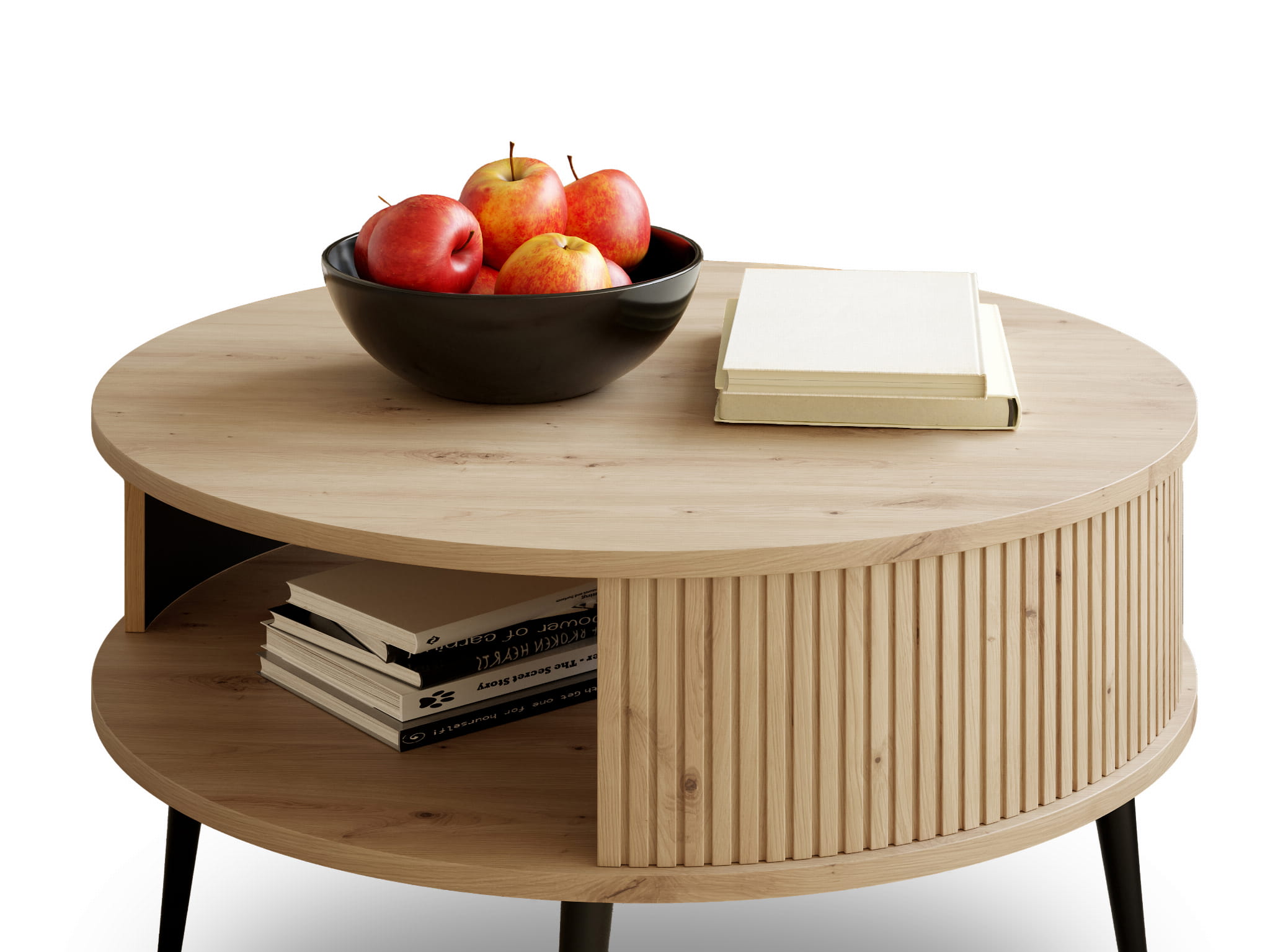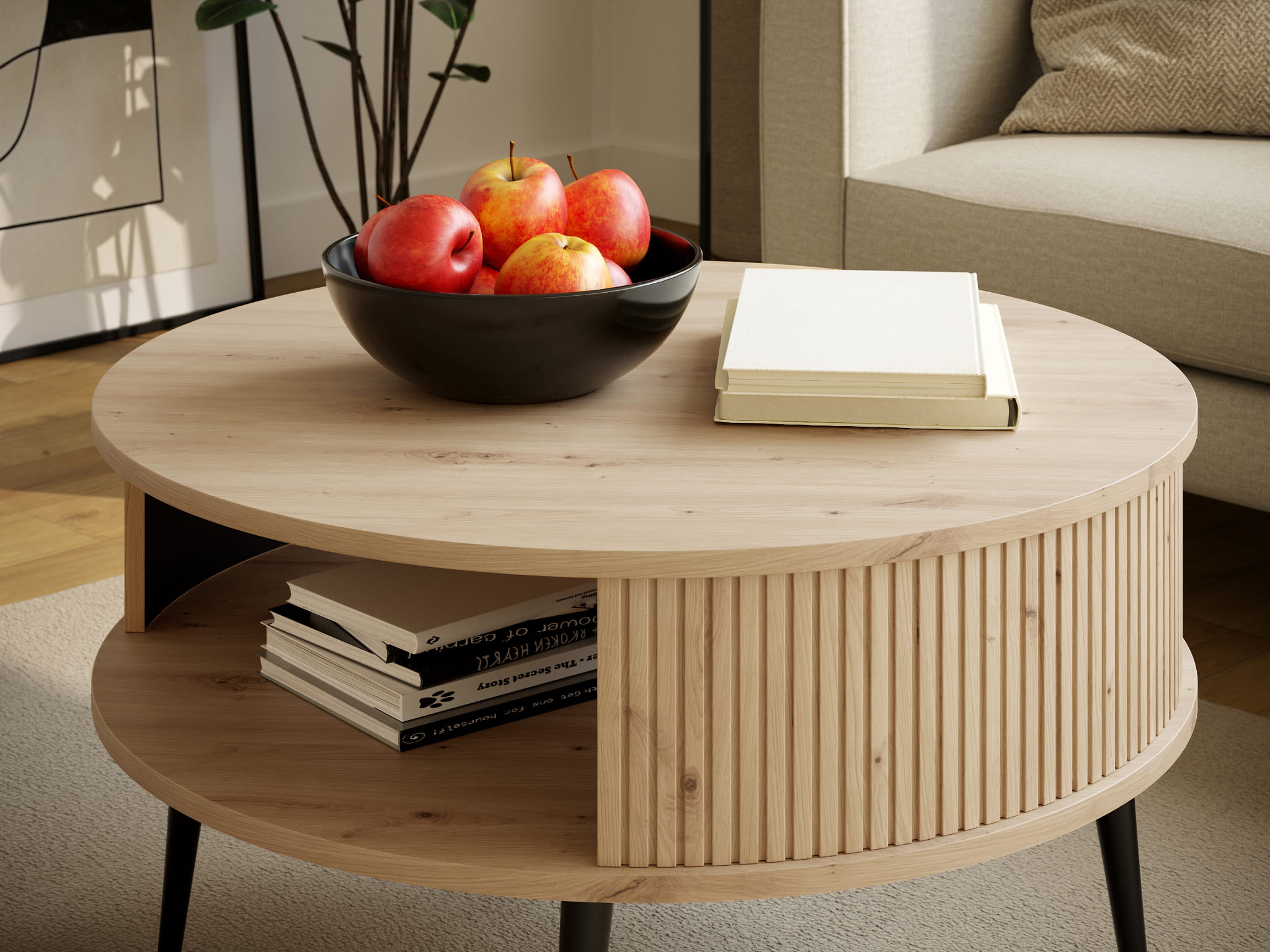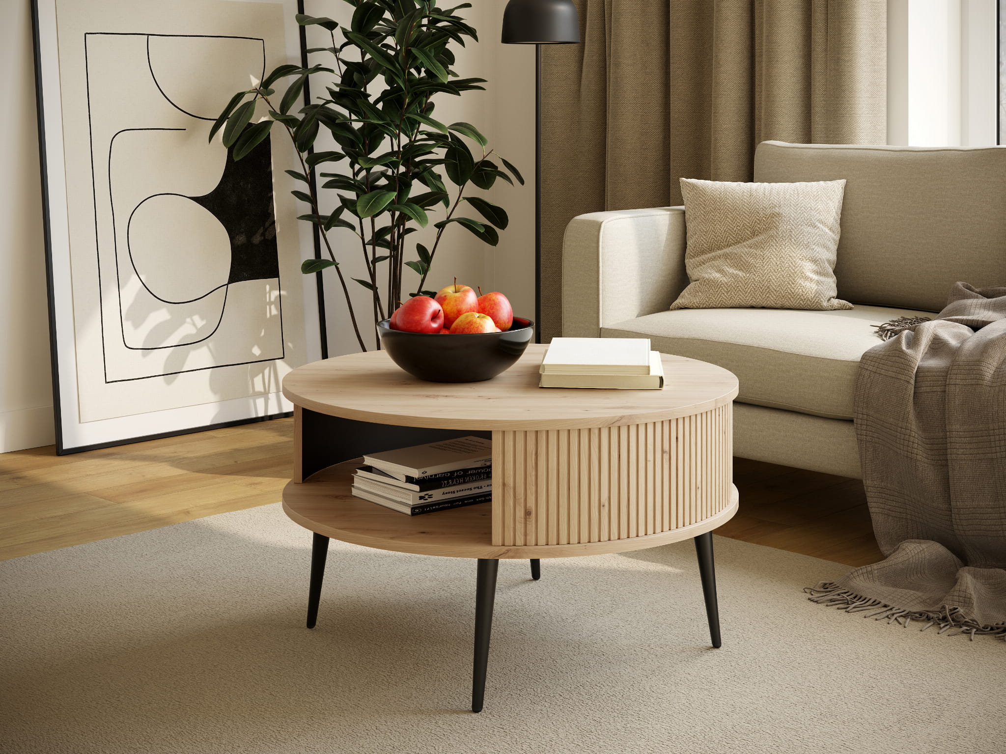 Stolik kawowy Mizo Dąb Artisan to połączenie ponadczasowego wzoru drewna z nowoczesną formą. Okrągłe blaty wykończone w dekorze dąb artisan pięknie eksponują drewniany wzór tworząc ciepły, naturalny akcent w salonie. Ryfle w tym samym odcieniu wzmacniają efekt spójności, a ich czarne wnętrze dodaje meblowi wyrazistości. Całość dopełniają czarne, metalowe nogi, które zapewniają stabilność i podkreślają nowoczesny charakter stolika.