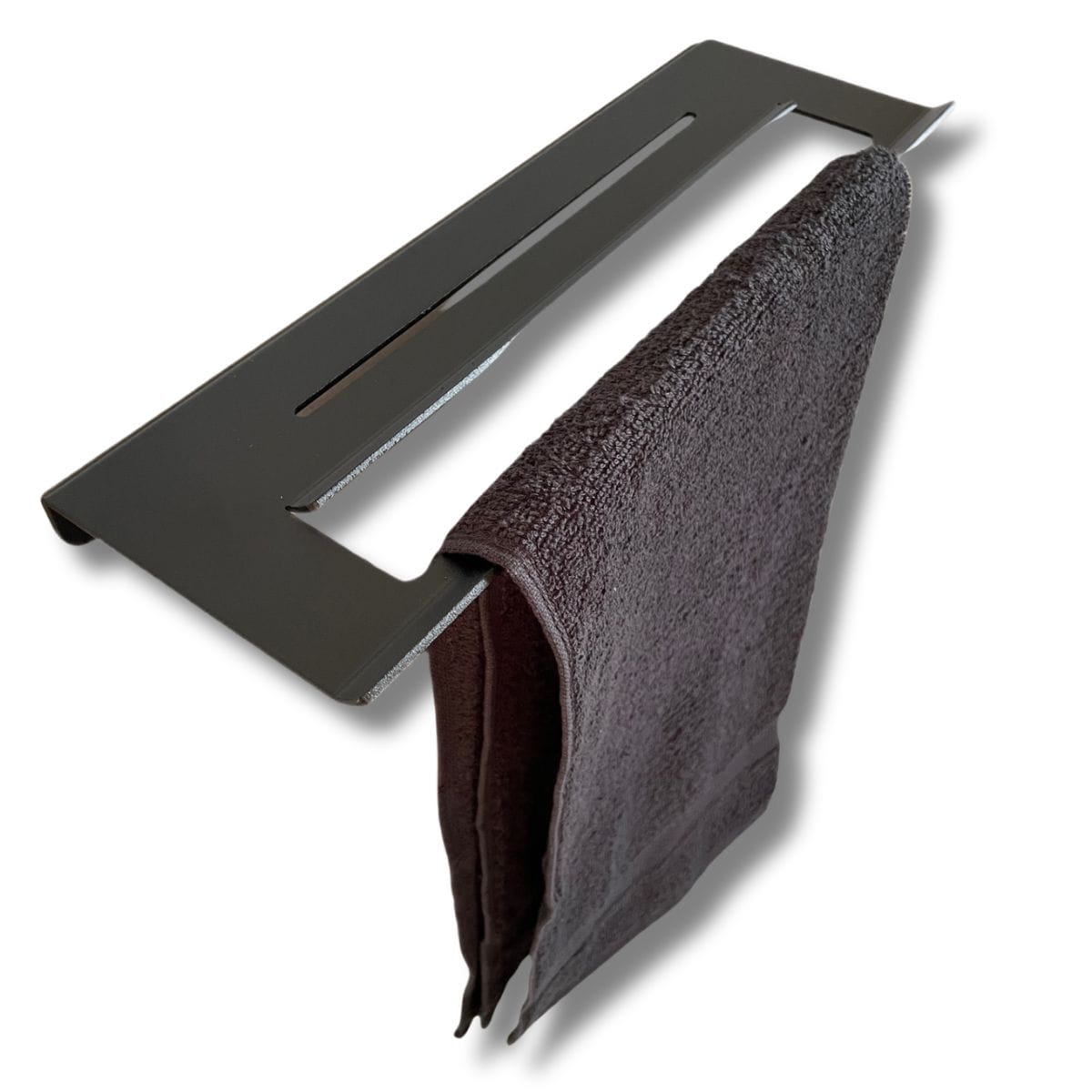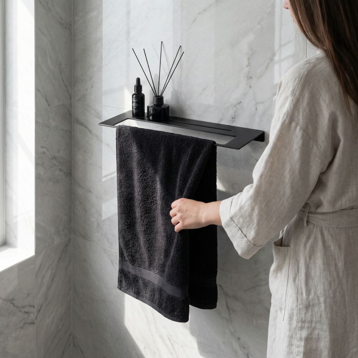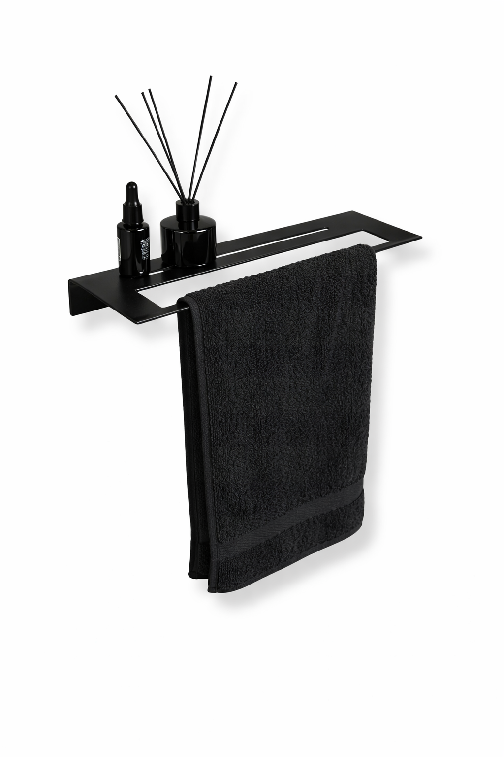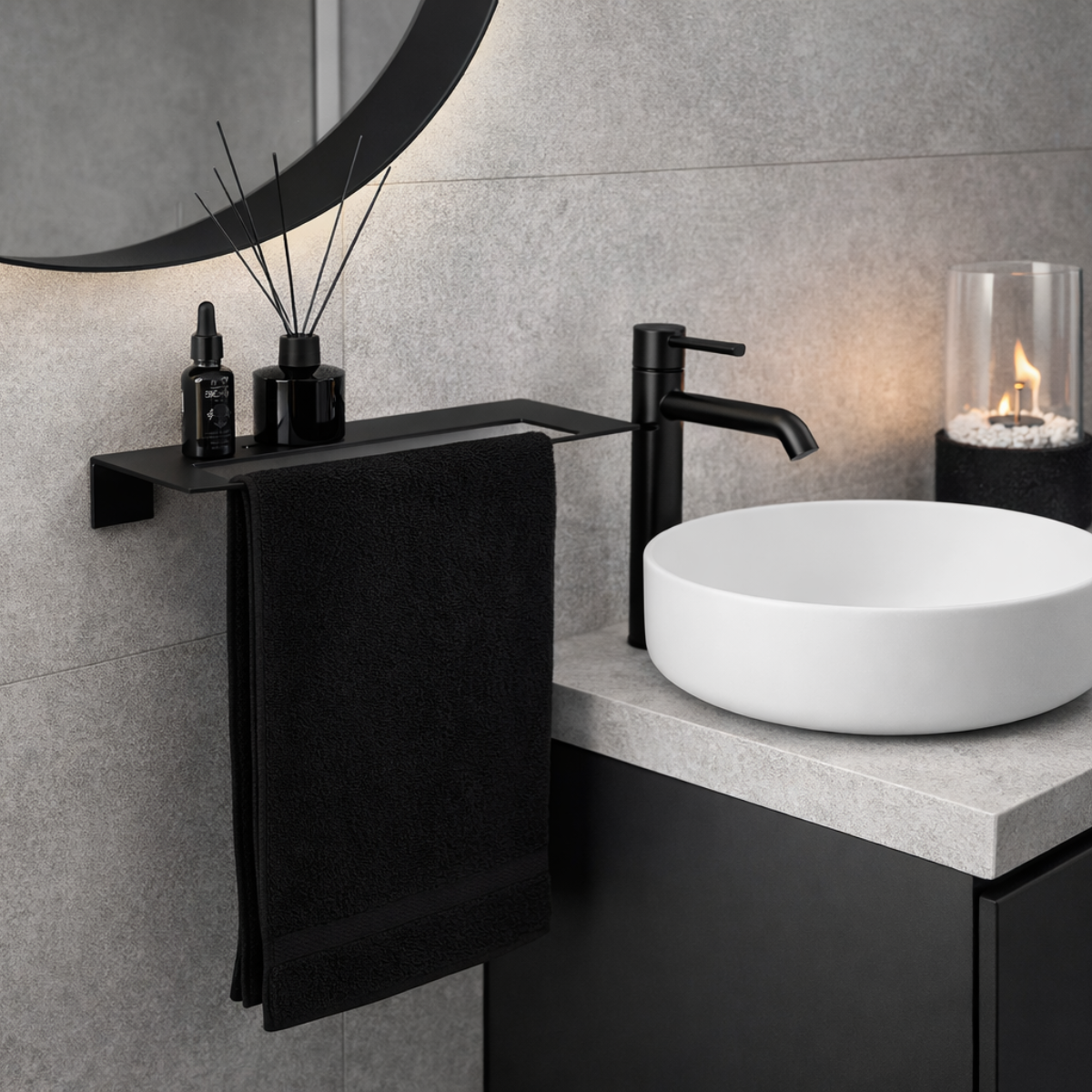 Półka Basu to minimalistyczna półka łazienkowa z solidnym uchwytem na ręcznik, wykonana z wysokiej jakości materiałów odporna na wilgoć. Czarny, aluminiowy uchwyt i stonowana forma wprowadzają do łazienki spokojną estetykę i praktyczne rozwiązania. Produkt wykonywany jest na indywidualne zamówienie.
