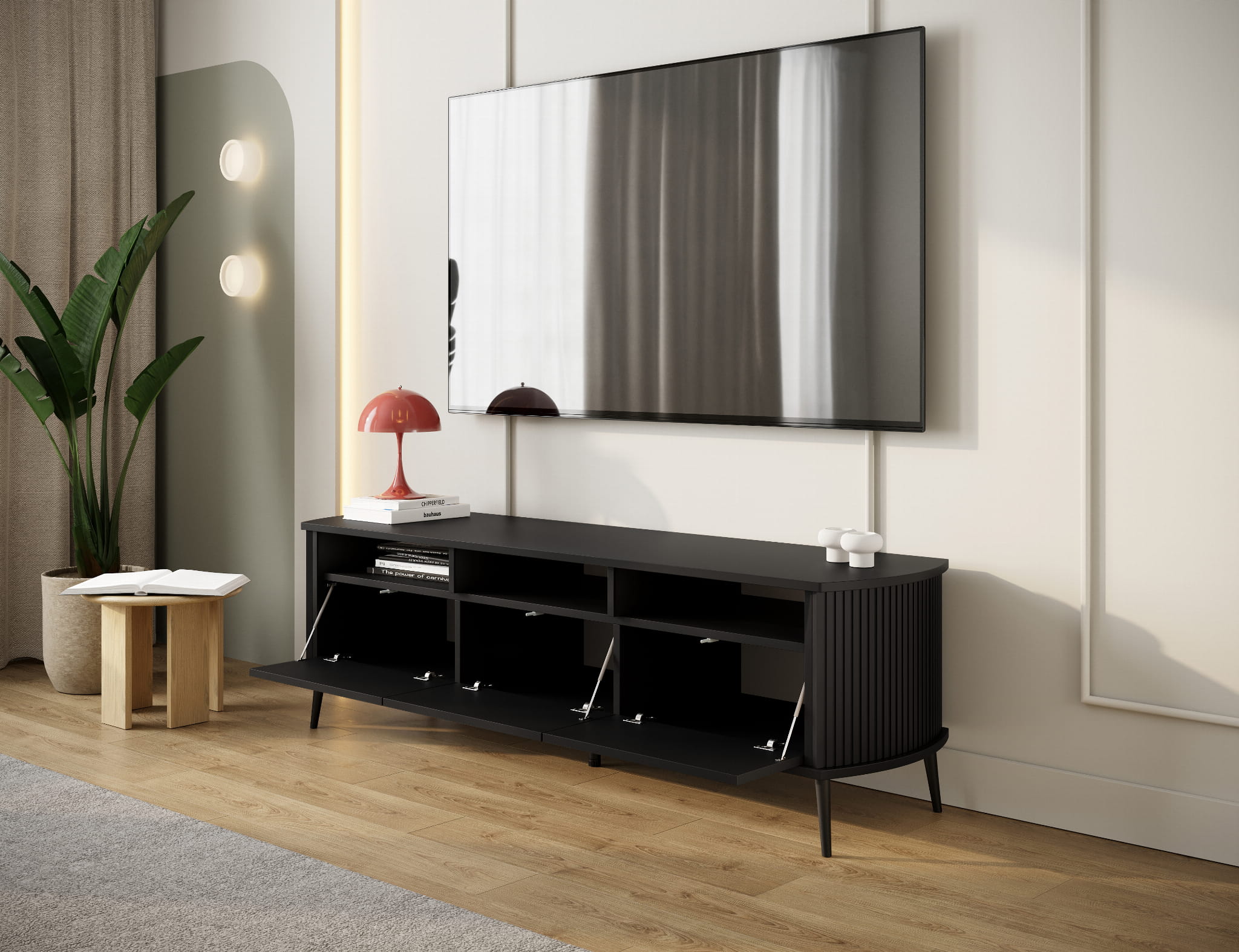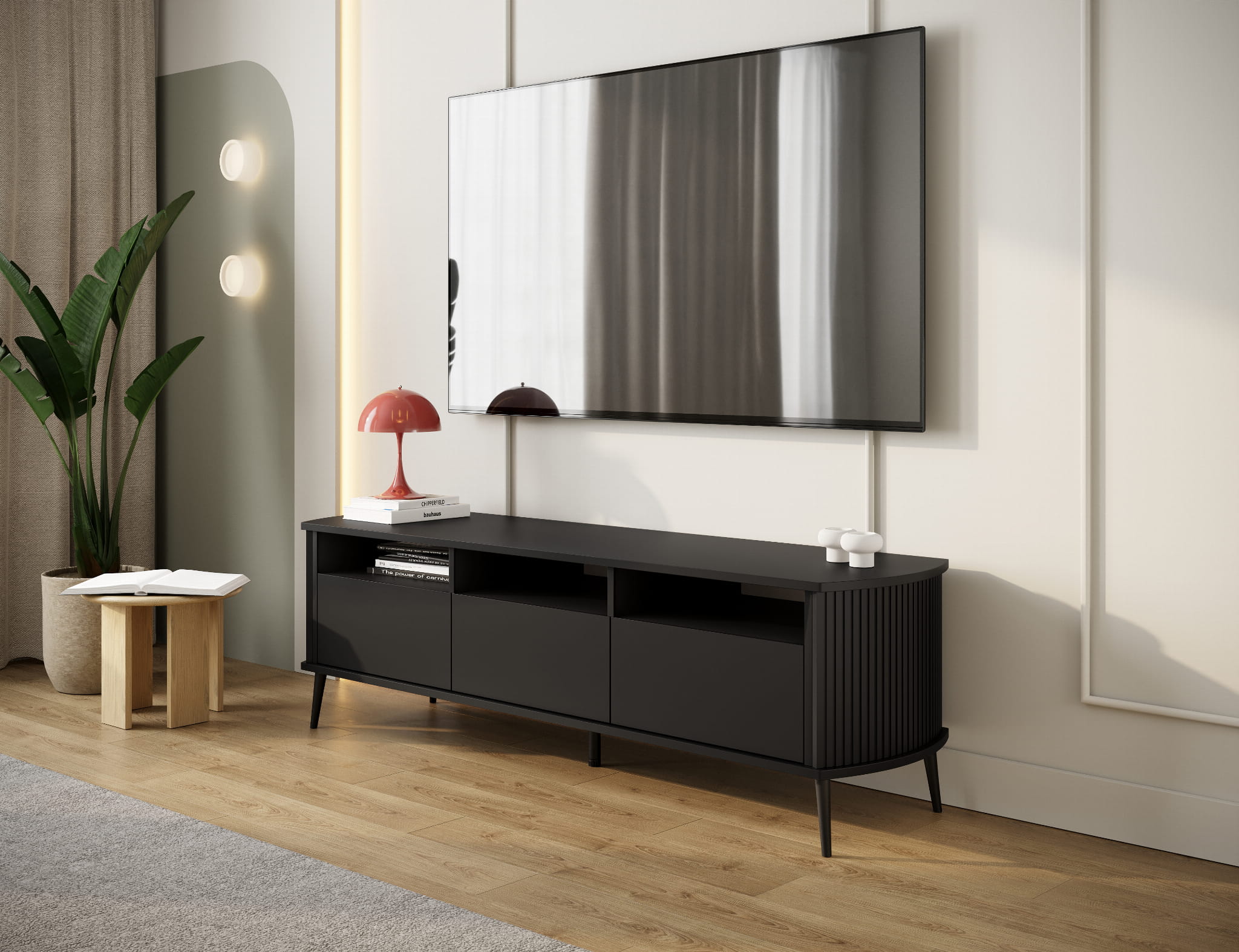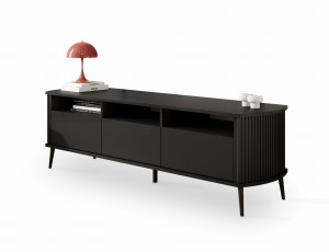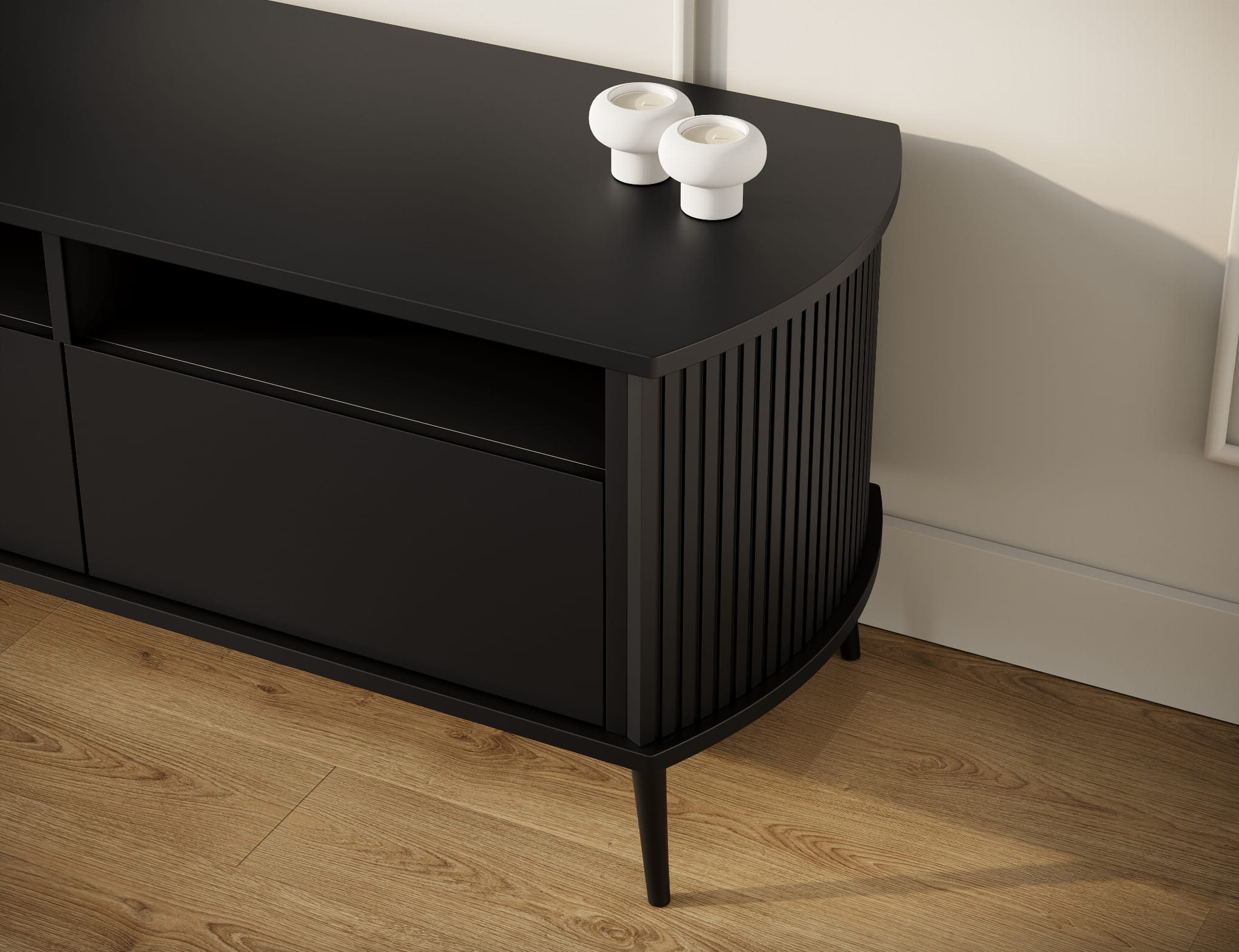 RTV Mizo Czarny – elegancka szafka z ryflowanymi bokami i czarnymi nogami. Praktyczne miejsce na sprzęt i dekoracje, które podkreśli nowoczesny charakter salonu.