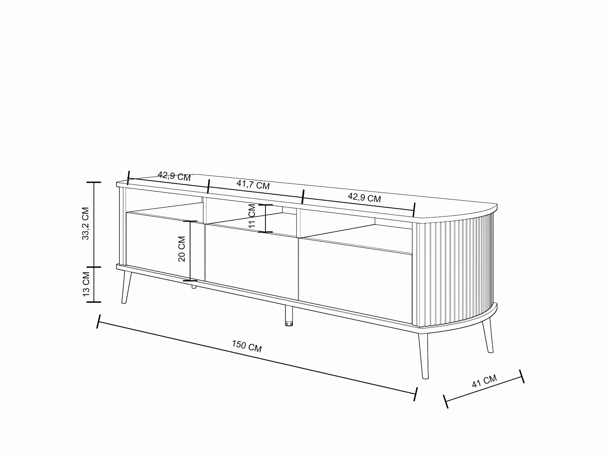 Szafka RTV Mizo Czarny to nowoczesny mebel, który łączy minimalistyczny design z wysoką funkcjonalnością. Jej szerokość 150 cm zapewnia wystarczająco dużo miejsca na telewizor, sprzęt multimedialny i dekoracje, a ryflowane boki w czerni dodają elegancji i głębi.
