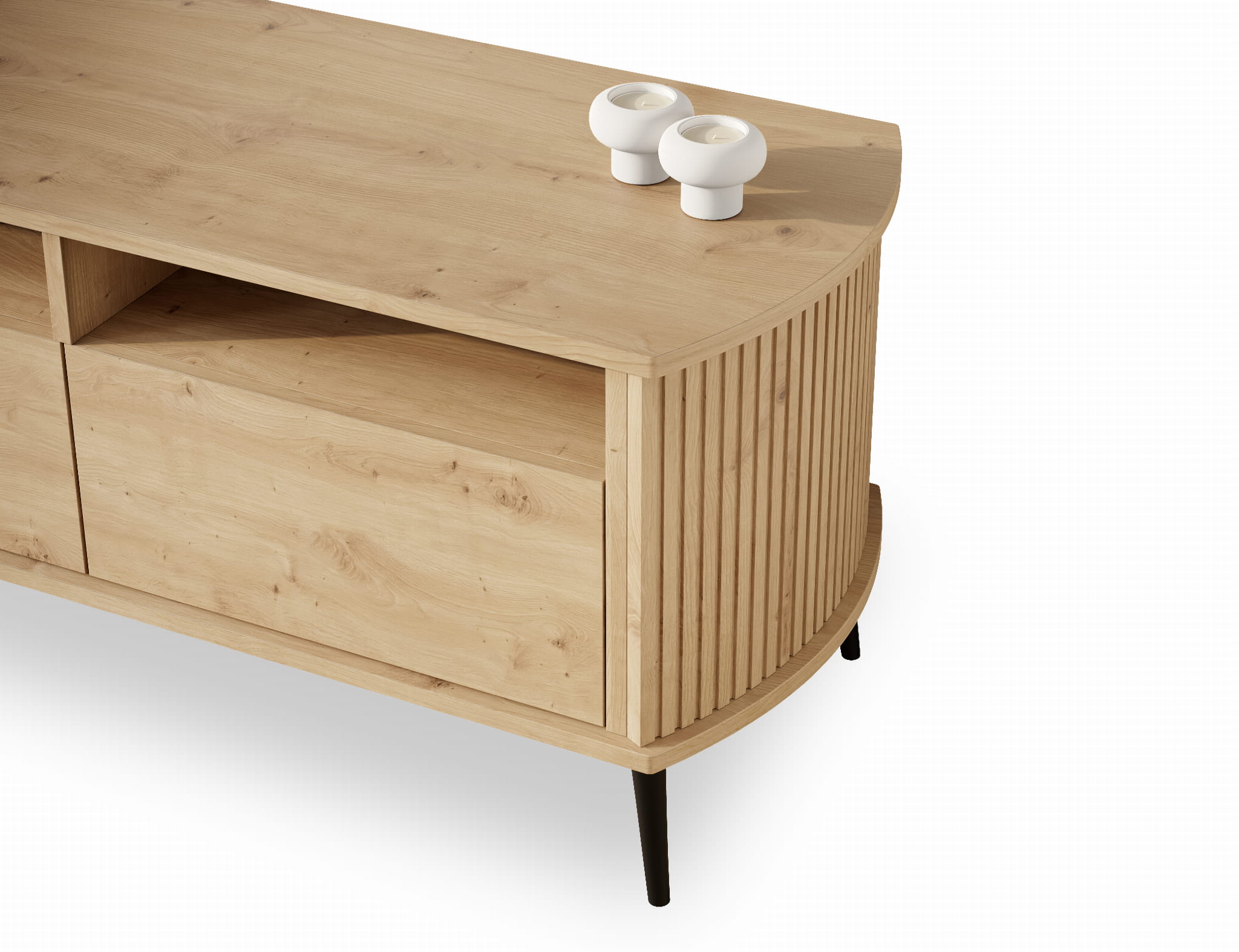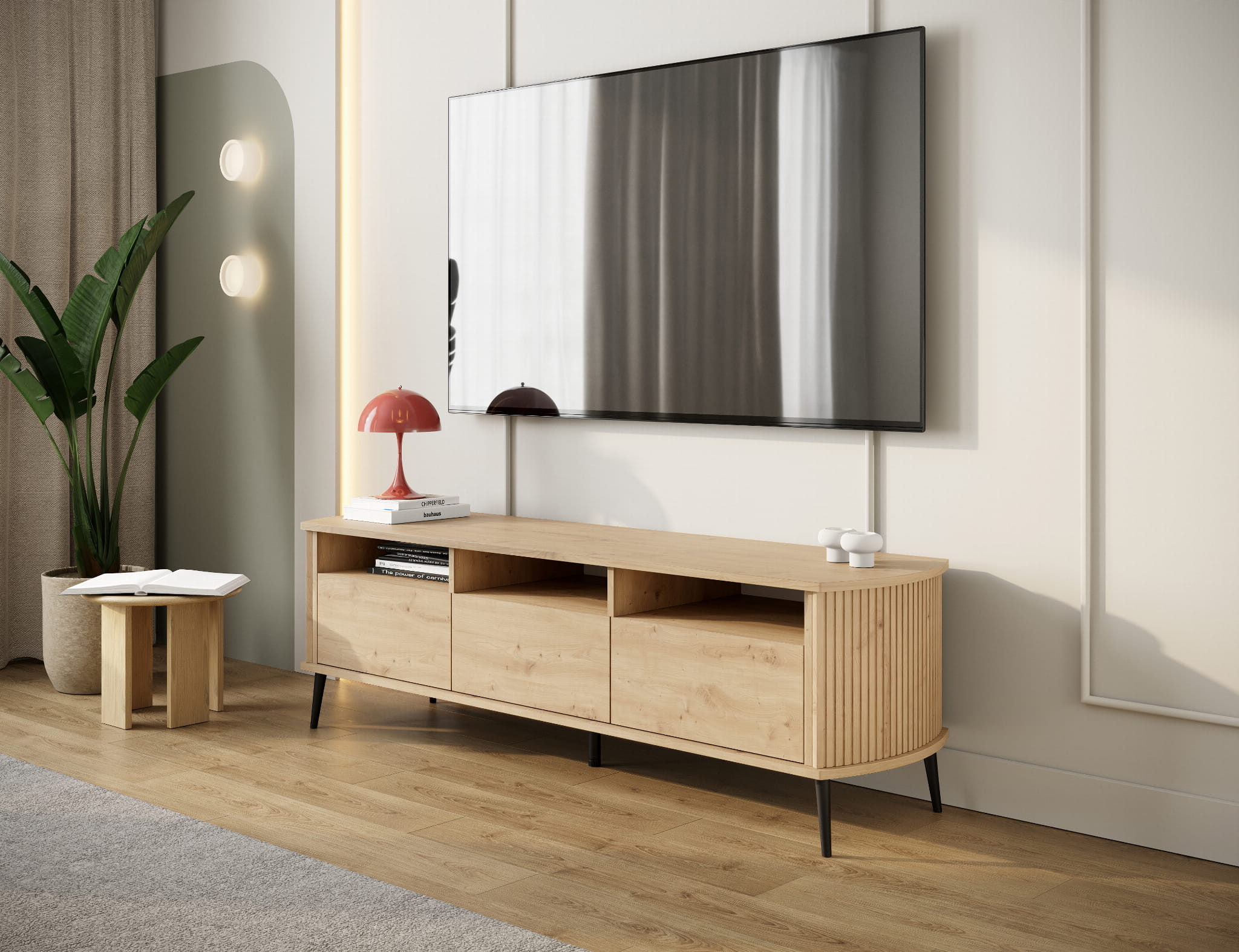 RTV Mizo Dąb Artisan – szafka o naturalnym dekorze drewna i ryflowanych bokach. Praktyczne miejsce na sprzęt i ozdoby, które ociepli każde wnętrze.
