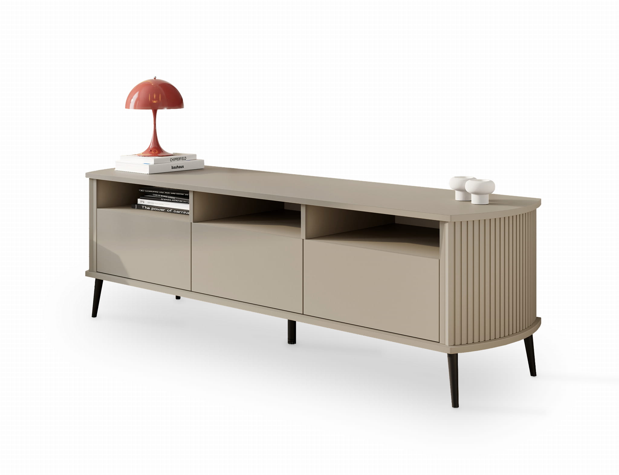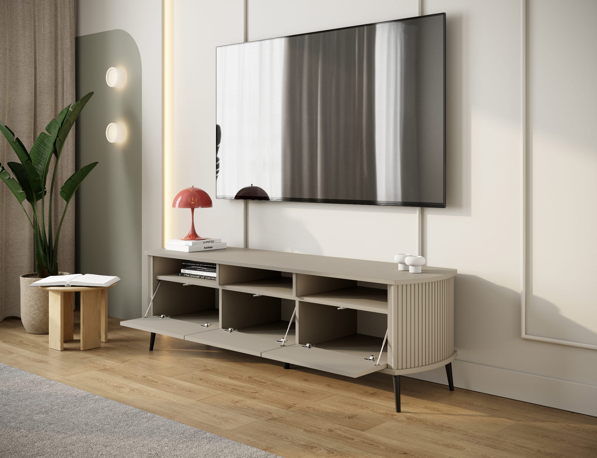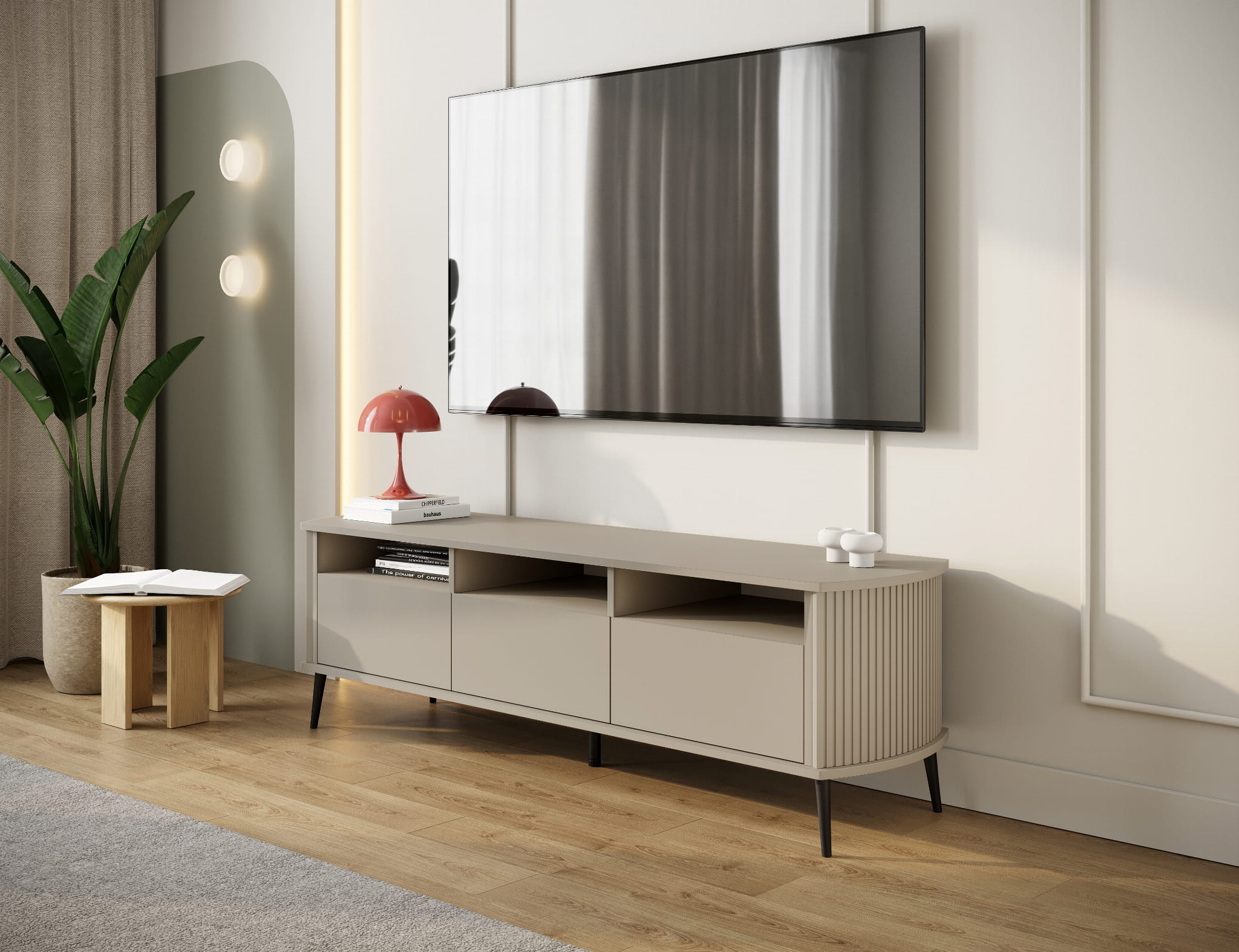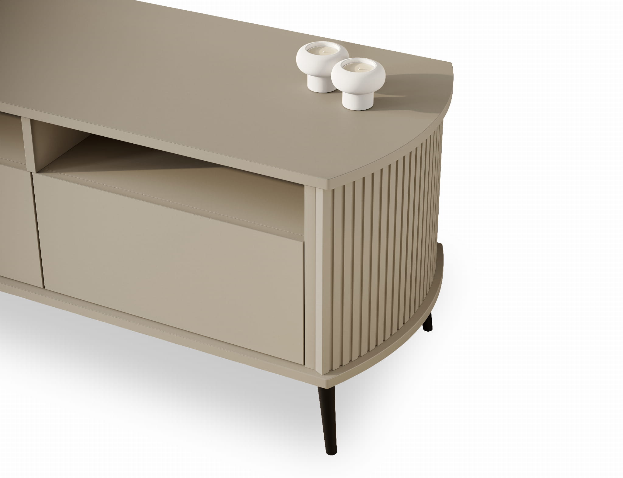 RTV Mizo Kaszmir – elegancka szafka w beżowym odcieniu kaszmiru z ryflowanymi bokami. Stylowe miejsce na telewizor, dekoracje i sprzęt w przytulnym wnętrzu.