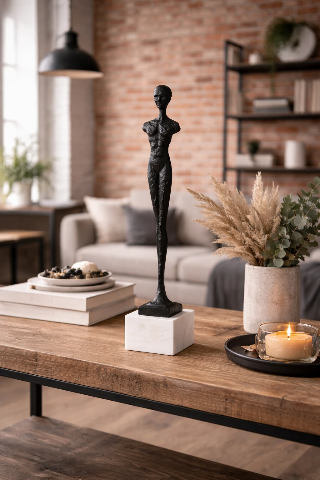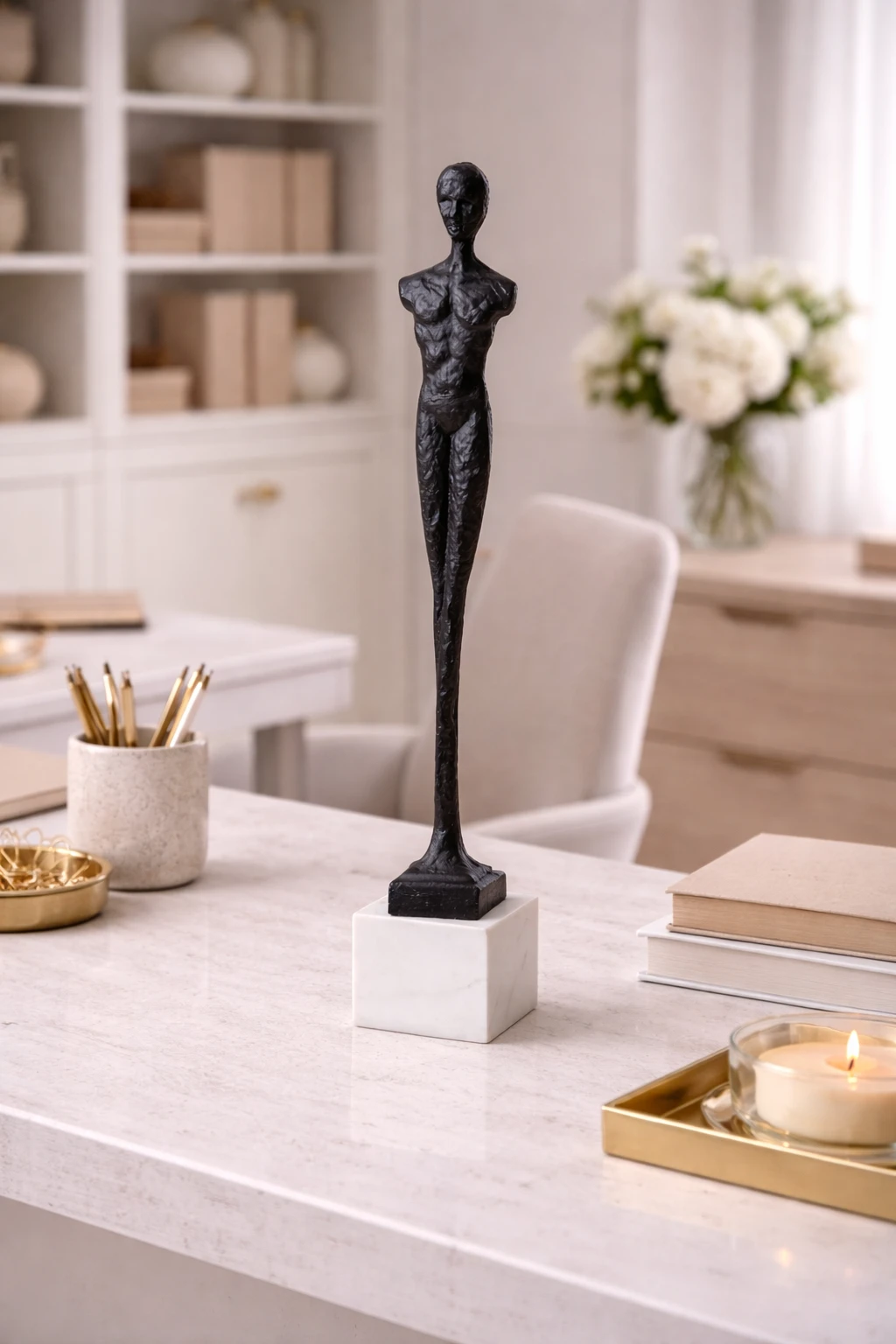 Dzięki imponującej wysokości (46 cm), rzeźba staje się dominującym punktem w każdym pomieszczeniu. Doskonale odnajdzie się w reprezentacyjnym salonie, nowoczesnym gabinecie prezesa czy minimalistycznym holu. Jej smukła forma pozwala na ekspozycję na wąskich konsolach, regałach bibliotecznych czy biurkach, wprowadzając do przestrzeni pionową dynamikę i luksusowy sznyt.