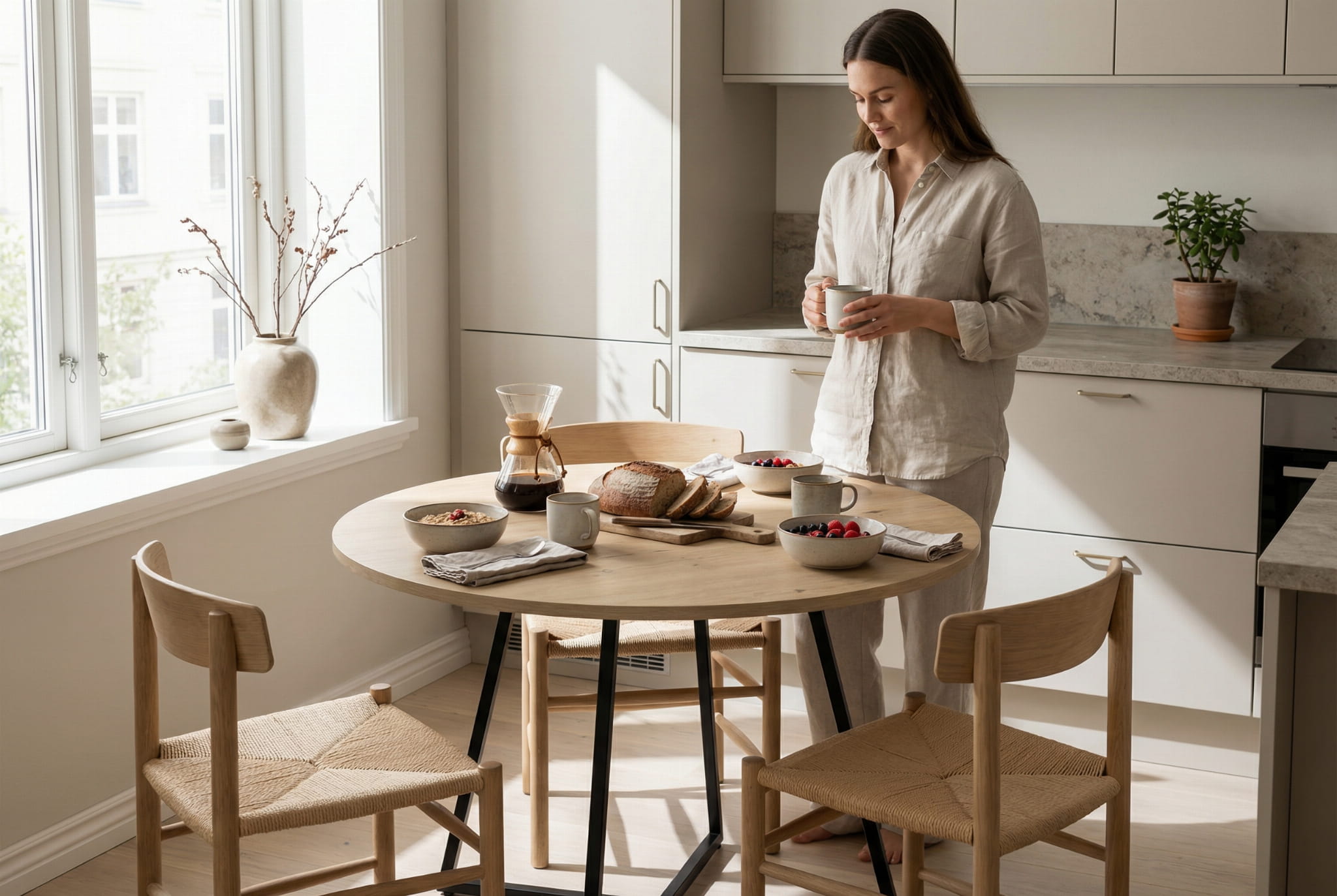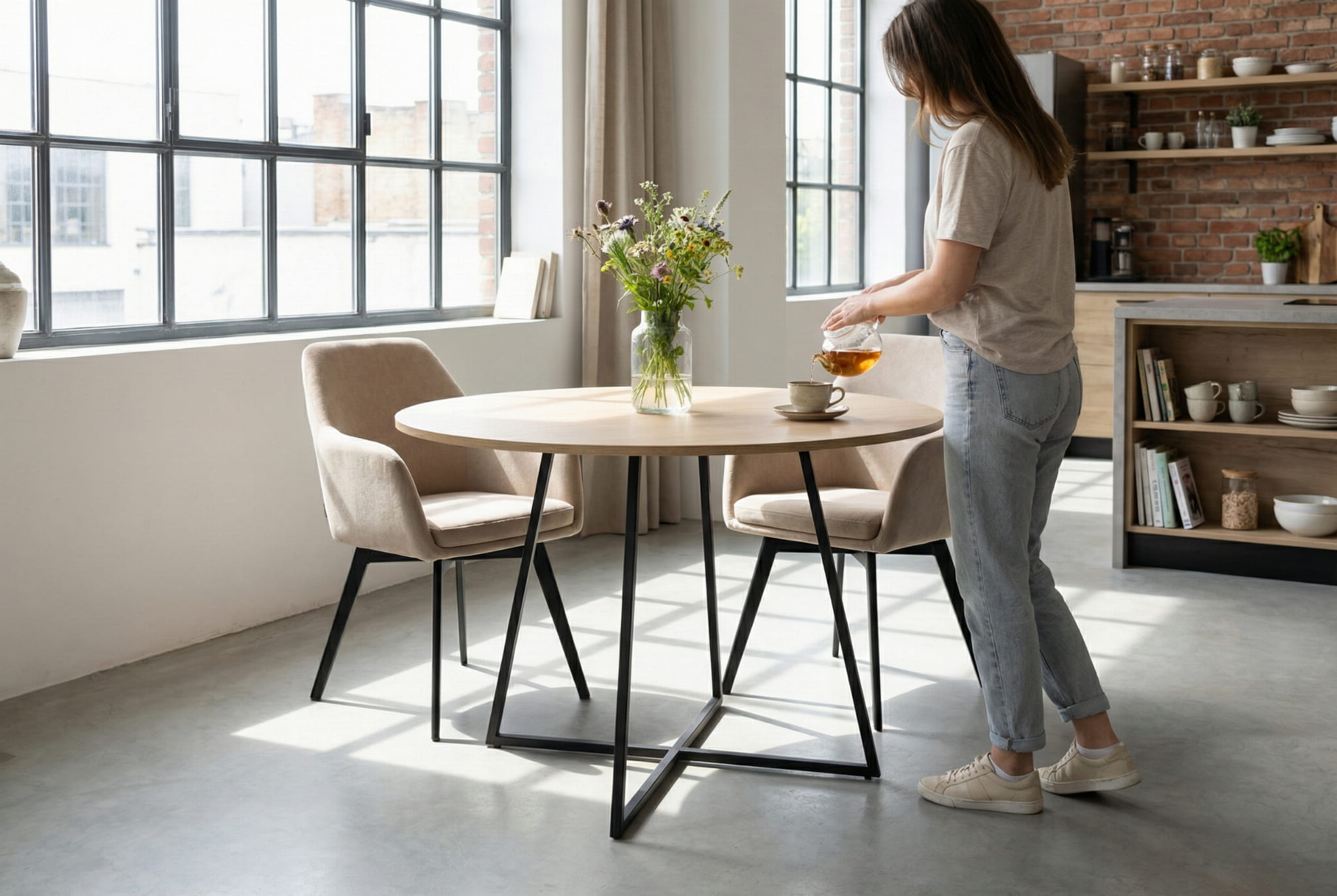 Okrągły blat o średnicy 90 cm sprzyja bliskości i rozmowom — idealny do wspólnych posiłków, pracy przy kawie czy wieczornych spotkań z bliskimi. Stabilny stelaż z metalu malowanego proszkowo na czarno nadaje całości nowoczesny charakter i zapewnia trwałość użytkowania.