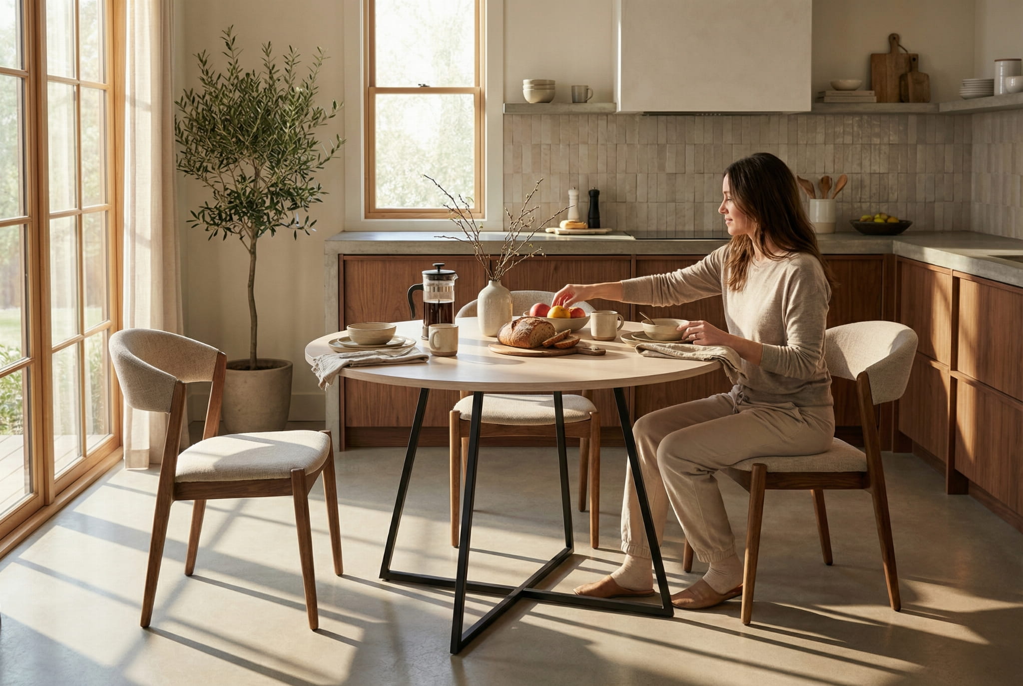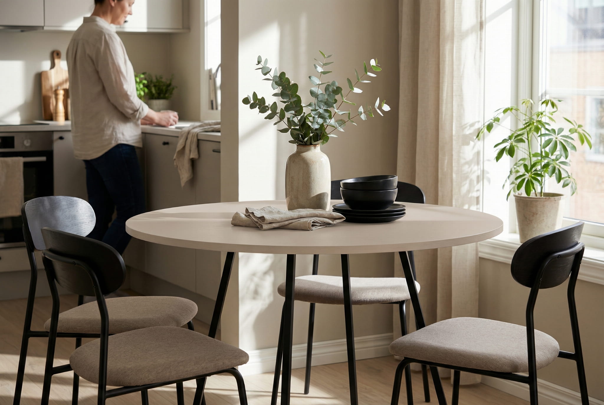 Średnica 90 cm sprzyja codziennym spotkaniom: porannej kawie, wspólnym posiłkom czy rozmowom przy winie. Okrągła forma naturalnie integruje domowników i gości, tworząc przyjazną, otwartą przestrzeń. Sanka to mebel, który pasuje do nowoczesnych mieszkań, modnych lokali i wnętrz inspirowanych stylem japandi, soft loft czy contemporary.