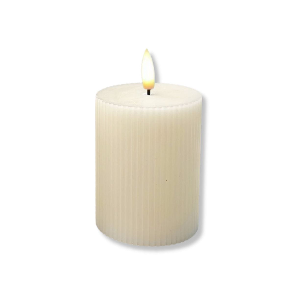 Świeca dekoracyjna Hano S w kolorze białym z delikatnymi żłobieniami tworzy przytulny klimat bez otwartego ognia. Zasilana na baterie AAA i sterowana pilotem – idealna do codziennego relaksu i nastrojowych aranżacji.
