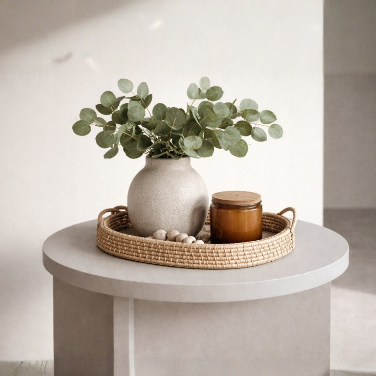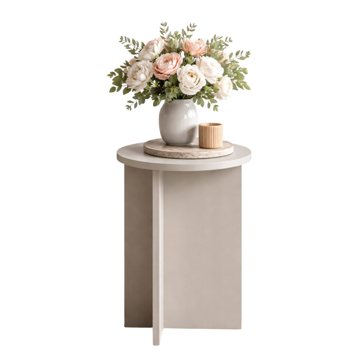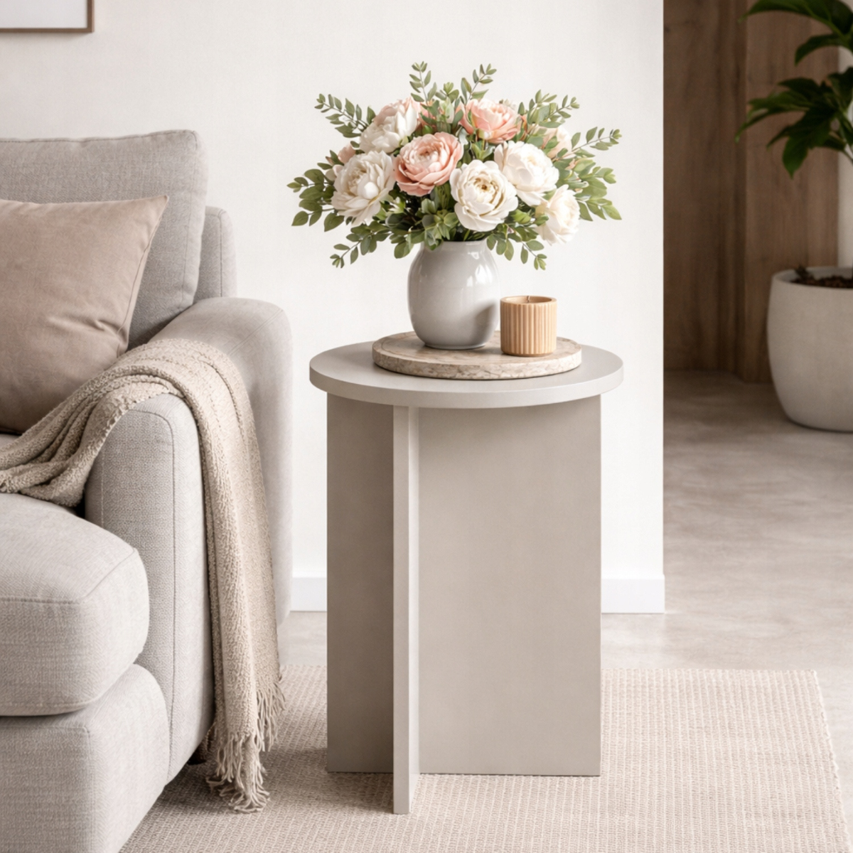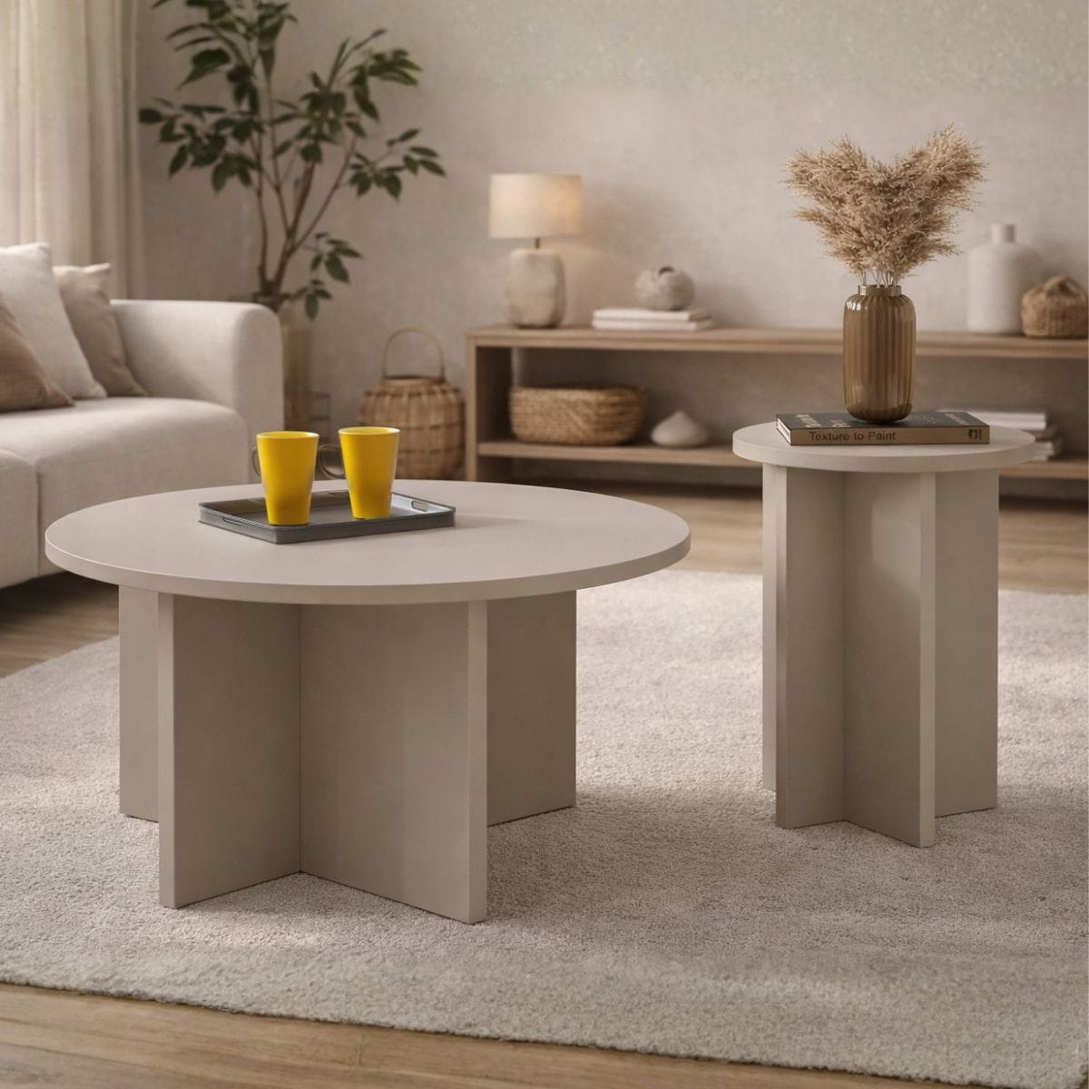 Okrągły stolik Tami w kolorze kaszmir to subtelny akcent do nowoczesnych wnętrz — lekki, harmonijny i gotowy, by stać się ulubionym miejscem na kawę, dekoracje lub relaks. Jego minimalistyczna forma wpisuje się w styl japandi, skandynawski i soft minimal.