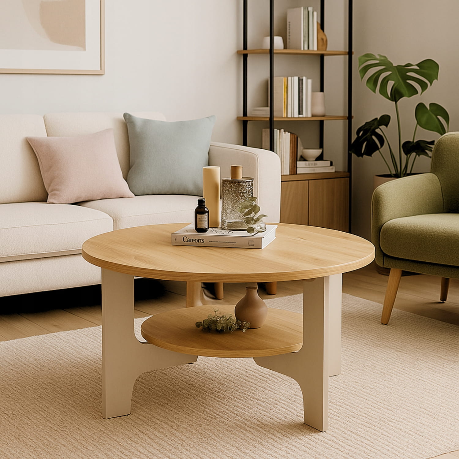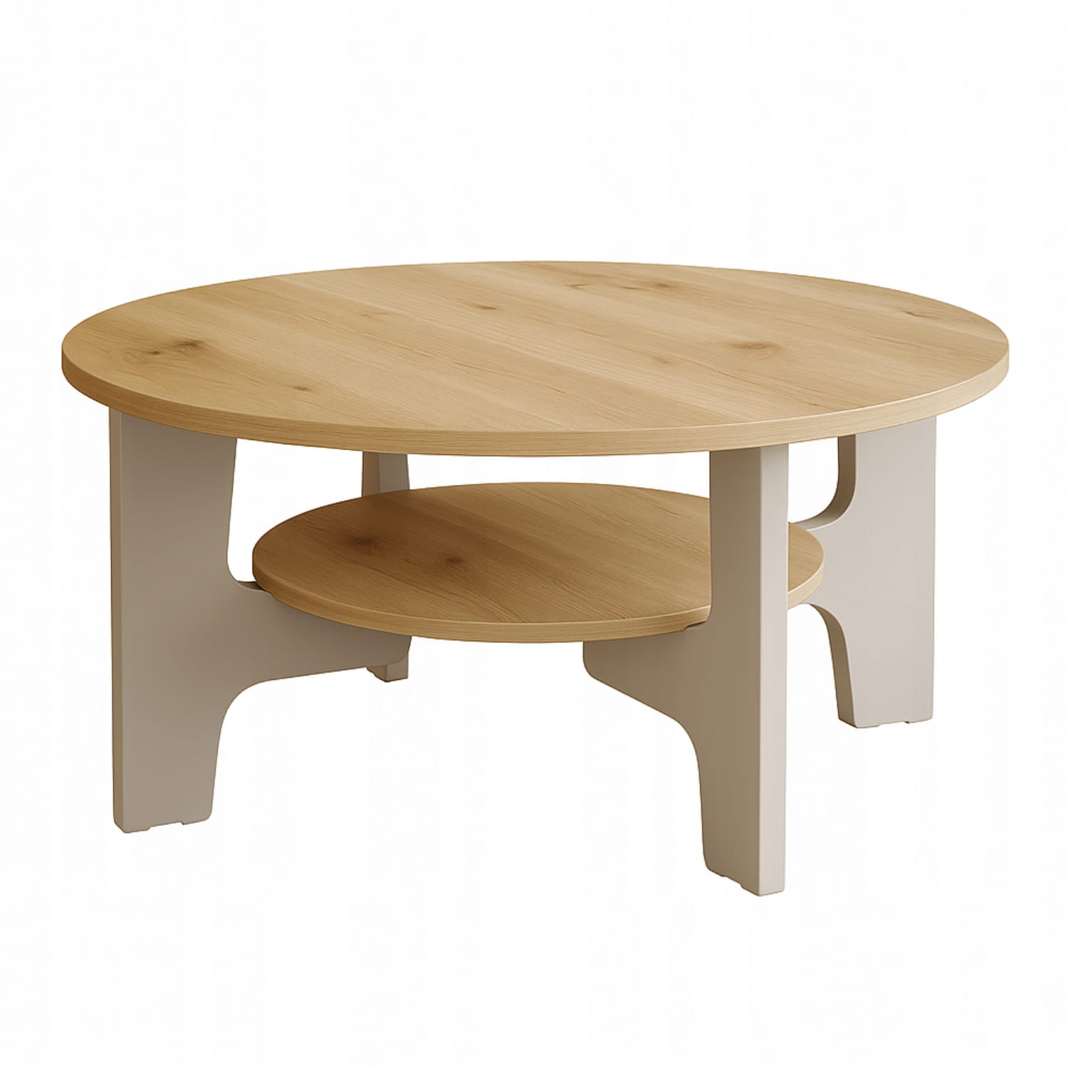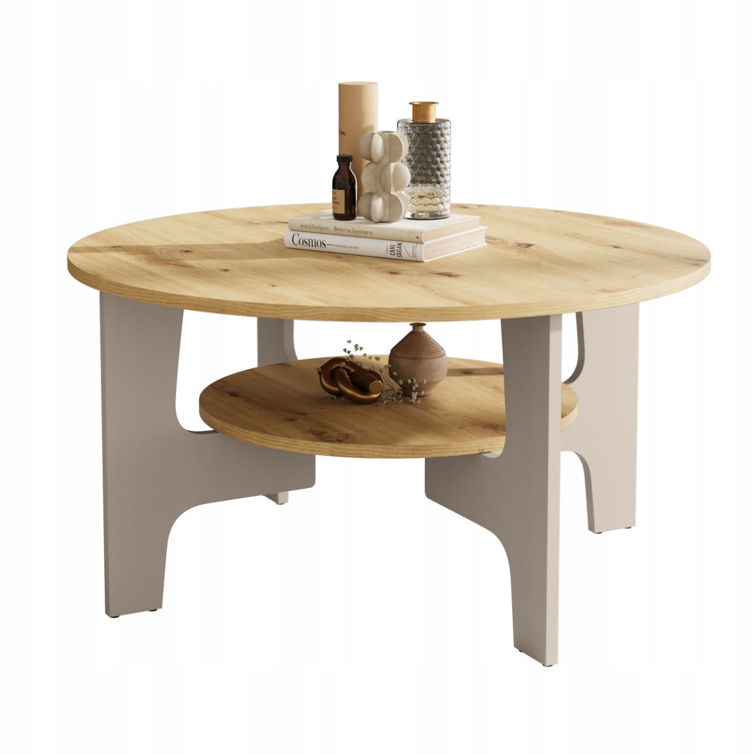 Stolik kawowy Tanka Dąb Artisan / Kaszmir to wyjątkowe zestawienie naturalnego charakteru drewna z subtelnością beżowych tonów. Okrągły blat o średnicy 80 cm w dekorze dąb artisan wprowadza do wnętrza przytulność i ciepło. Został zestawiony z nogami w odcieniu kaszmiru, które dodają całości elegancji i nowoczesnego charakteru. To połączenie sprawia, że stolik staje się uniwersalnym elementem wystroju – pasującym zarówno do aranżacji klasycznych, jak i współczesnych.