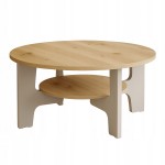 Pod blatem umieszczono dodatkową półkę o średnicy 60 cm, która zwiększa funkcjonalność mebla. Można na niej przechowywać książki, gazety czy drobiazgi, utrzymując porządek na głównej powierzchni. Blat i półka o grubości 1,8 cm zostały wykończone obrzeżem ABS, zapewniającym trwałość i odporność na codzienne użytkowanie.