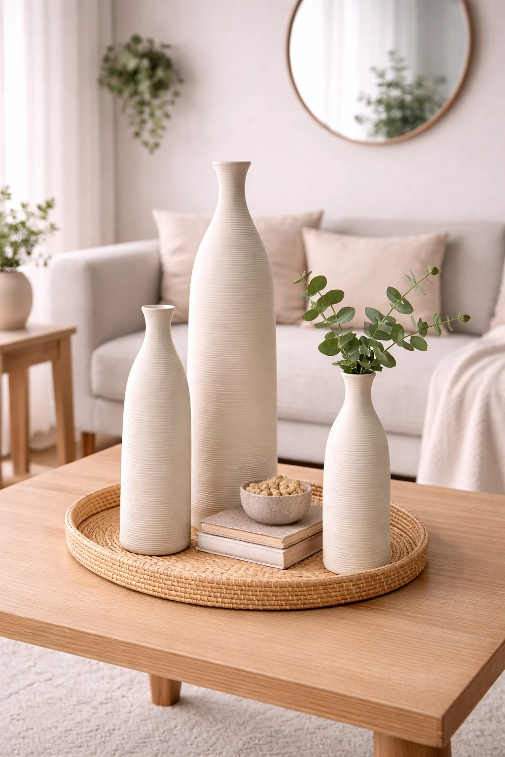 Przy wysokości 46 cm Mira L staje się meblem samym w sobie. Jest to idealny wazon do eksponowania wysokich traw pampasowych, gałęzi magnolii czy dekoracyjnych struktur roślinnych. Dzięki swojej skali, doskonale prezentuje się postawiony bezpośrednio na podłodze przy niskich stolikach kawowych, w narożnikach przestronnych łazienek czy jako centralny punkt w lobby. Jego obecność natychmiast podnosi standard wizualny każdej przestrzeni.