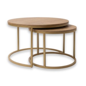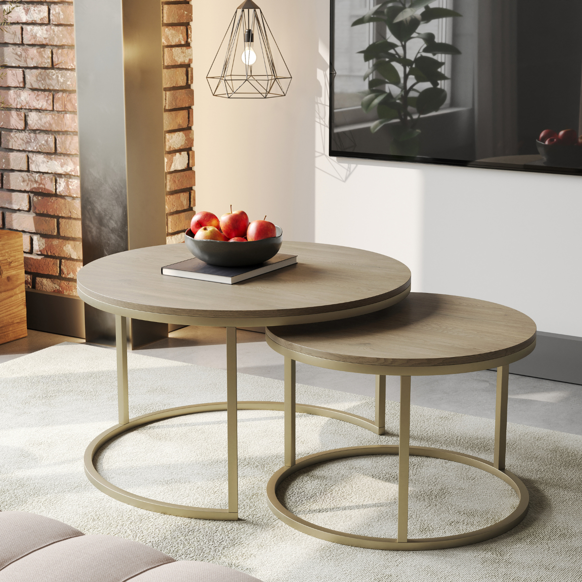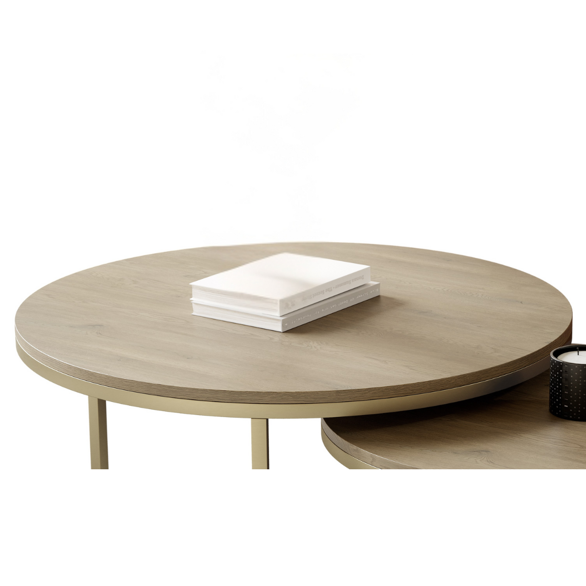 Zestaw stolików kawowych Yuo Duo Gold Cremona to połączenie naturalnej faktury drewna z subtelnym luksusem złotego detalu. Okrągłe blaty w dekorze dąb Cremona wprowadzają do wnętrza ciepło i przytulność, a delikatna, złota rama malowana proszkowo dodaje charakteru i lekkości formie. To duet, który pięknie wpisuje się w nowoczesne aranżacje, ale doskonale odnajdzie się również w stylu japandi, glamour czy minimalistycznym.