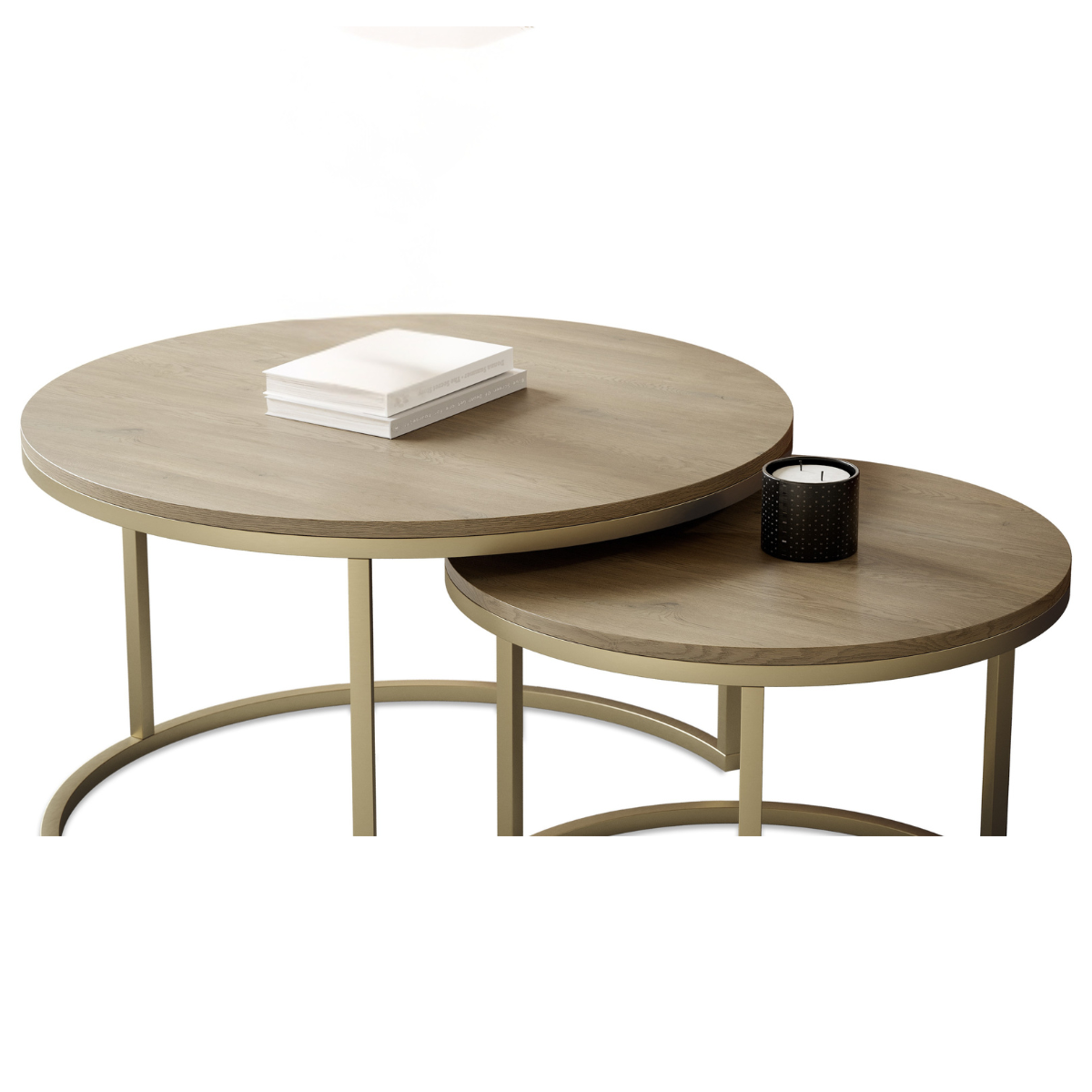 Zestaw stolików kawowych Yuo Duo Gold cremona łączy ciepły dekor dąb Cremona z elegancką, złotą ramą. Dwuczęściowy duet 80 cm i 60 cm tworzy luksusowy akcent we wnętrzu, idealny do nowoczesnych salonów i stylowych stref dziennych.