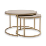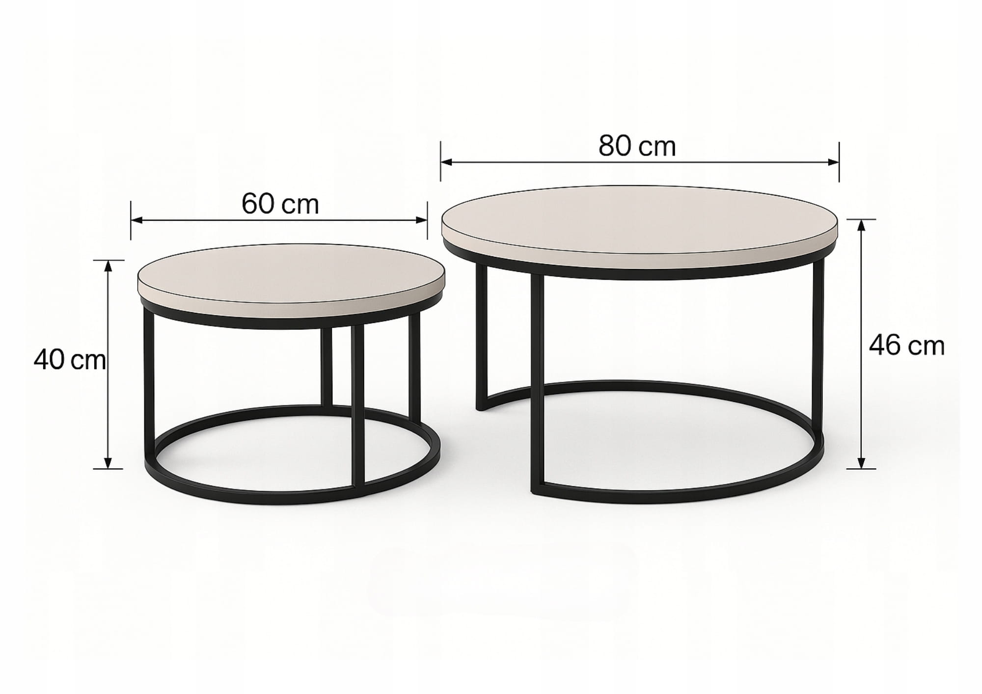 Blaty wykonano z trwałej płyty meblowej melaminowanej, a obrzeże ABS chroni je przed uszkodzeniami. Stabilne, metalowe stelaże malowane proszkowo w kolorze złota zapewniają solidność, a jednocześnie wprowadzają lekki, subtelny połysk do wnętrza. Różnica wysokości (46 i 40 cm) umożliwia wsunięcie jednego stolika pod drugi, co daje elastyczność i oszczędność miejsca.