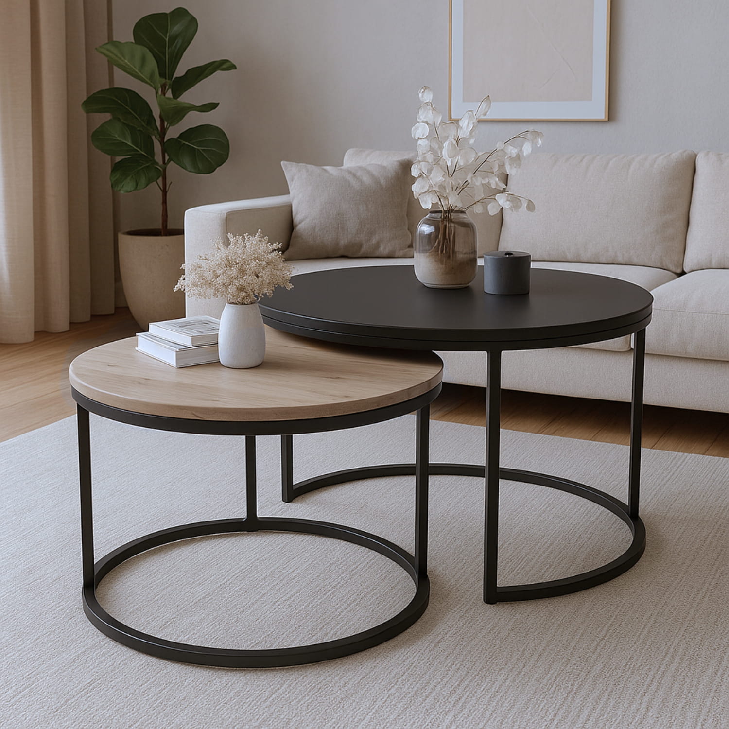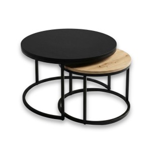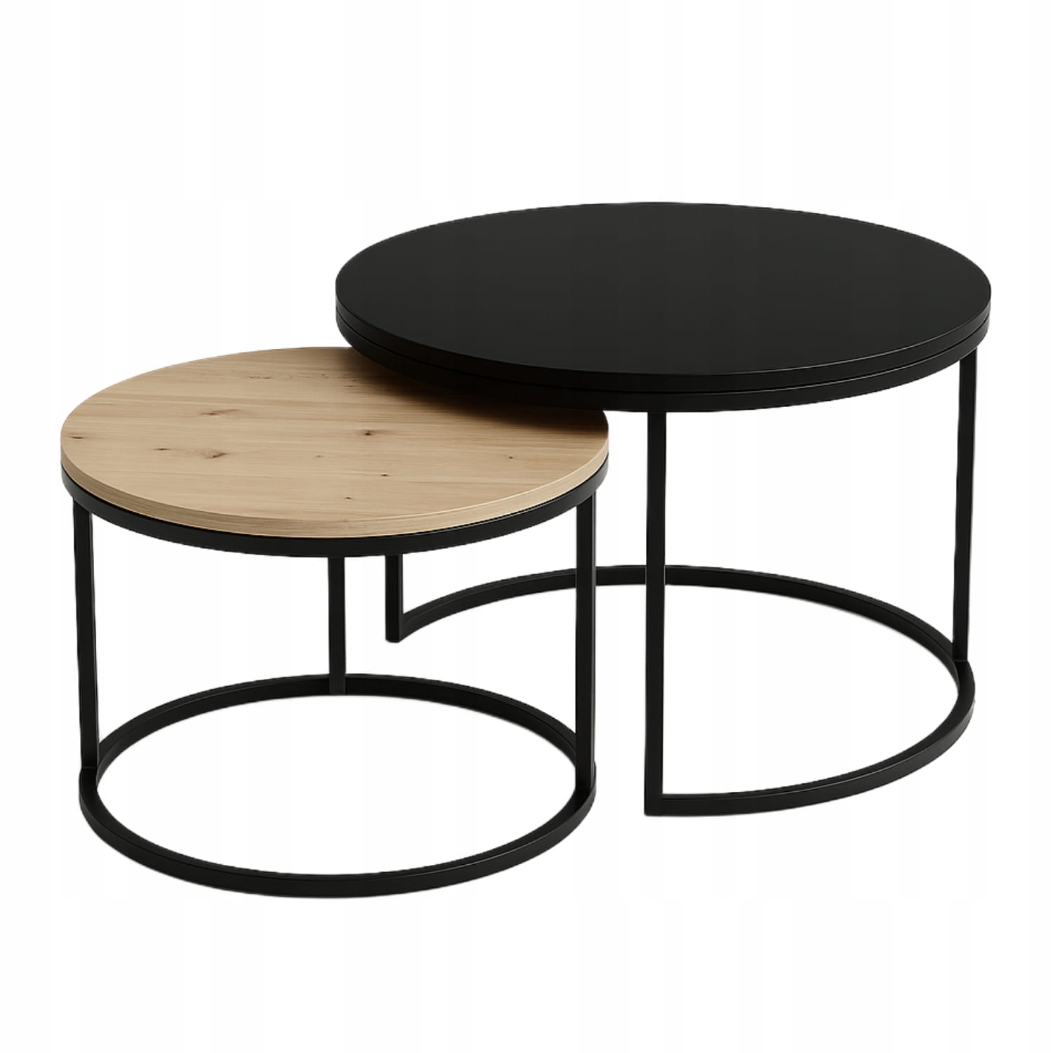 Zestaw stolików kawowych Yuo Duo Czarny / Dąb Artisan to stylowe połączenie kontrastów. Większy blat o średnicy 80 cm wykonano w jednolitej czerni, a mniejszy 60 cm w dekorze dąb artisan. Takie zestawienie barw dodaje wnętrzu charakteru i nowoczesnej elegancji.