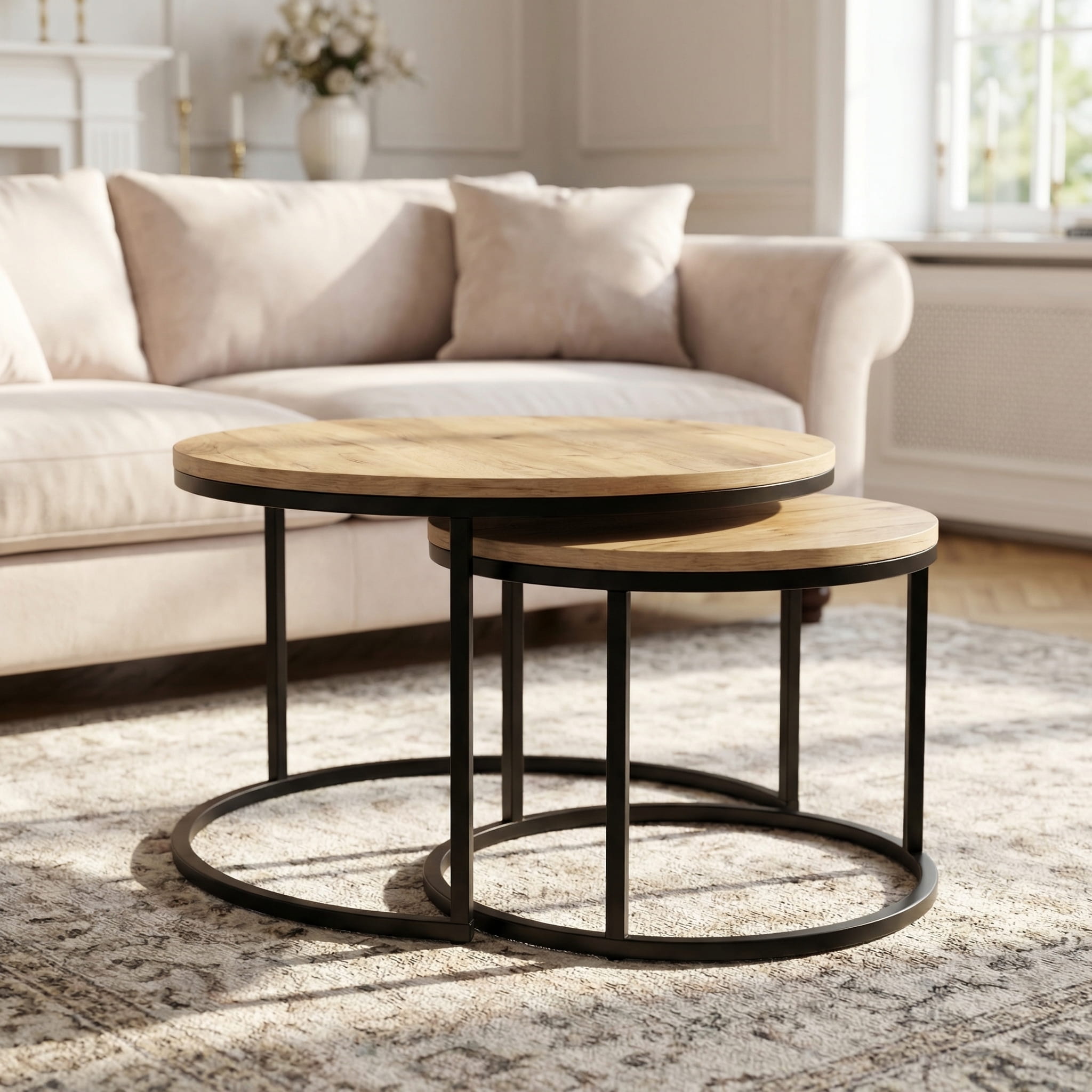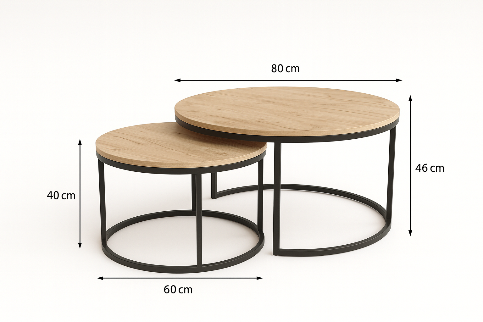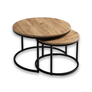 Zestaw stolików kawowych Yuo Duo Dąb Craft Złoty to połączenie naturalnego stylu i nowoczesnej funkcjonalności. Zestaw obejmuje dwa stoliki – większy o średnicy 80 cm i mniejszy o średnicy 60 cm. Różnica wysokości (46 i 40 cm) pozwala na swobodne ustawienie – razem, wsuwając mniejszy pod większy, lub osobno.