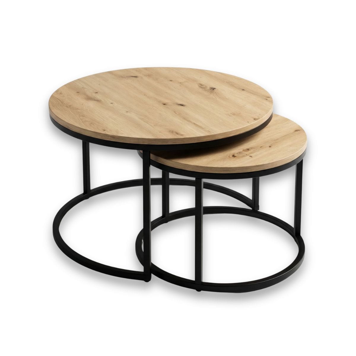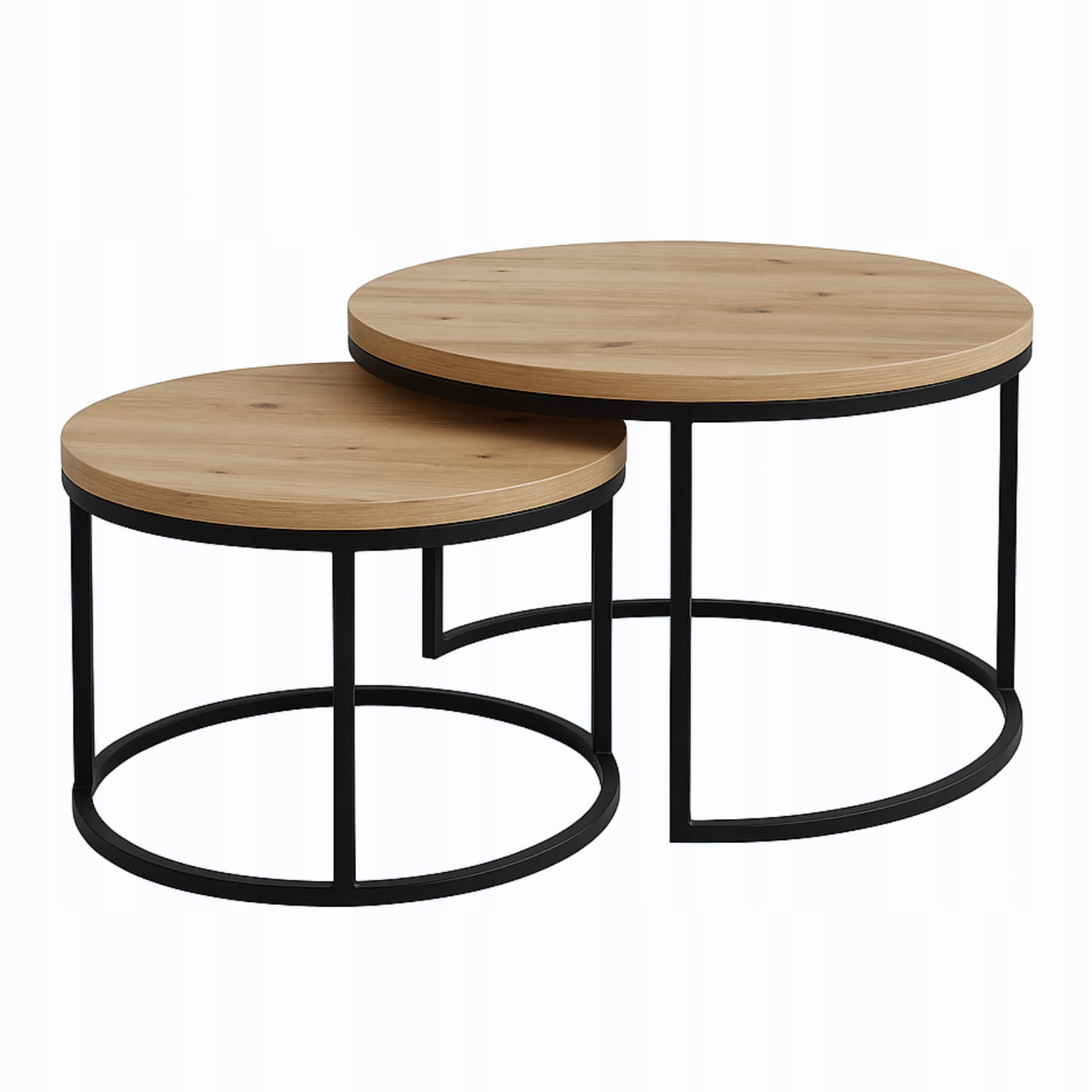 Zestaw stolików kawowych Yuo Duo Dąb Artisan to eleganckie połączenie ciepła drewna i funkcjonalności. Zestaw obejmuje dwa stoliki – większy o średnicy 80 cm i mniejszy o średnicy 60 cm. Dzięki różnicy wysokości (46 i 40 cm) można je ustawić razem, wsuwając mniejszy pod większy, lub rozdzielić, tworząc dwa niezależne meble.