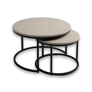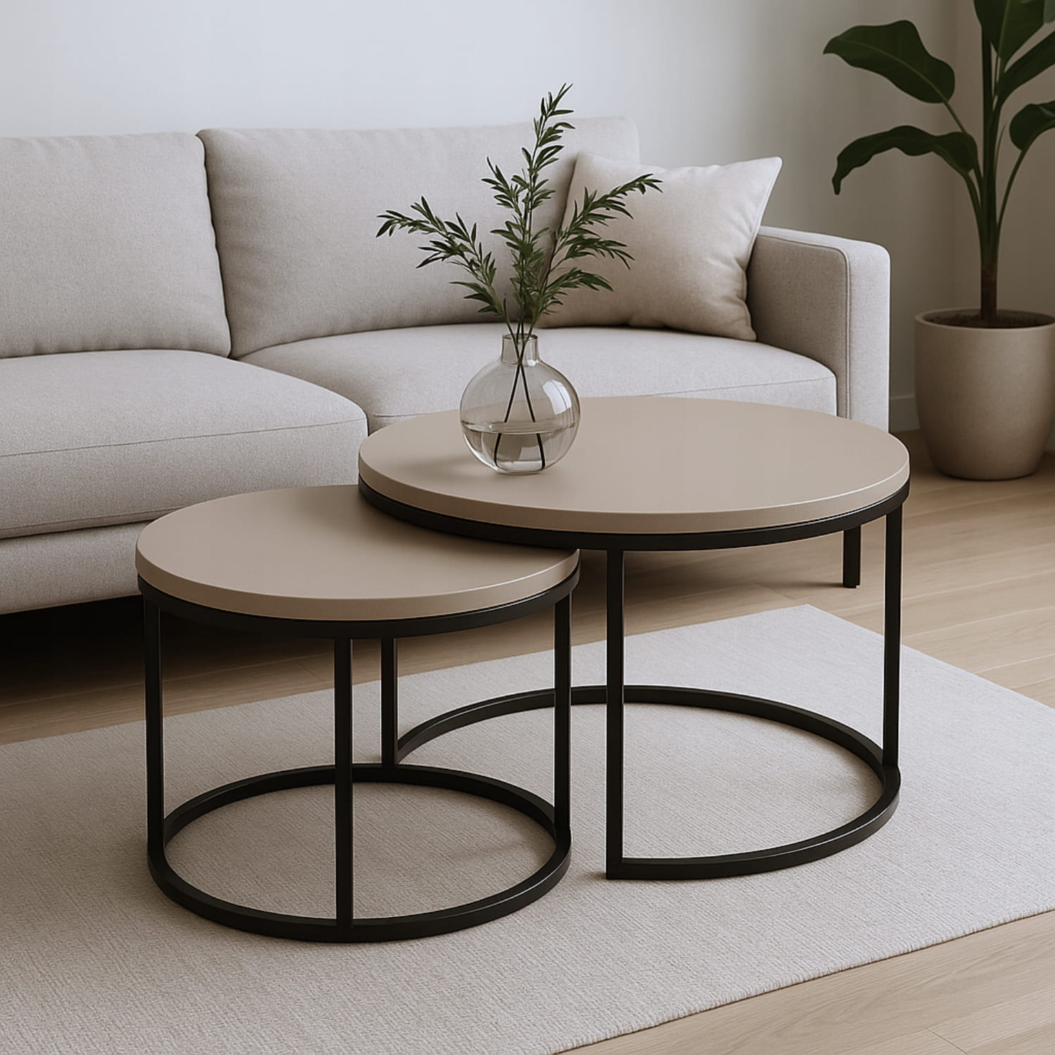Zestaw dwóch stolików Yuo Duo – okrągłe blaty w kolorze kaszmir i czarne stelaże. Eleganckie, nowoczesne i praktyczne rozwiązanie do salonu.