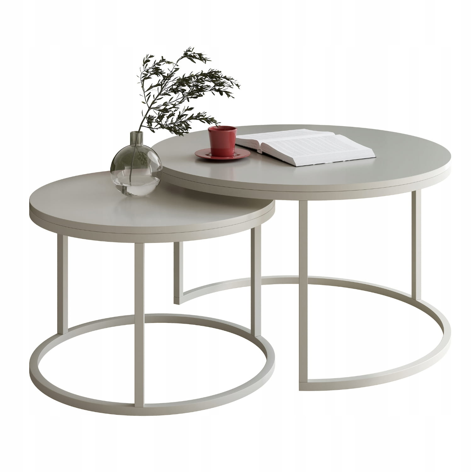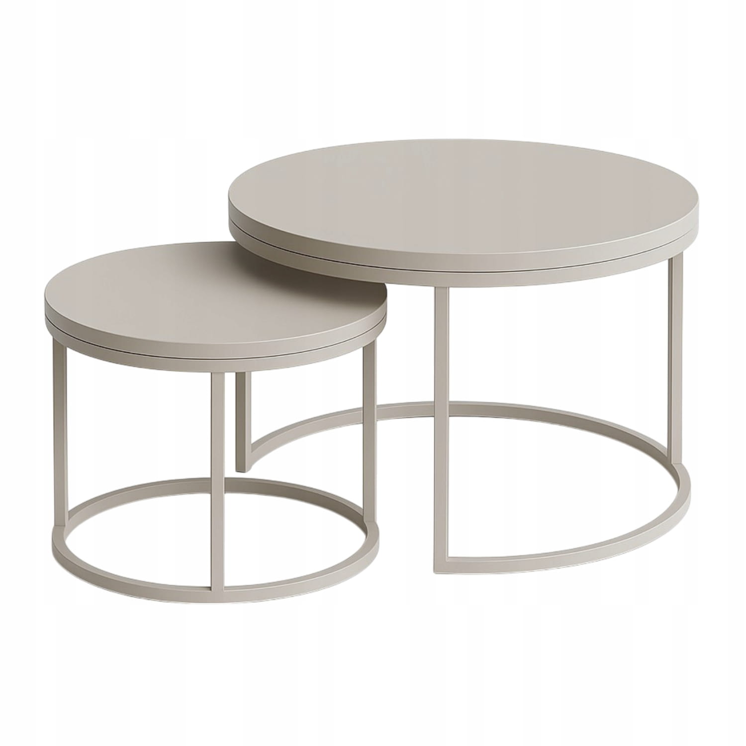 Blaty wykonano z płyty meblowej melaminowanej w dekorze kaszmir, a obrzeże ABS zapewnia trwałość i estetyczne wykończenie. Rama ze stali malowanej proszkowo w tym samym kolorze dodaje całości spójności i harmonii. Zestaw dzięki różnicy wysokości (46 i 40 cm) można łatwo wsunąć jeden pod drugi, co zwiększa funkcjonalność i pozwala oszczędzić przestrzeń.