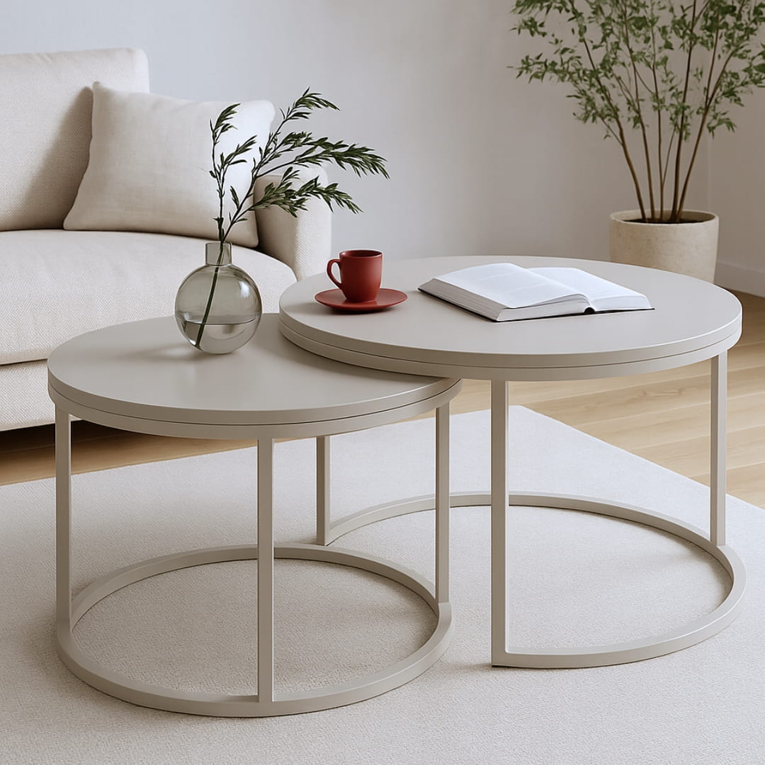 Stolik kawowy Yuo Iro to wyjątkowy zestaw dwóch okrągłych stolików utrzymanych w jednolitej kolorystyce kaszmiru. Dzięki spójności barwy blatów i ramy mebel prezentuje się subtelnie, a jednocześnie wyróżnia się nowoczesnym designem. Większy stolik o średnicy 80 cm i mniejszy o średnicy 60 cm można ustawić razem jako centralny punkt salonu lub rozdzielić i wykorzystać w różnych częściach wnętrza.