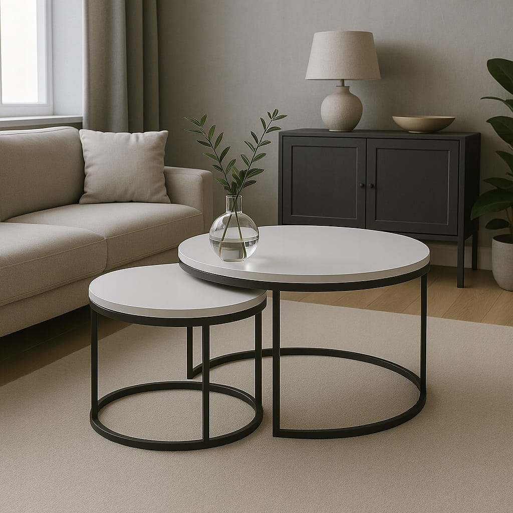 Yuo Sui Biały – zestaw dwóch stolików w lekkiej, jasnej kolorystyce. Idealne miejsce na kawę, dekoracje i wspólne chwile w przytulnym salonie.