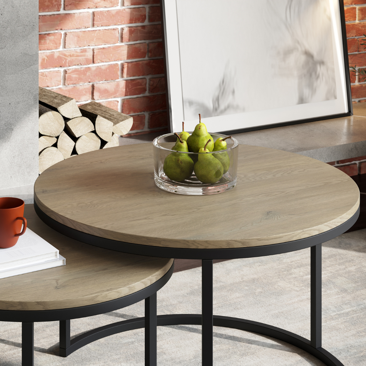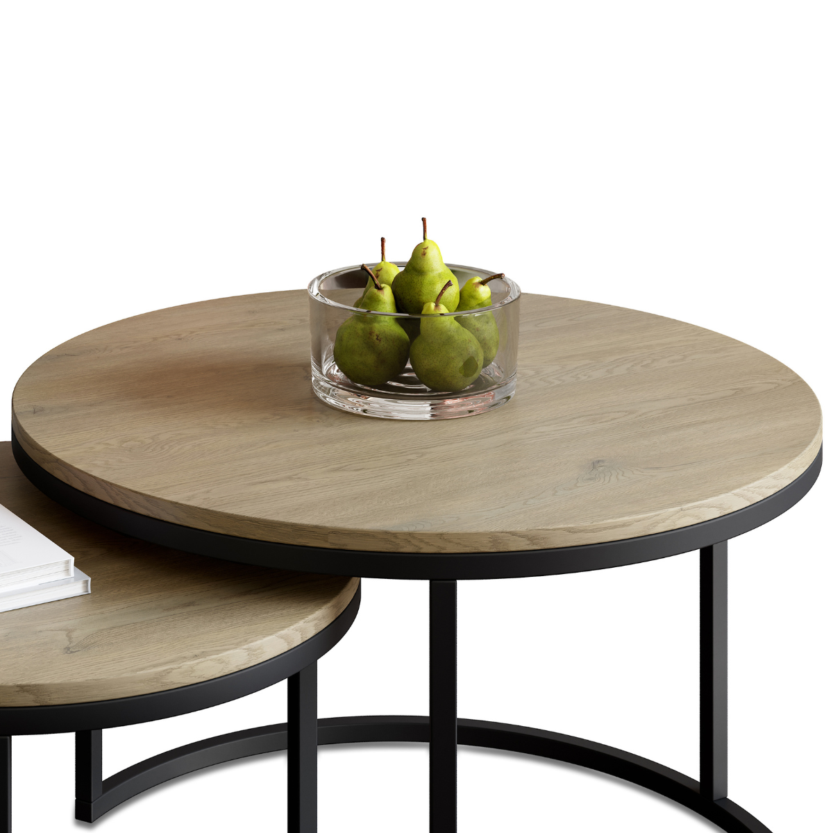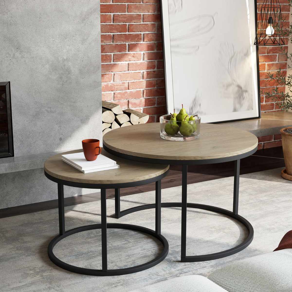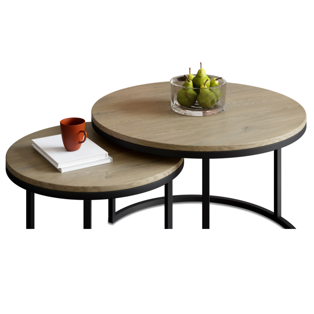 Blaty wykonano z laminowanej płyty meblowej w dekorze dąb Cremona, która łączy naturalny wygląd z trwałością i łatwością pielęgnacji. Okrągłe kształty oraz proporcje stolików sprzyjają tworzeniu przyjaznej, otwartej przestrzeni, a ich uniwersalna estetyka pasuje do wnętrz nowoczesnych, minimalistycznych, japandi czy skandynawskich.